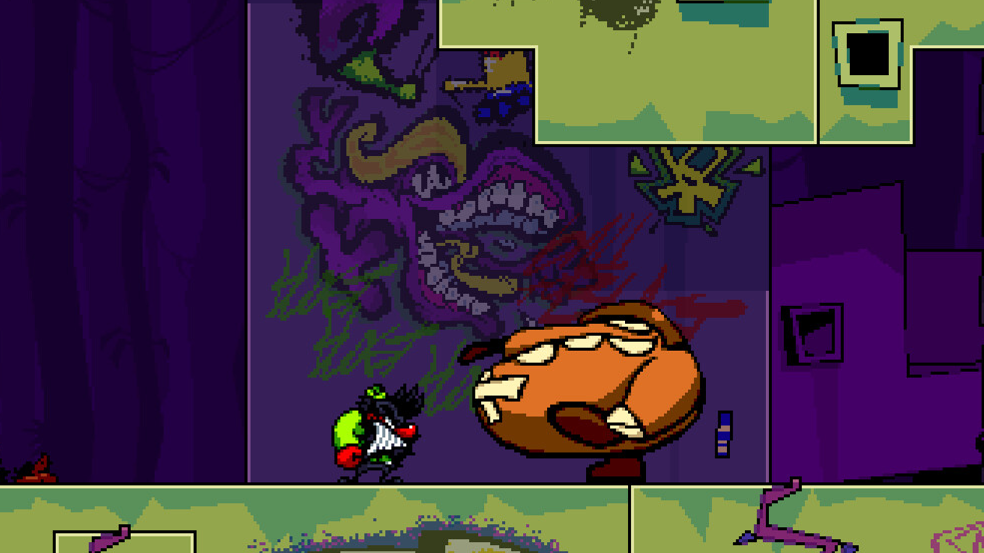 Antonblast быстро знакомит вас с забавным вступлением, объясняющим сюжет, а затем бросает в первый уровень с полезными советами по ходу игры. Основная механика — ‘Clutch dash’ Антона, где вы ускоряетесь и набираете импульс, нажимая кнопки в такт с индикатором. Этот рывок является центральным как для бега и прыжков, так и для сражений — вы можете использовать его, чтобы отскакивать от врагов и подбрасывать себя вверх.