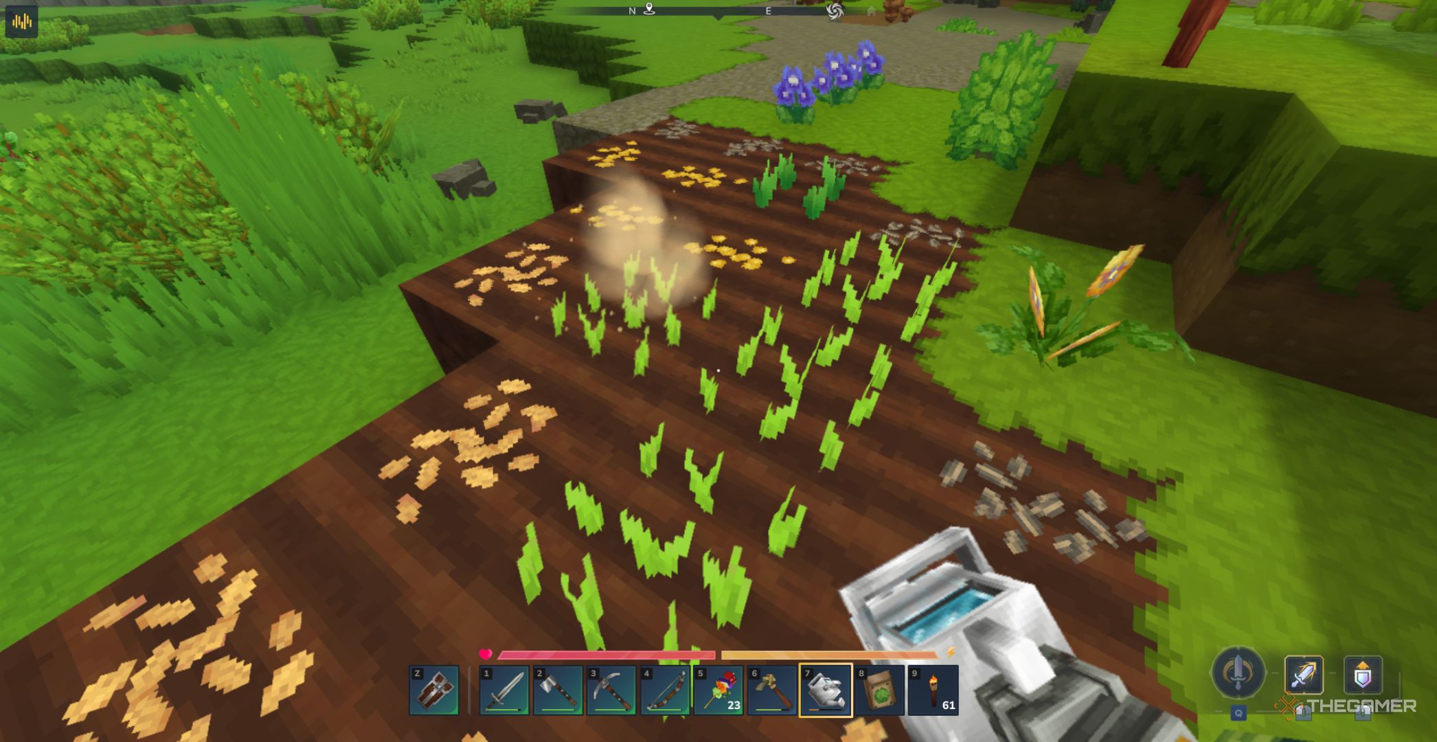 Отправляйтесь к Столу фермера и создайте Лейку и Грубый мотыгу. Если вы не нашли семена в сундуках, используйте любую Эссенцию жизни, которая у вас есть, чтобы создать Мешки с семенами Пшеницы и Салата, используя раздел Семена стола.