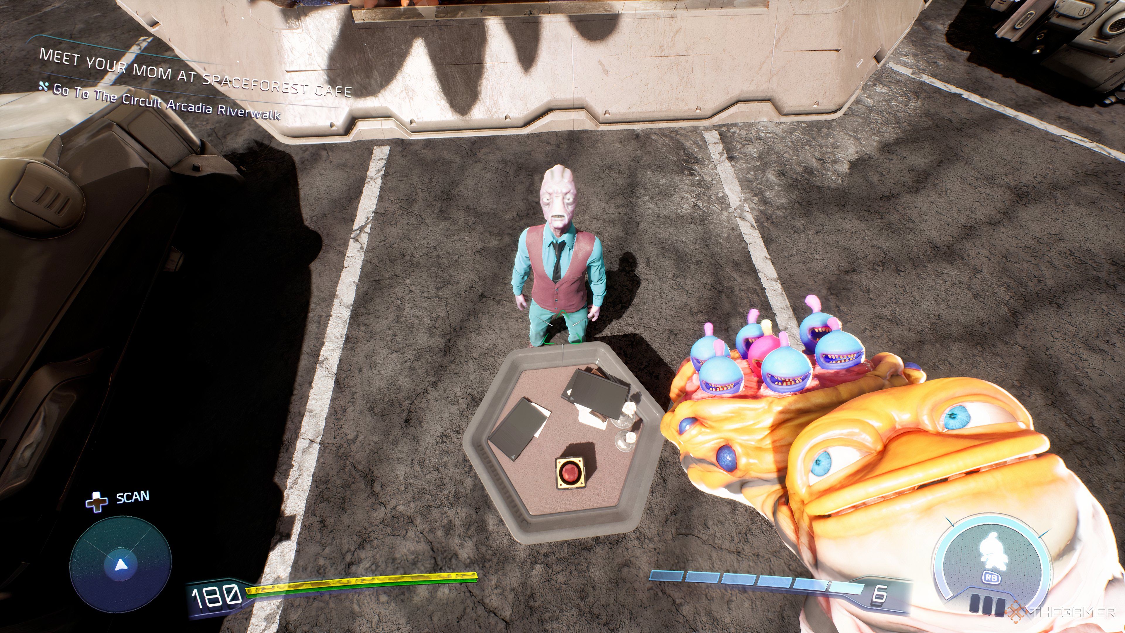 Если вы исследуете местность, поищите пальмы к северу от Circuit Arcadia Mall. Вы найдете подозрительного инопланетянина возле стола со свечами, книгами и коробкой, на которой есть красная кнопка.