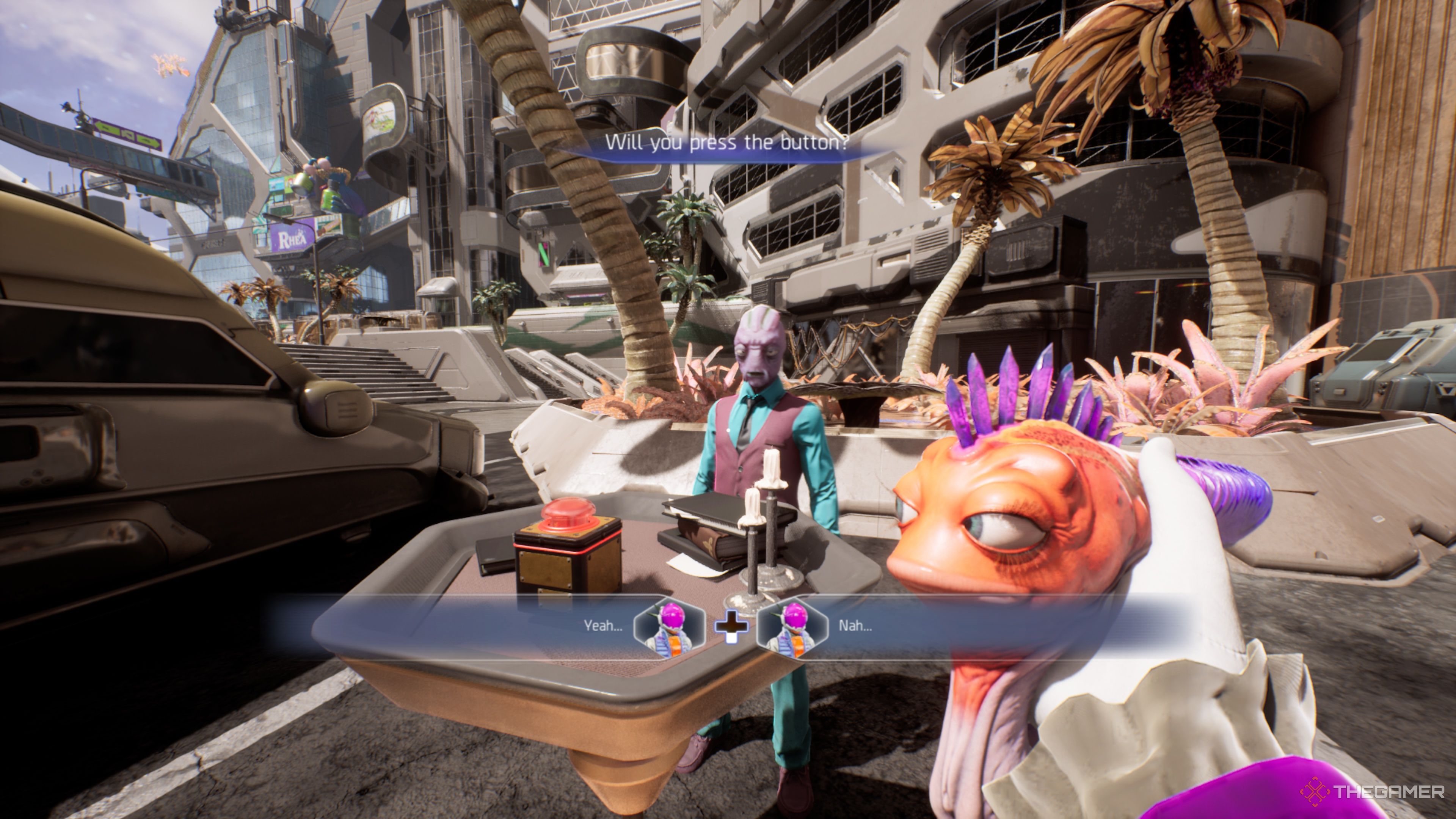 Если вы исследуете местность, поищите пальмы к северу от Circuit Arcadia Mall. Вы найдете подозрительного инопланетянина возле стола со свечами, книгами и коробкой, на которой есть красная кнопка.