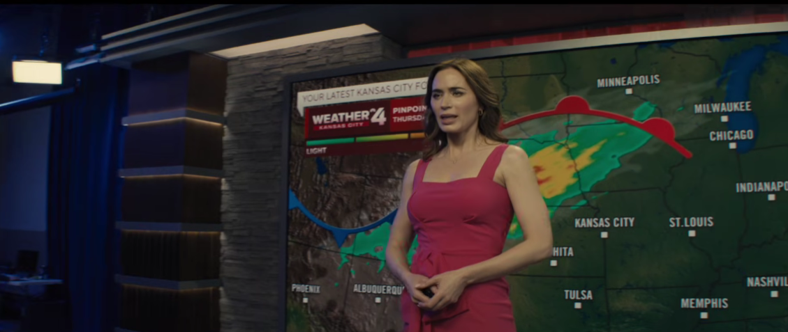 - Эмили Блант в роли телеведущей прогноза погоды из Канзас-Сити