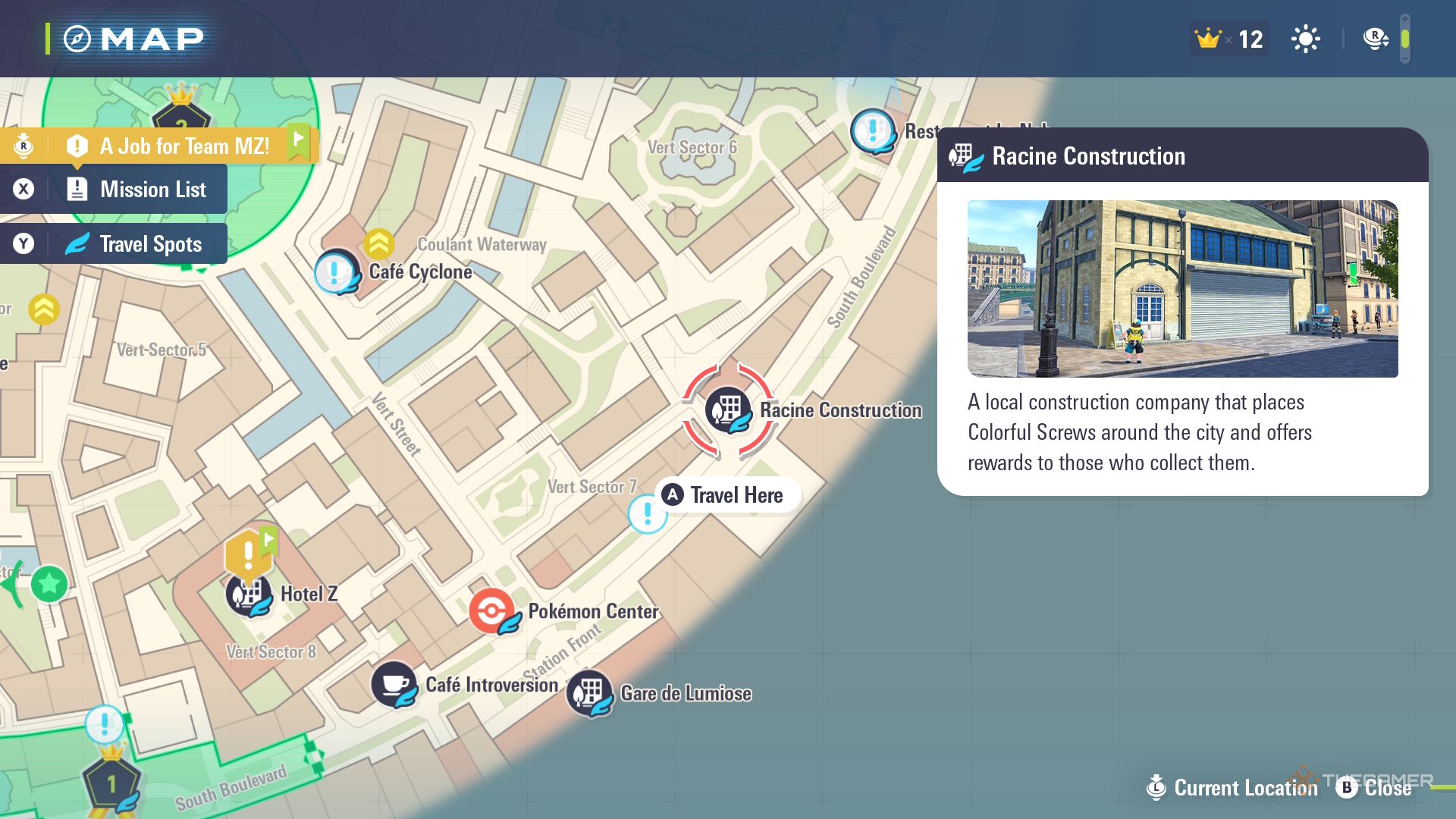 Racine Construction находится на южной оконечности Саут-Бульвара, прямо на окраине Lumiose City. После первого посещения вы сможете быстро добираться туда, используя быстрое перемещение.