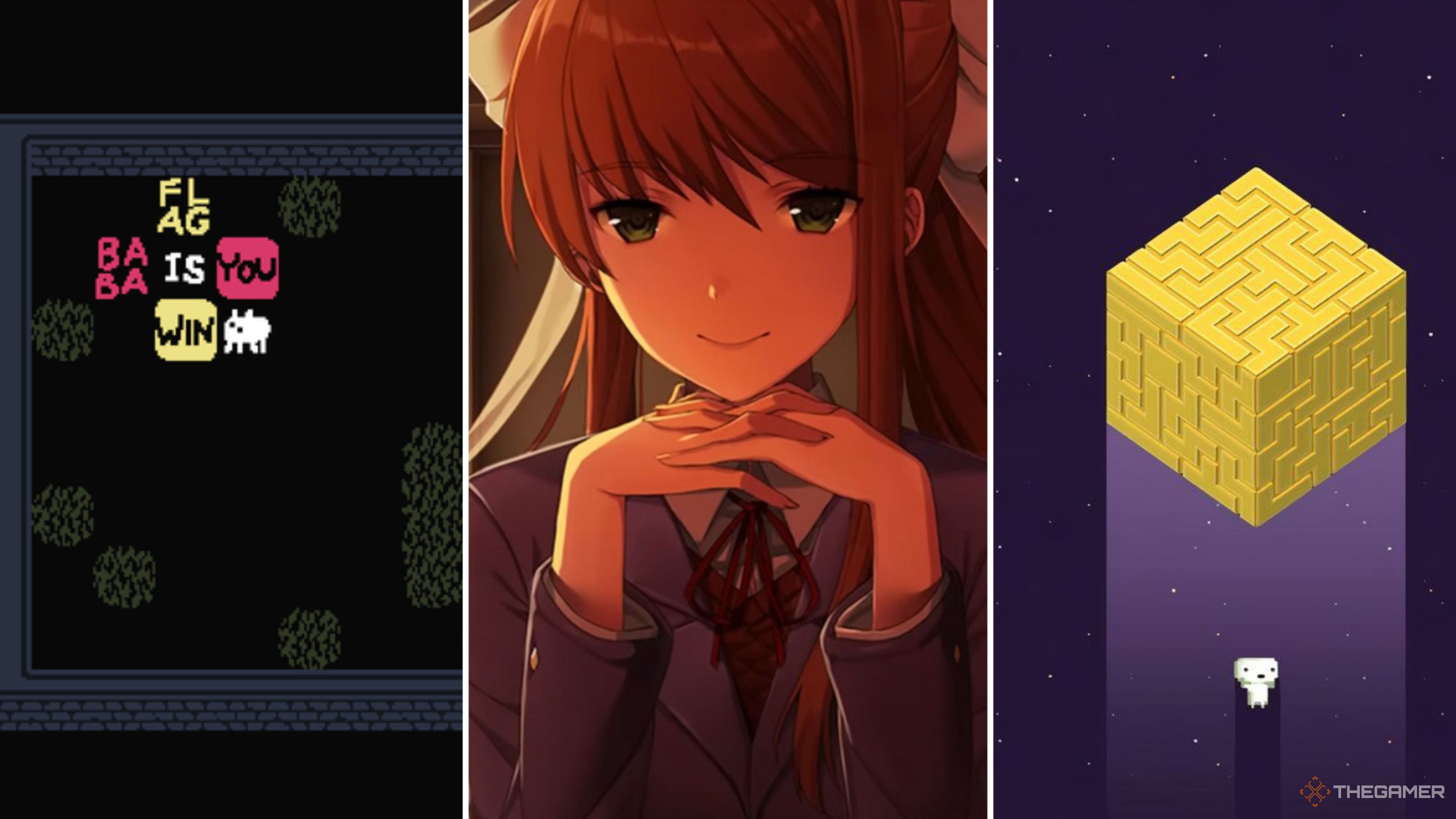 Doki Doki Literature Club начинается как типичная милая аниме-игра-симулятор свиданий. Примерно в течение первого часа это очень убедительно! Но затем события принимают действительно неожиданный и тревожный оборот – о котором я не буду рассказывать. Скажем просто, что в конечном итоге вы оказываетесь в ловушке с персонажем Моникой, которая осознала, что находится в игре. Она удалила других персонажей из файлов и, кажется, полна решимости смотреть вам в глаза вечно.
