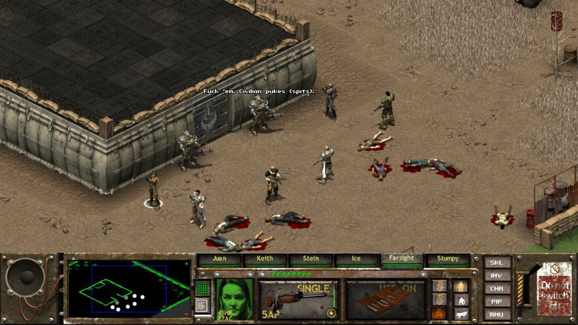 Fallout 2 предложил огромное количество занятий, хотя основной геймплей не сильно изменился по сравнению с первой игрой – в основном он добавил новый контент поверх оригинала. Несмотря на это, игра была невероятно увлекательной, и изменение тона фактически создало преданную фанбазу, которая до сих пор предпочитает юмористический подход к Fallout. Однако игра могла быть и по-настоящему серьезной и не уклонялась от демонстрации последствий ваших выборов. Например, если вы импульсивно сделаете татуировку ‘работорговца’ на лице, вы серьезно ограничите свое взаимодействие с важными персонажами и фактически замедлите свой прогресс.