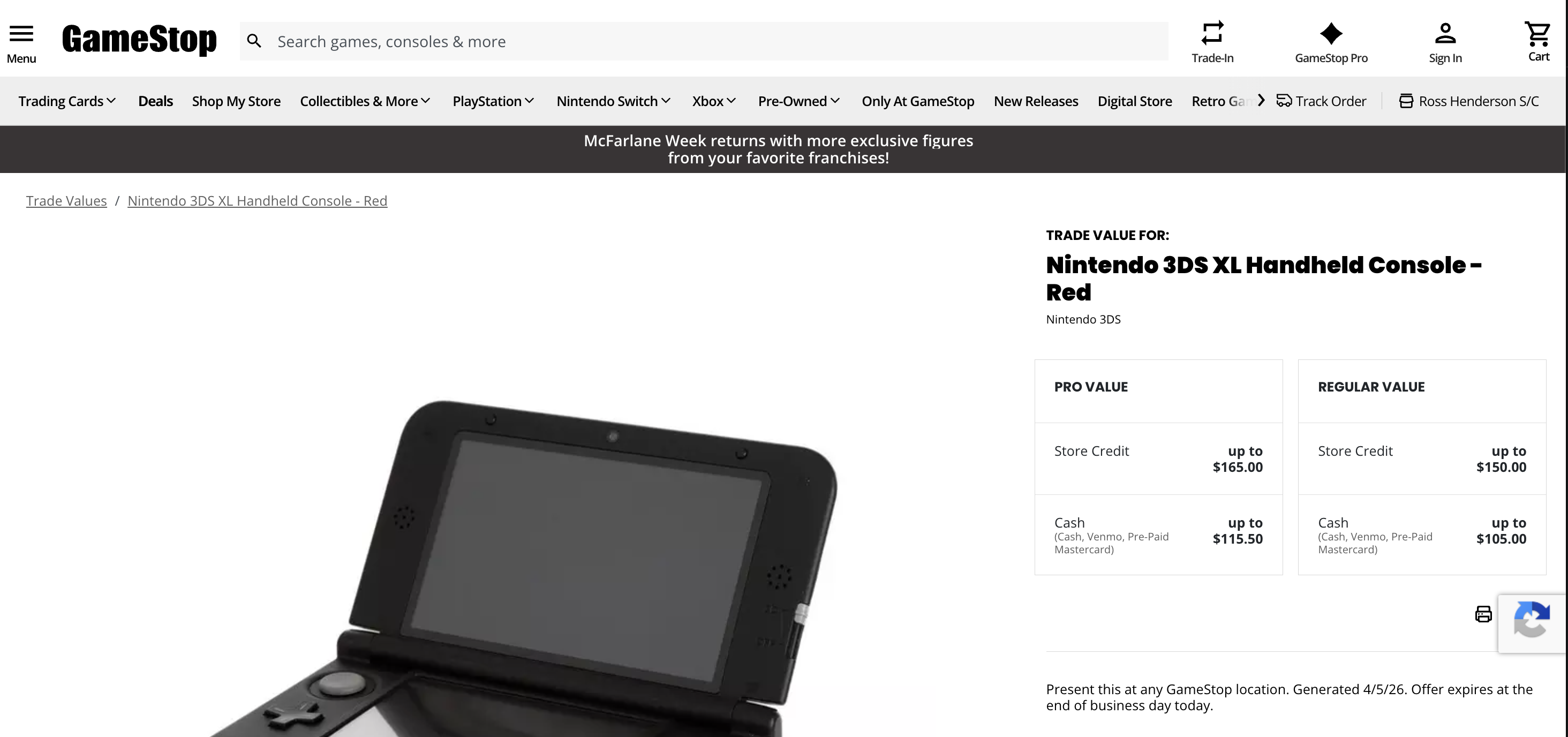 Если вы являетесь участником программы GameStop Pro, вы можете получить до 165 долларов в виде кредита в магазине или 115 долларов наличными при обмене вашего New Nintendo 3DS XL. Участники, не входящие в программу, могут получить до 150 долларов в виде кредита в магазине или 105 долларов наличными.