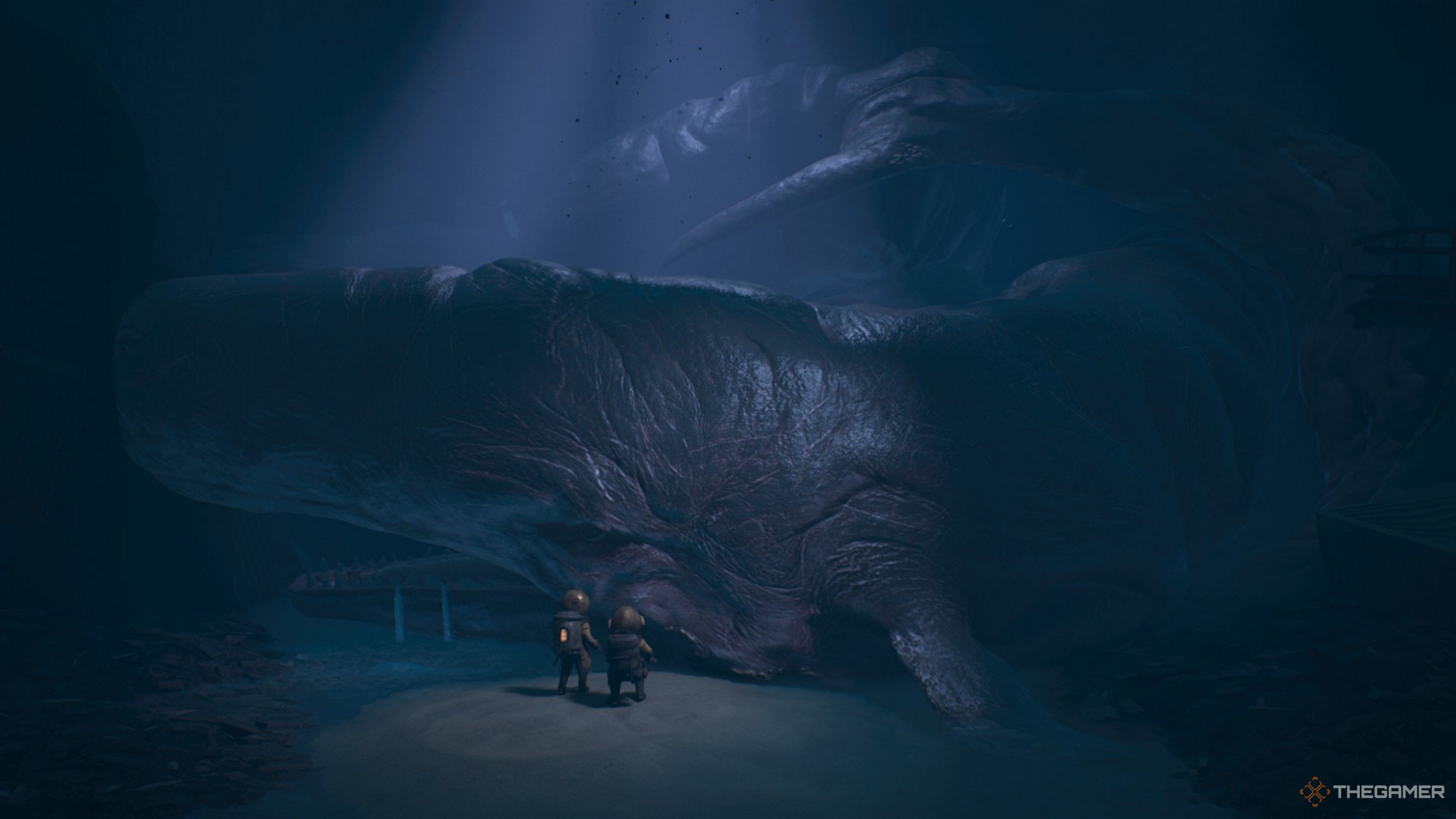 Вы обнаружите кита, потерявшего глаз, который преграждает вам путь вперед. Чтобы начать решать проблему, поднимите девочку на низкую стену слева от кита. Это вернет вас в комнату над колесом, которое изначально открыло дверь.