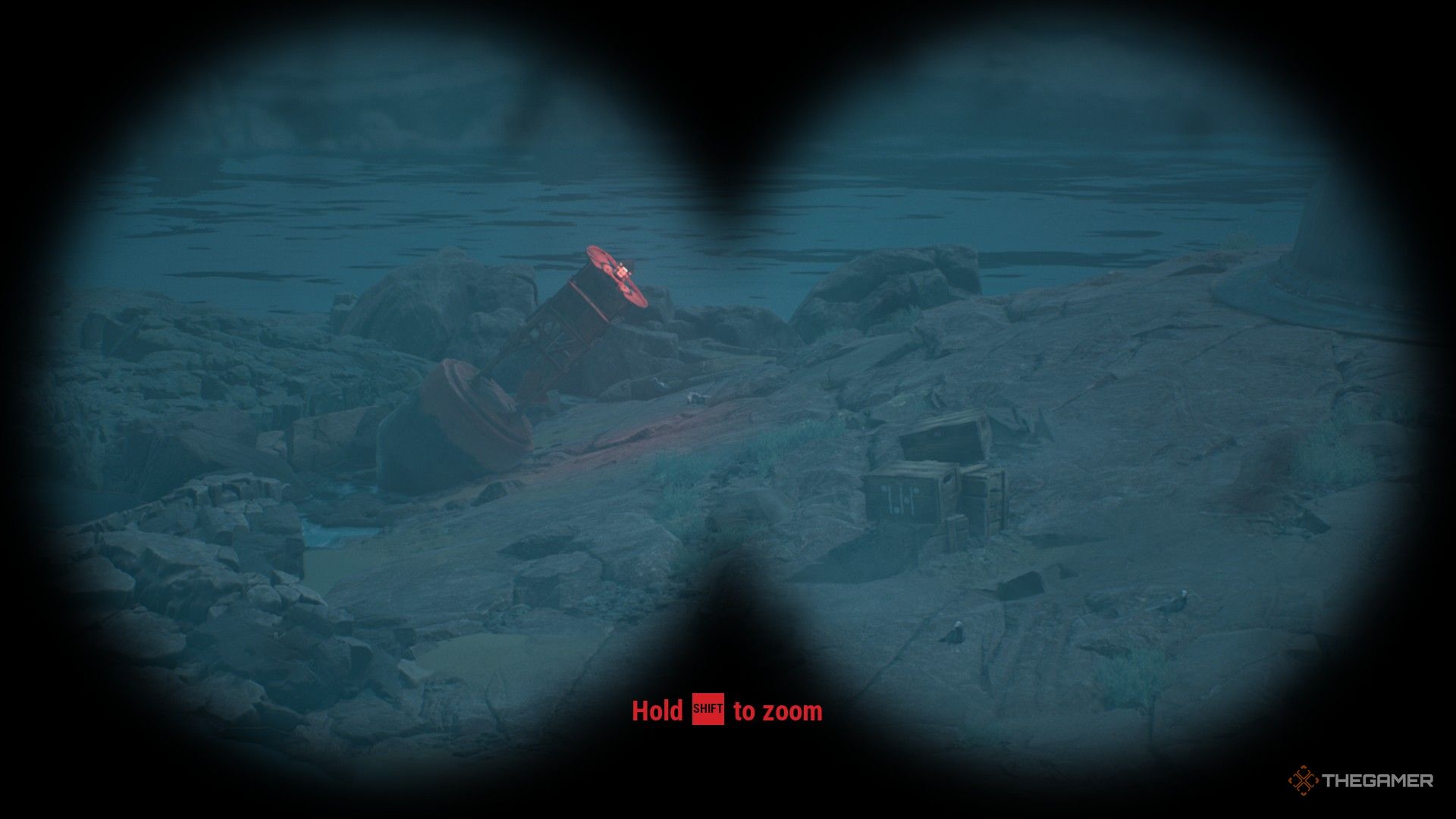 Вернитесь внутрь и используйте бинокль справа, чтобы посмотреть на пушку. Вы заметите несколько ящиков, встроенных в скалы вокруг неё, и они следуют определённому шаблону: