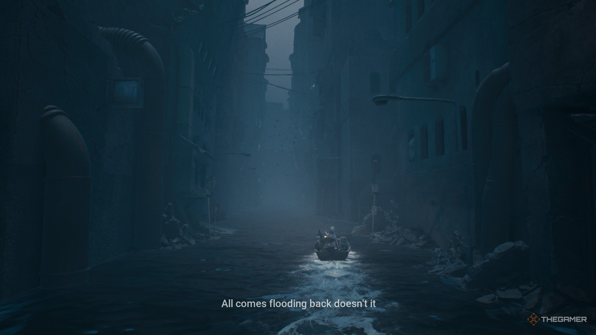 Когда будете готовы, продолжайте плыть по затопленному туннелю, избегая любых транспортных средств, пока не достигнете выхода. Вас вознаградит захватывающий вид на руины разрушенного района. Продолжайте движение по узким каналам, прислушиваясь к звукам играющих детей, пока не найдете место, чтобы пришвартовать свою лодку в том, что выглядит как облицованный плиткой коридор.