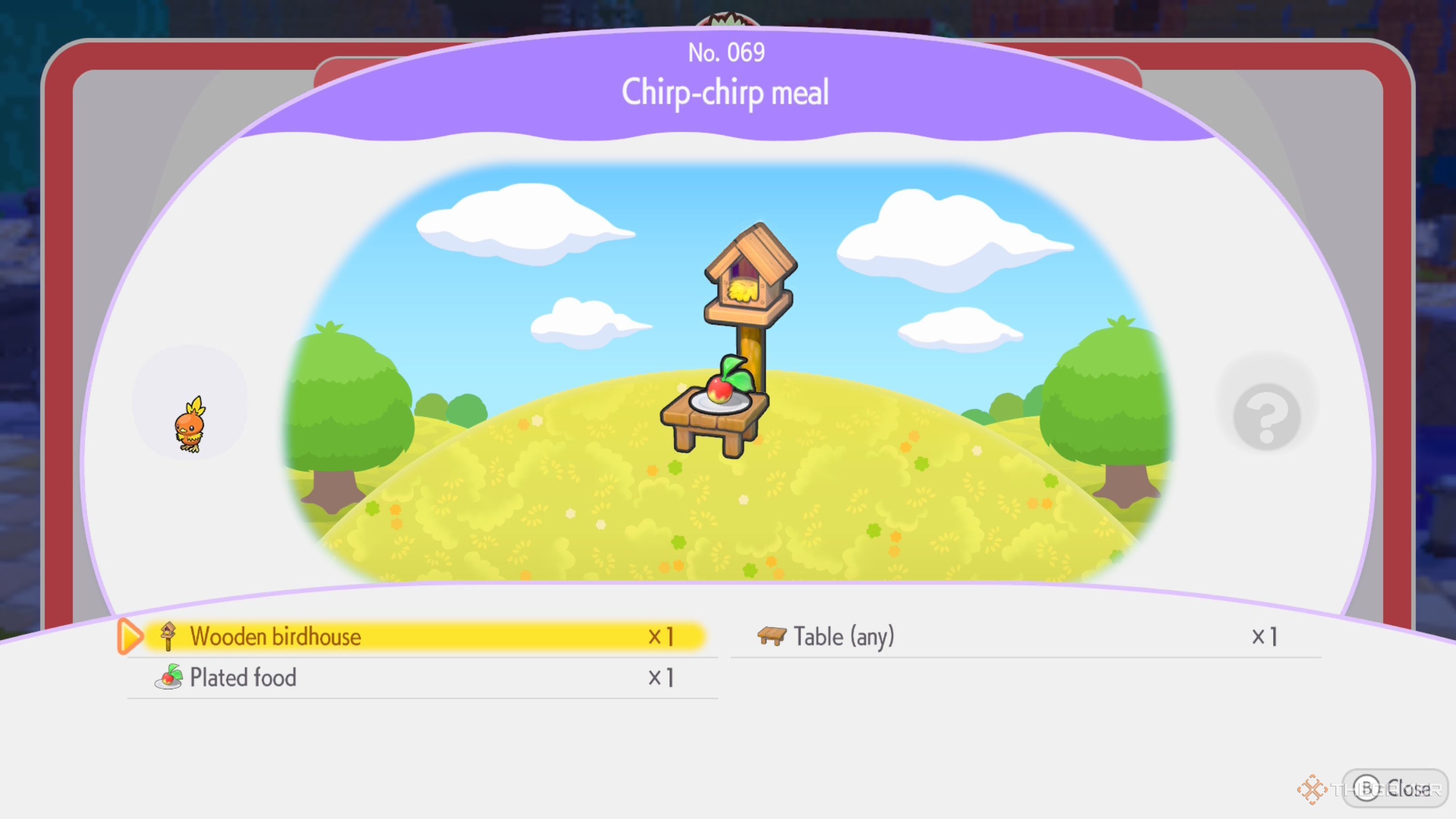 Окей, так что обустройство среды обитания для Торчика на самом деле довольно просто! Это называется «Чирикающий обед», и вам понадобится Деревянная пташиная будка, Стол и немного Блюд. Хорошая новость в том, что если вы пройдете за Центром покемонов на правой стороне, вы уже найдете пташиную будку и стол, полностью готовые. Вам просто нужно обеспечить еду!