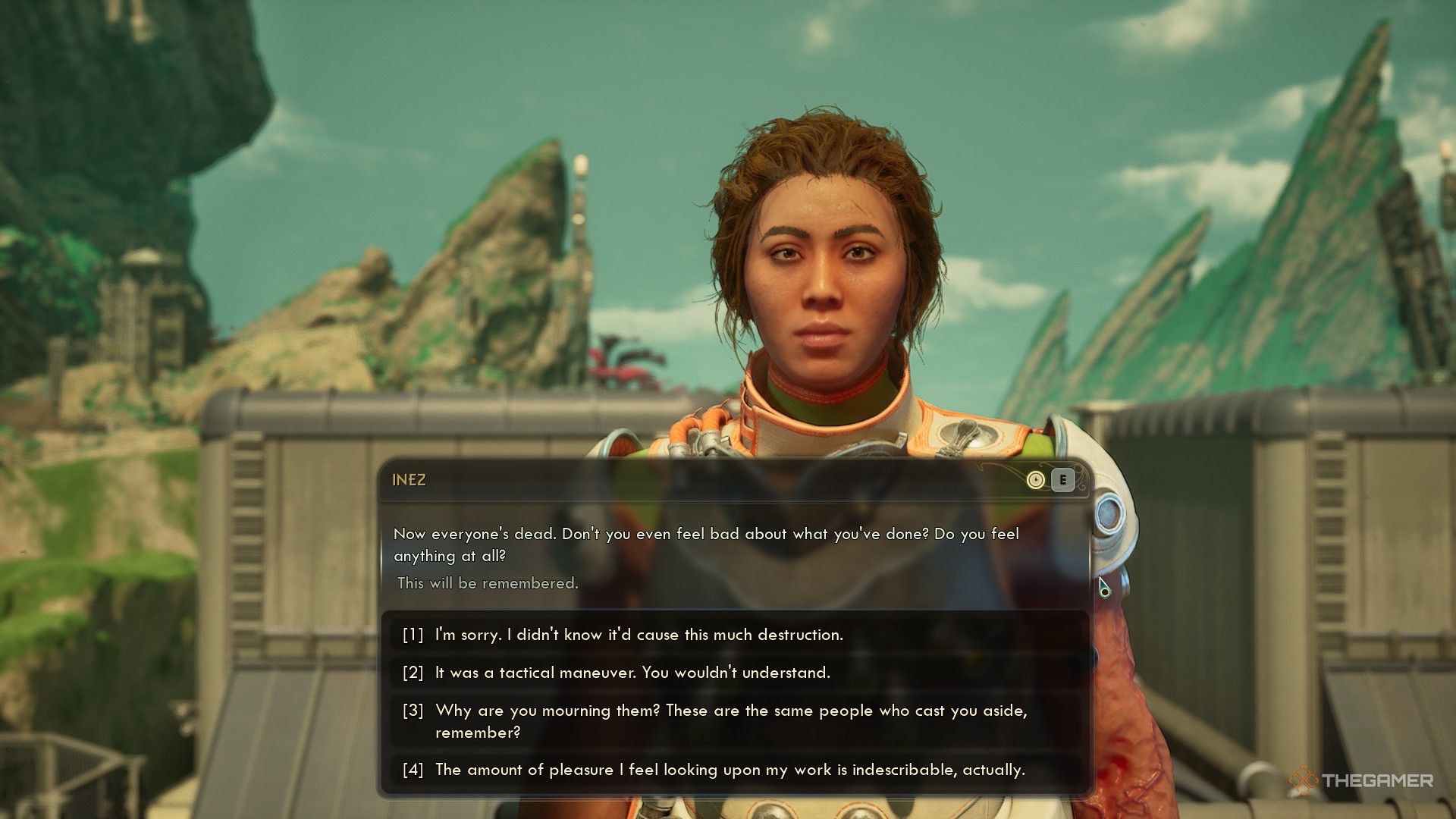 Окей, так что этот персонаж не слишком снисходителен, особенно когда ты сталкиваешься с первым серьезным сложным выбором в игре. Речь идет о том, что ты делаешь со станцией Vox Relay – цель состоит в том, чтобы вывести ее на орбиту. Но если я провалю проверки навыков, меня практически заставят разбить ее либо на Фэрфилд, либо на Вестпорт. Это сложное решение, и она не будет довольна этим!