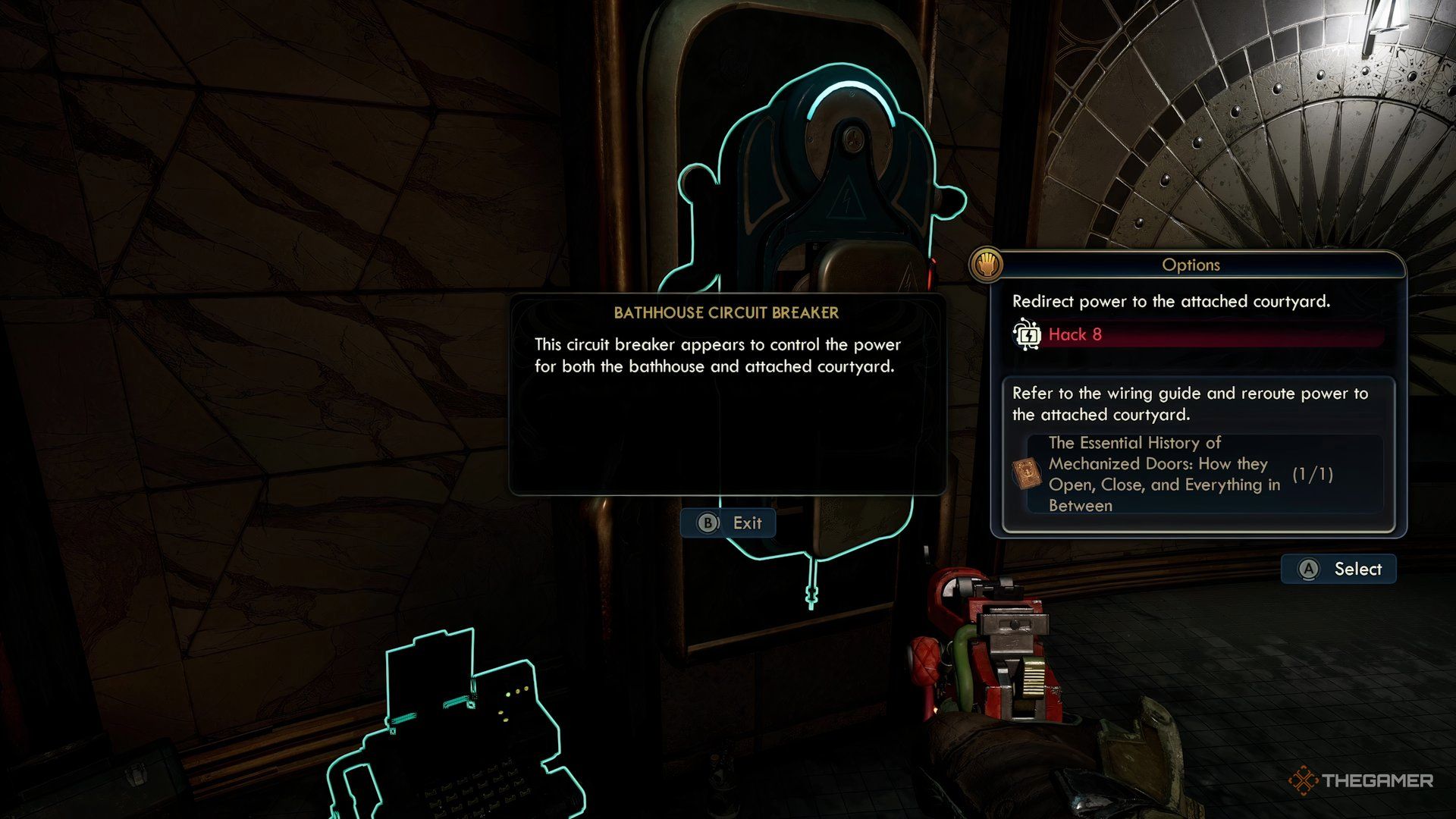 Чтобы продолжить квесты ‘Imprisoned by Riddles of Reality’ и ‘On the Trail of the Traitor’, вам нужно открыть большую механизированную дверь – но её замок сломан. Используйте N-Ray Scanner, чтобы проследить кабель до Bathhouse Circuit Breaker и починить его. Это позволит вам открыть дверь.