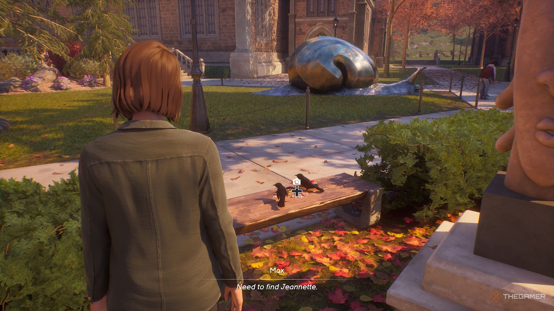 Во время урока фотографии вы найдете ворон, сидящих на скамейке на травяной площадке в центре кампуса. Это то же место, где находится Жаннетт, а скамейка находится прямо рядом с скульптурой лица и недалеко от большой скульптуры улитки. Пожалуйста, сделайте фотографию ворон.