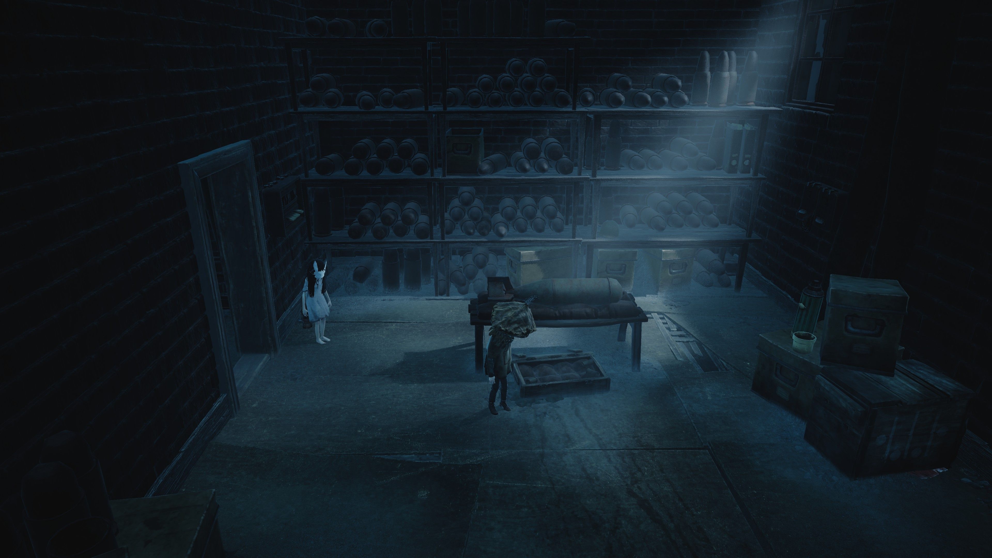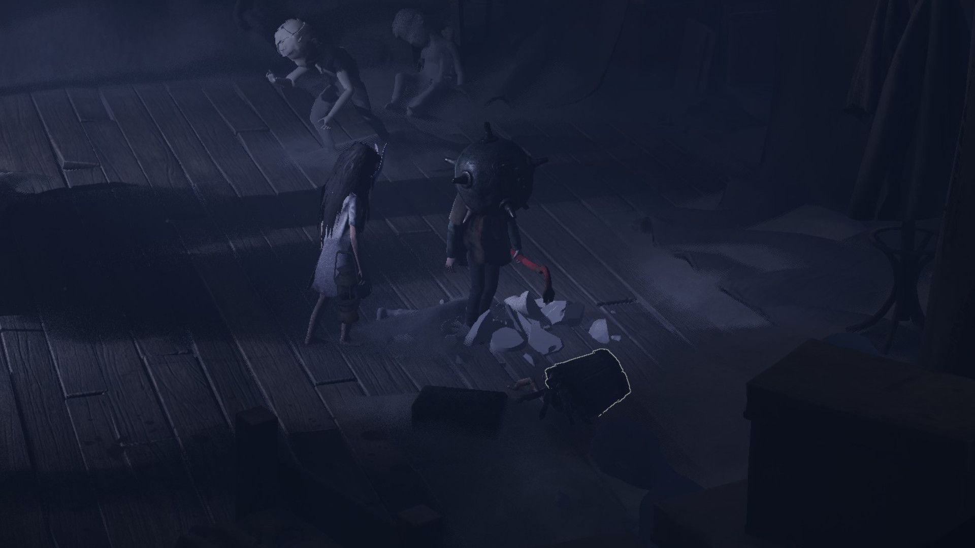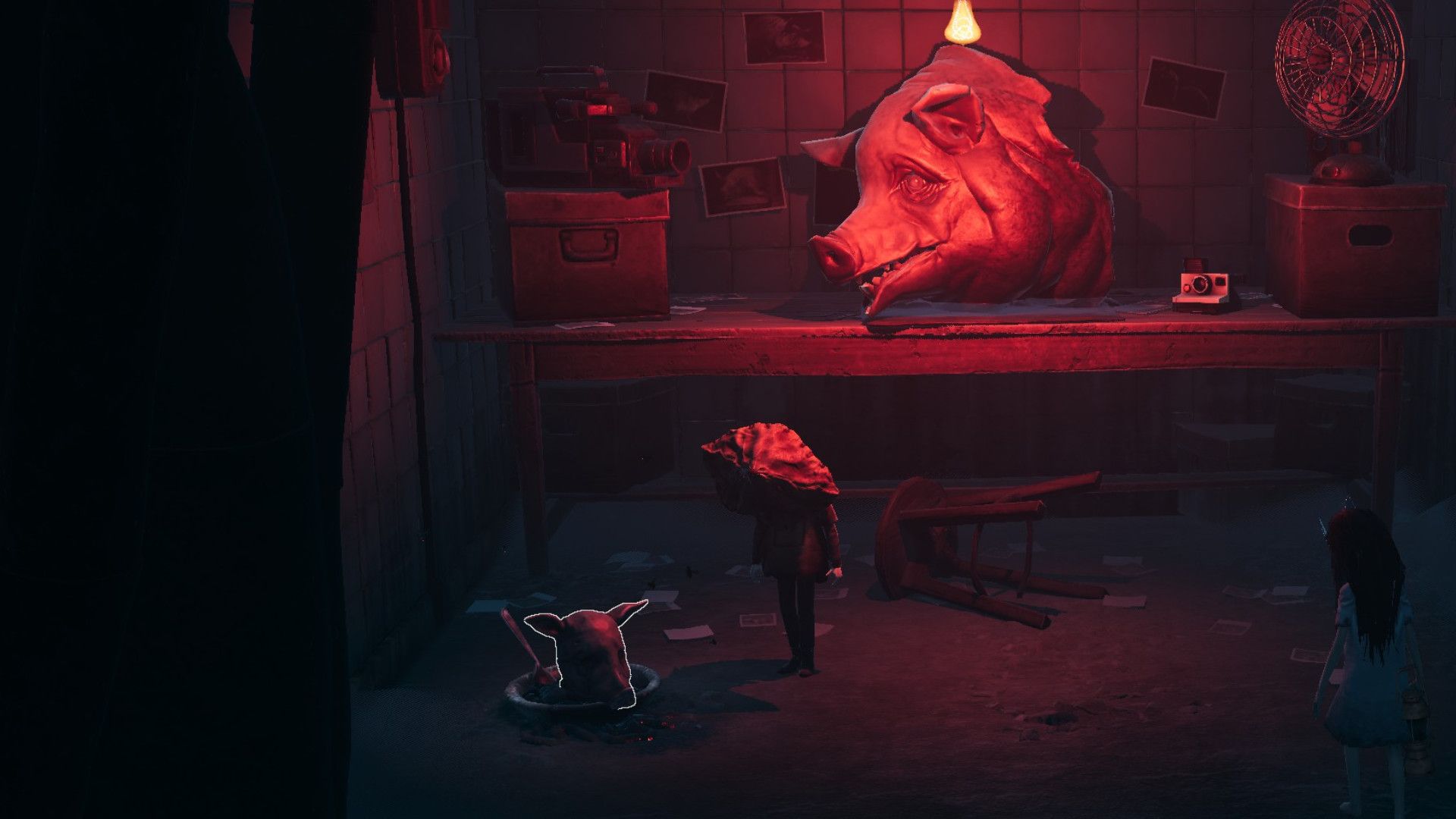 Чтобы продвинуться вперед, вам нужно разбить окно, используя одну из голов манекена. Но сначала, обогните стойку и проползите через отверстие в стене. Вы найдете маску свиньи на подносе рядом со столом, на котором установлена большая голова свиньи.