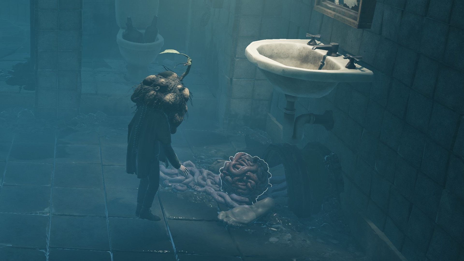 Окей, я нашёл эти шкафчики, и один из них начинает запотевать. Выглядит странно, но вы на самом деле можете пройти сквозь него – он ведёт в ванную! И послушайте, под раковиной я нашёл очень мягкую Маску Мозга. Серьёзно, это немного мерзко, но я всё равно её взял.