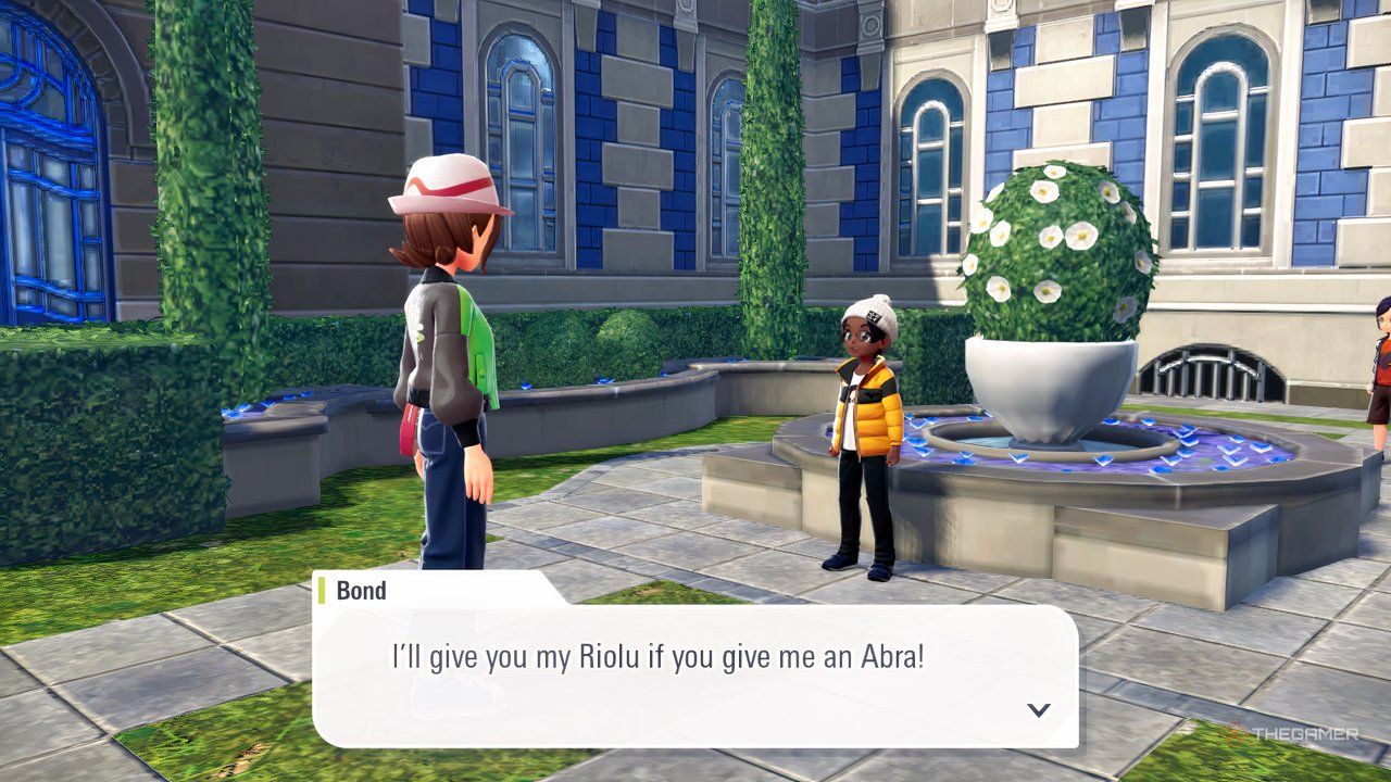 Отправляйтесь во двор и посмотрите налево, чтобы найти студента по имени Бонд, который носит белую шапку-бини. Он предложит обменять своего Риолу, который 25 уровня и имеет склонность «Неуклюжий». Этот Риолу может стать сильным Покемоном боевого типа на протяжении большей части игры.