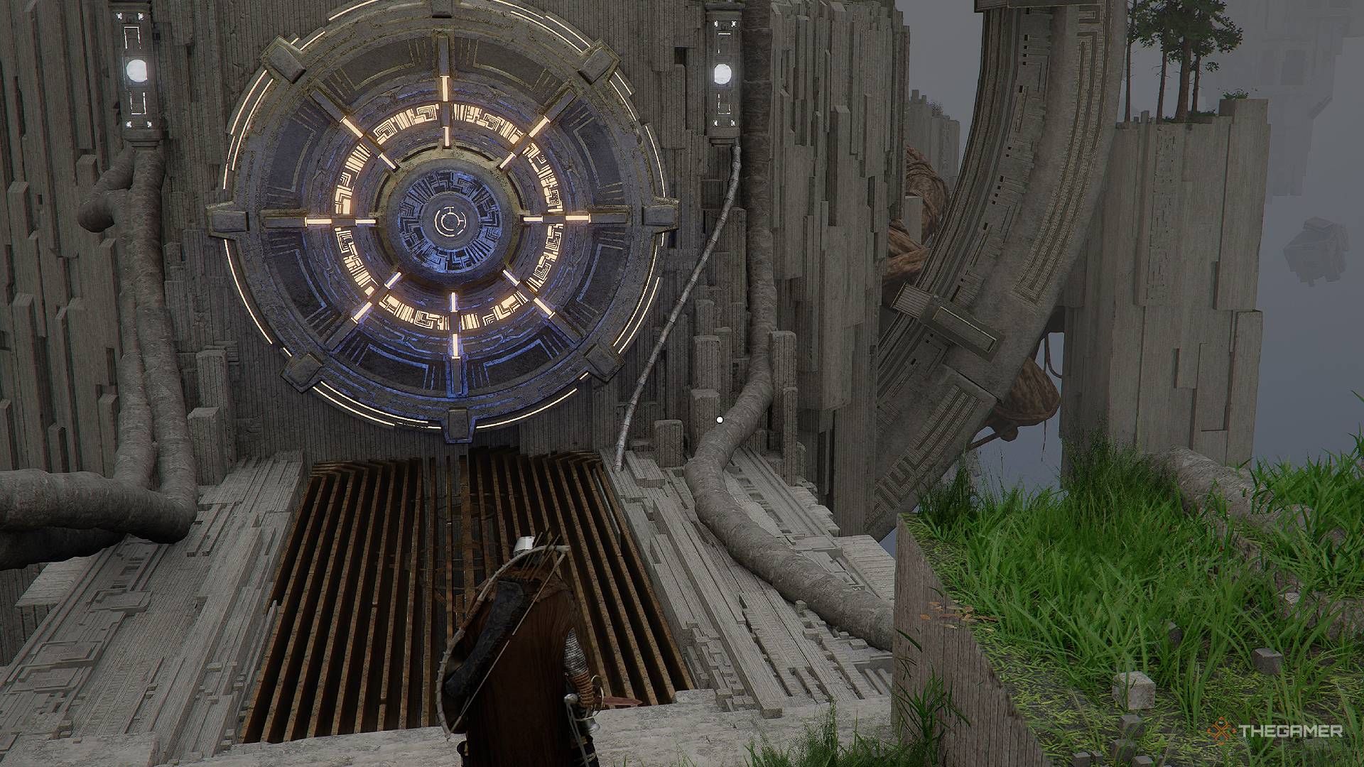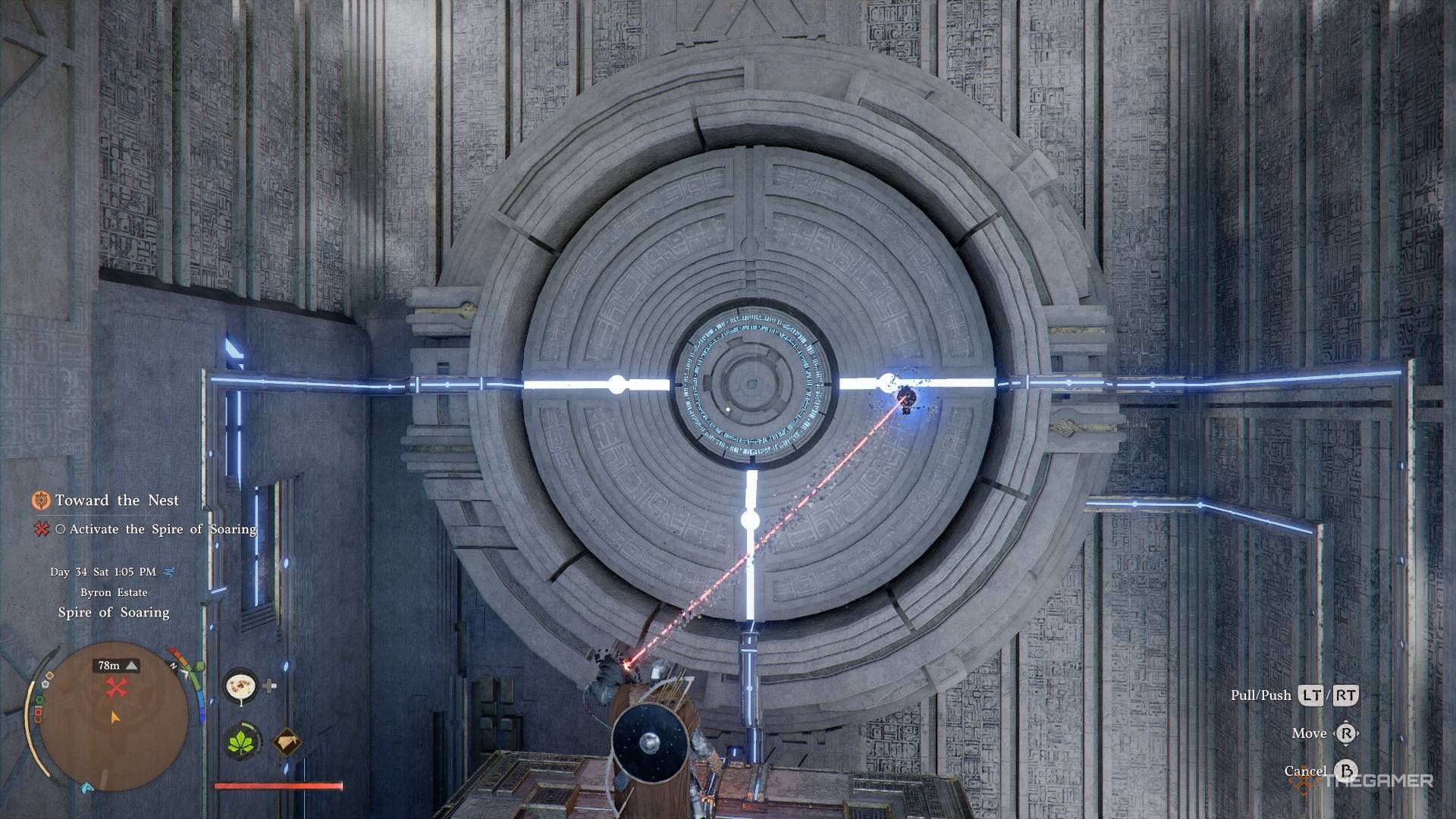 По мере восхождения по башне вы обнаружите еще одну небольшую головоломку. Чтобы решить её, просто поверните центральный круг так, чтобы энергия поступала с обеих сторон – слева и справа, а затем сделайте шаг вперед в центр. Вы можете увидеть, как это сделать, на изображении выше.
