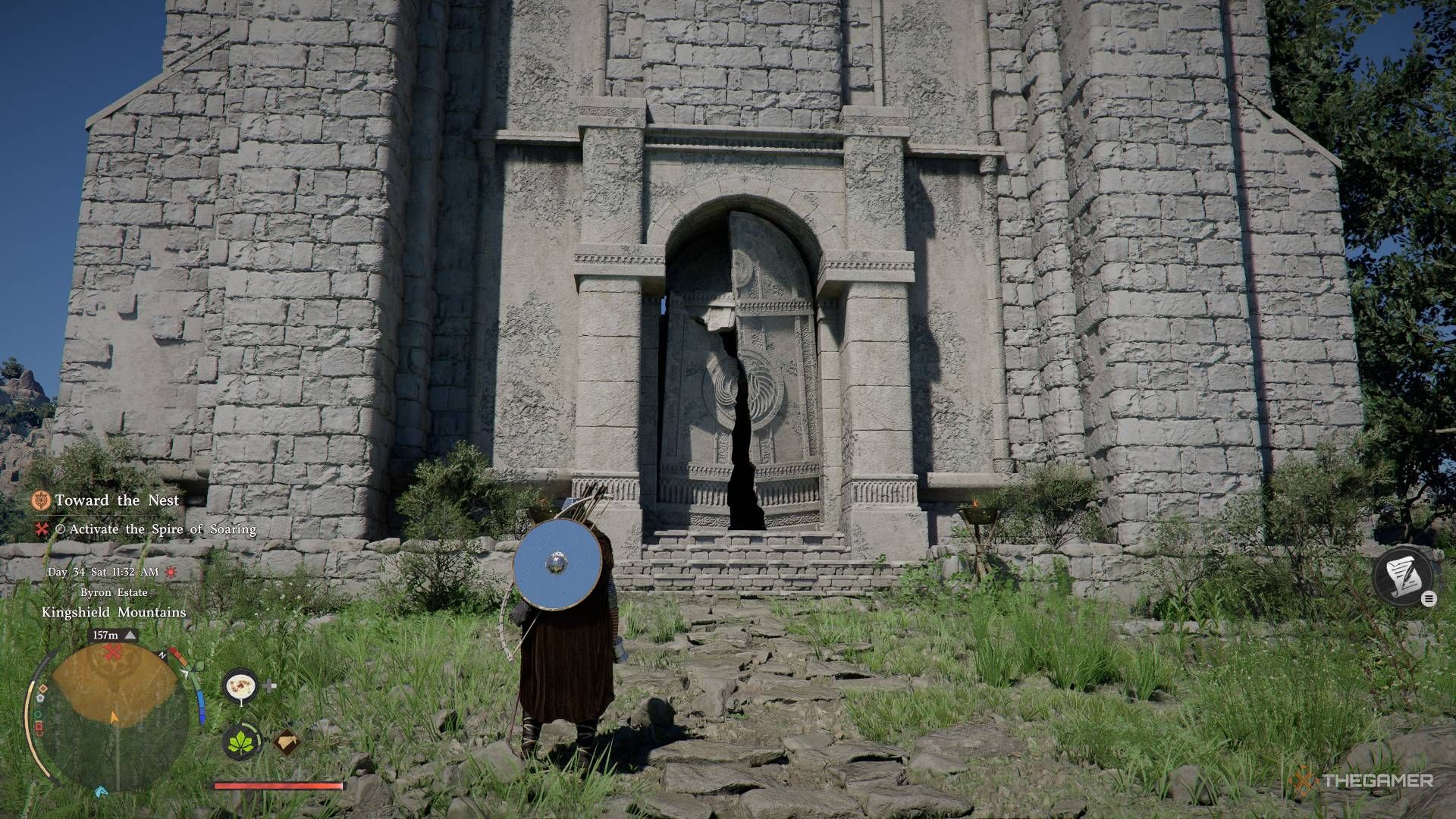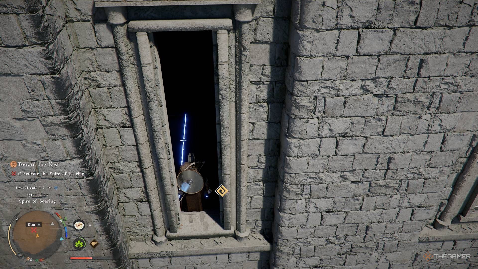 К сожалению, дверь сломана, поэтому войти через неё нельзя. Ваш единственный вариант — взобраться. На передней части башни есть разбитое окно, обращённое к двери, а также окна по бокам, которые можно использовать для подъёма.