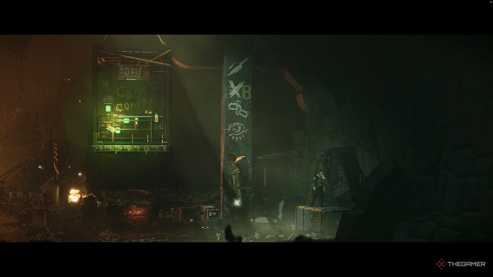На левой стороне контейнера вы увидите несколько устройств со светом. Устройства слева светятся зеленым, а справа — красным. Если расположить тележку точно между ними, она соединит обе стороны, изменив красный свет на зеленый и включив консоль.