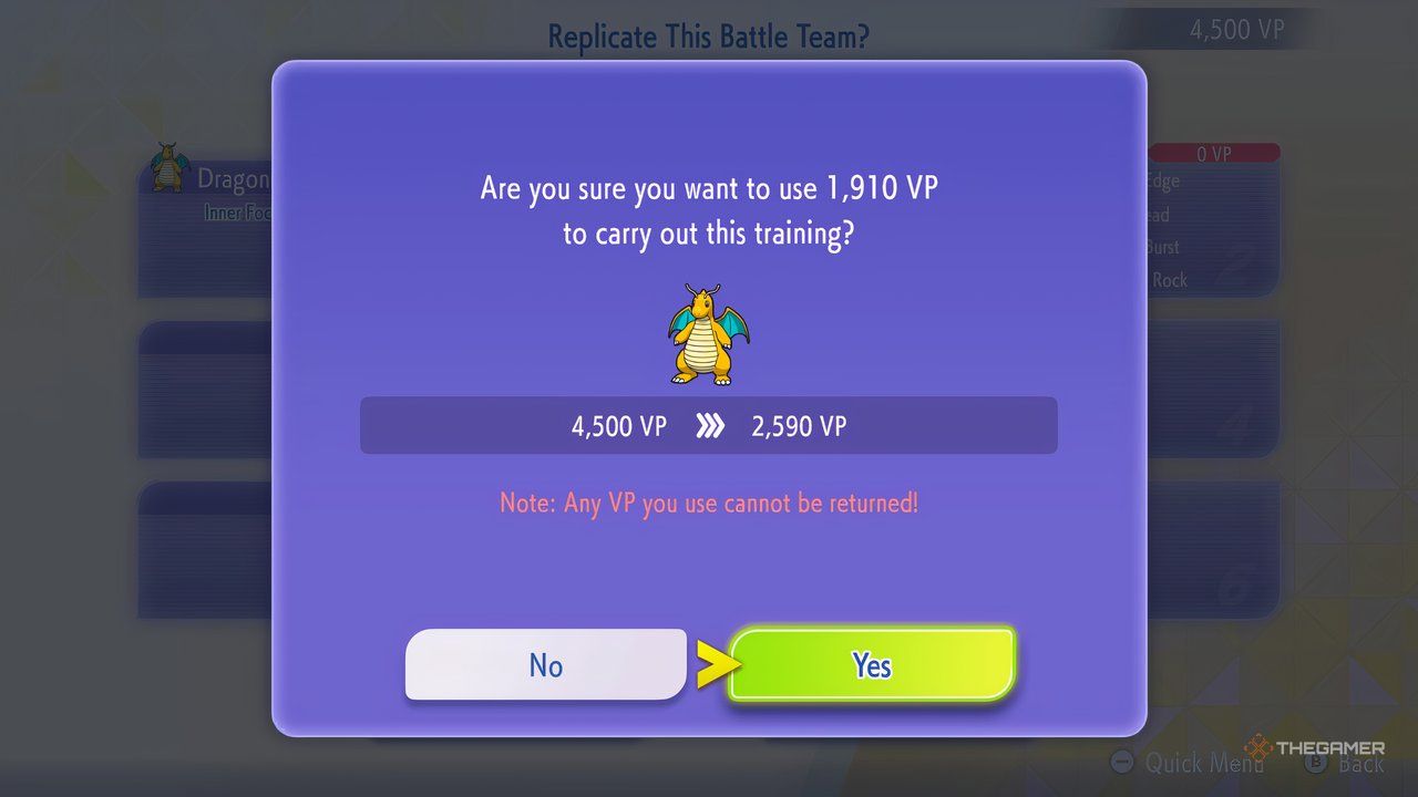 Нажмите кнопку ‘+’ чтобы начать тренировку и подтвердите готовность использовать необходимое количество очков VP. Затем вы создадите новую боевую команду на основе команды Replica – или как можно больше из неё, если у вас есть соответствующие покемоны.