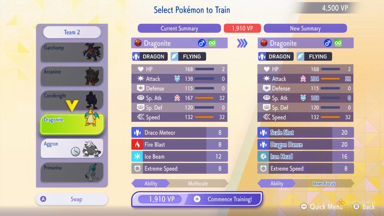 Следующий экран показывает, как команда повлияет на вашего Pokémon. Если члена команды не хватает, эти опции будут недоступны. Вы не будете тратить VP на изменение вещей, которые уже установлены так, как вы хотите, – например, приёмов, предметов или характеристик – для каждого Pokémon.