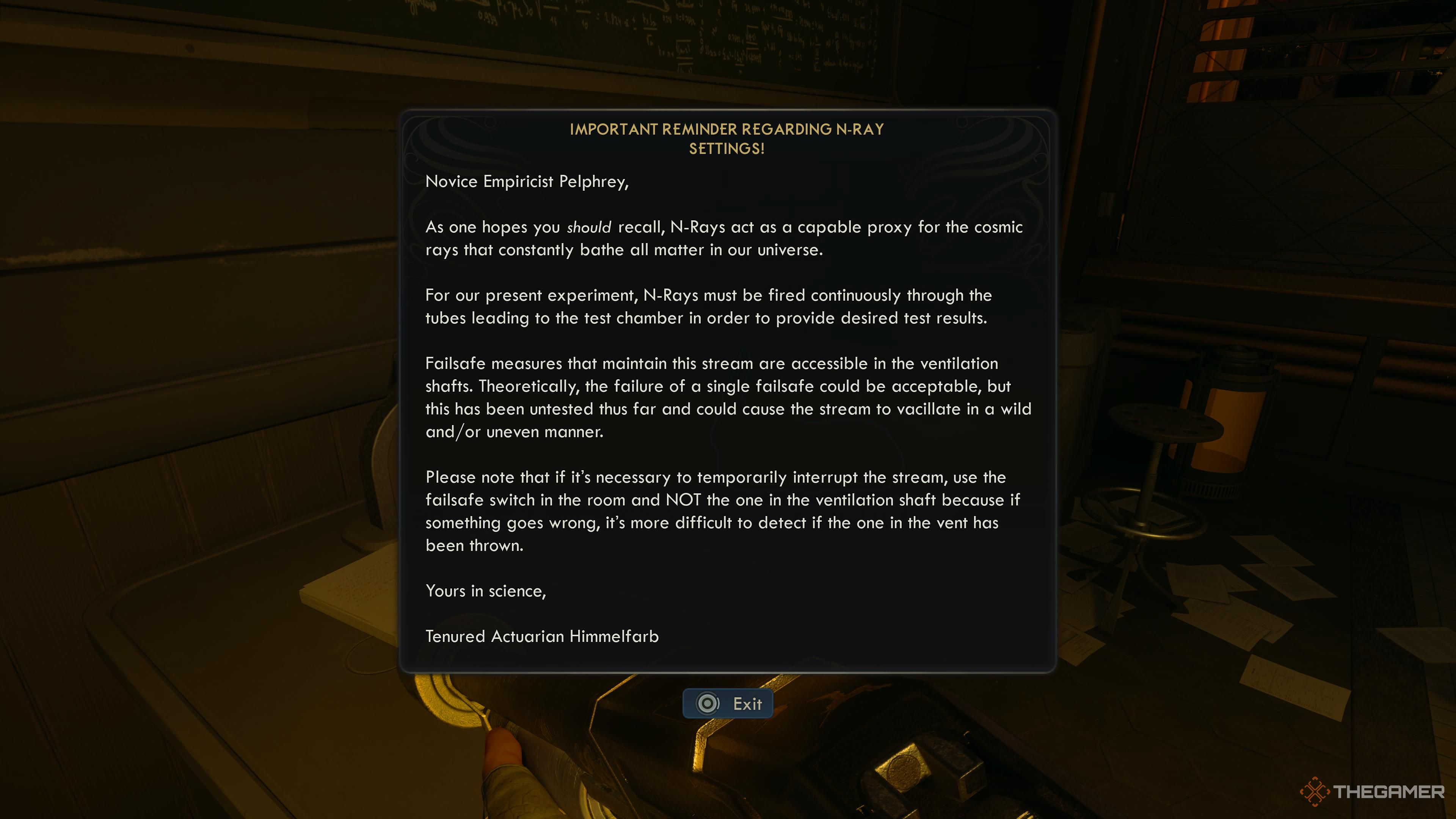 Записи об эксперименте указывают на то, что трудно определить, был ли активирован предохранитель вентиляции, что может объяснить, почему эксперимент не работает должным образом. Пожалуйста, найдите предохранитель в вентиляции и выключите его. На этом моя работа здесь завершена.