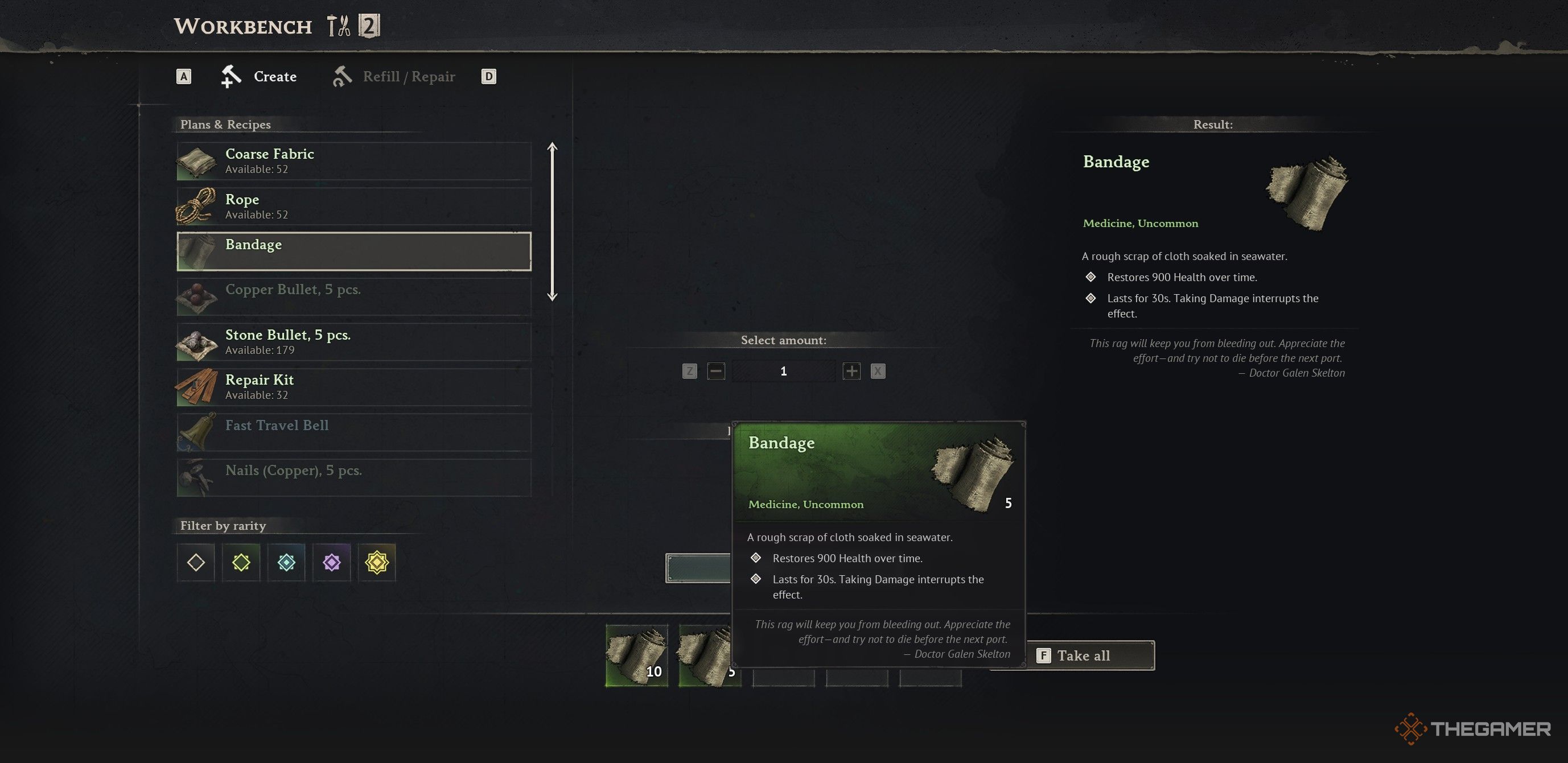 Окей, так когда я впервые начинаю игру, я всегда запасаюсь бинтами. Их очень легко сделать из вещей, которые можно найти повсюду, и они помогают выжить в начале. Но по мере продвижения я переключаюсь на зелья. Их немного сложнее изготовить, потому что нужны более редкие вещи, но они лечат гораздо больше, так что это того стоит.