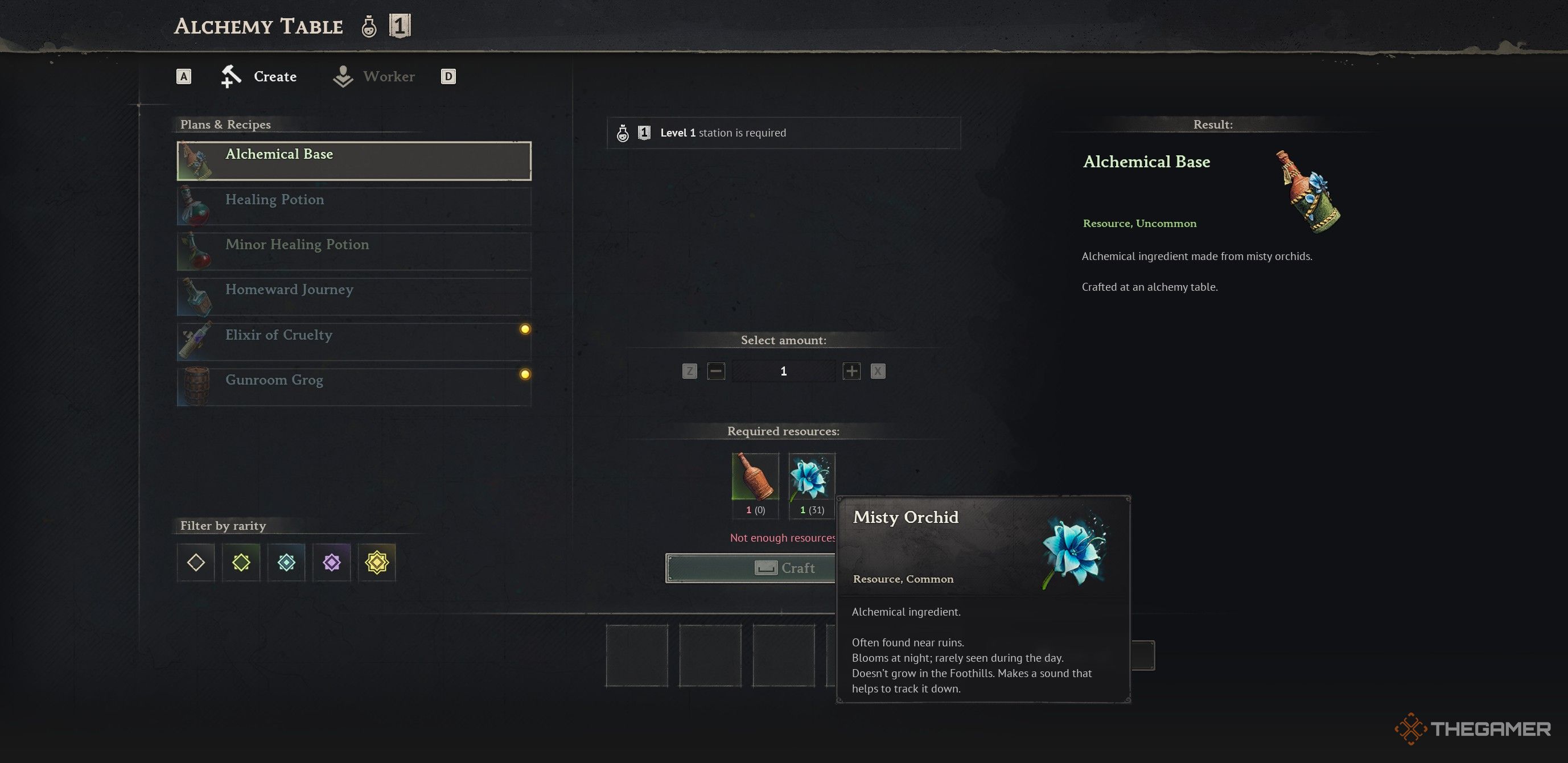 | Зелья | Более мощный вариант лечения, который может быстро восстанавливать большие объемы здоровья. | Используйте Алхимический Стол. Вам понадобятся Глиняные Бутылки (изготовленные из глины), Туманные Орхидеи и Эссенция Нежити, выпадающая из врагов, таких как Утопленники. |