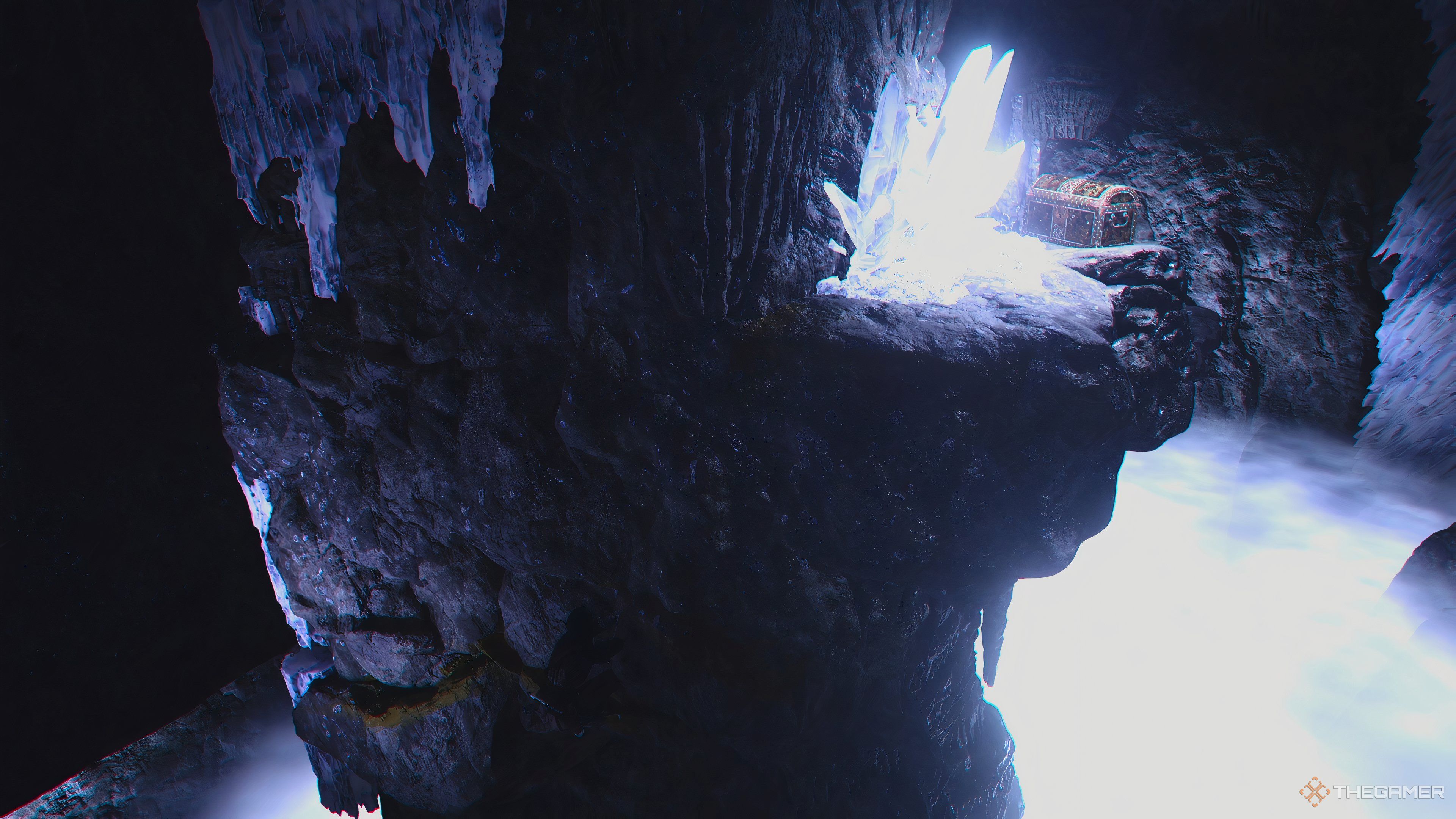 Когда вы доберётесь до обрыва с сундуком внизу, осторожно спуститесь по кристаллам слева, чтобы добраться до него. Этот сундук, найденный во время квеста по мотивам Attack on Titan в Assassin’s Creed Shadows, может быть труднодоступен, но он вознаграждает вас флагом Garrison – косметическим предметом для использования на открытом воздухе.