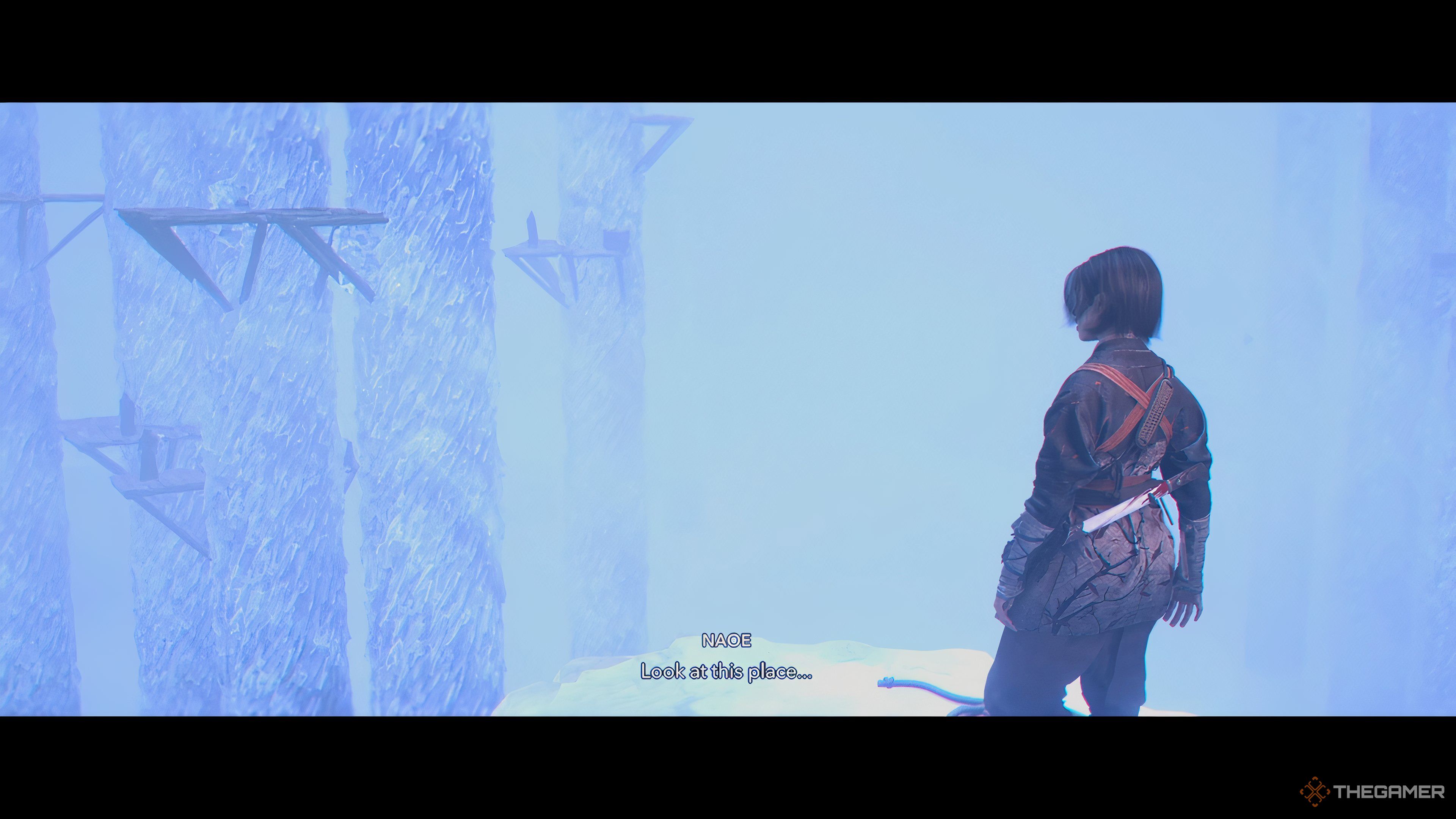 По мере того, как я продолжал двигаться вперед, я начал замечать эти затвердевшие кристаллы – они действительно напомнили мне те, что из Attack on Titan! К счастью, оружие Наоэ легко разрезало их. Затем я использовал свой крюк, чтобы зацепиться за потолок пещеры и спустился вниз. Спуск получился довольно плавным!
