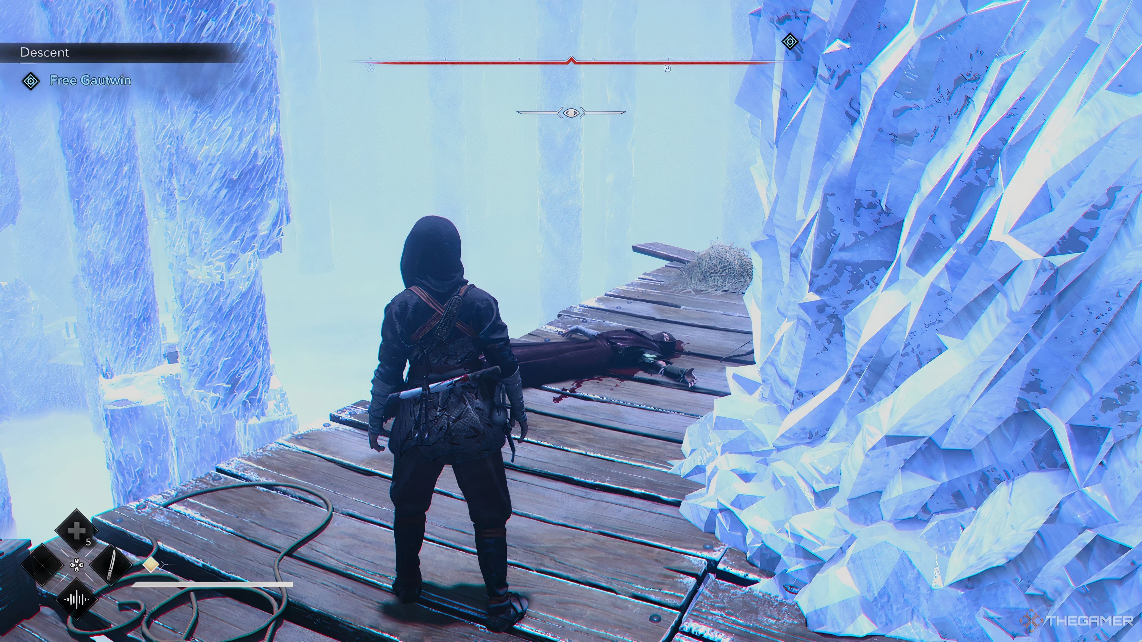Продолжайте движение вперёд, перепрыгивая через кристаллические платформы. Затем поднимитесь по кристаллической стене слева – это та, рядом с которой три деревянных доски – и выполните прыжок назад. Заберите припасы из ближайших ящиков, чтобы пополнить своё снаряжение, а затем используйте точку захвата впереди, чтобы добраться до Лорда Риттера и его фанатиков Элитраси. Возможно, вы сможете бесшумно устранить первых двух врагов, но вам придётся сражаться с остальными напрямую.