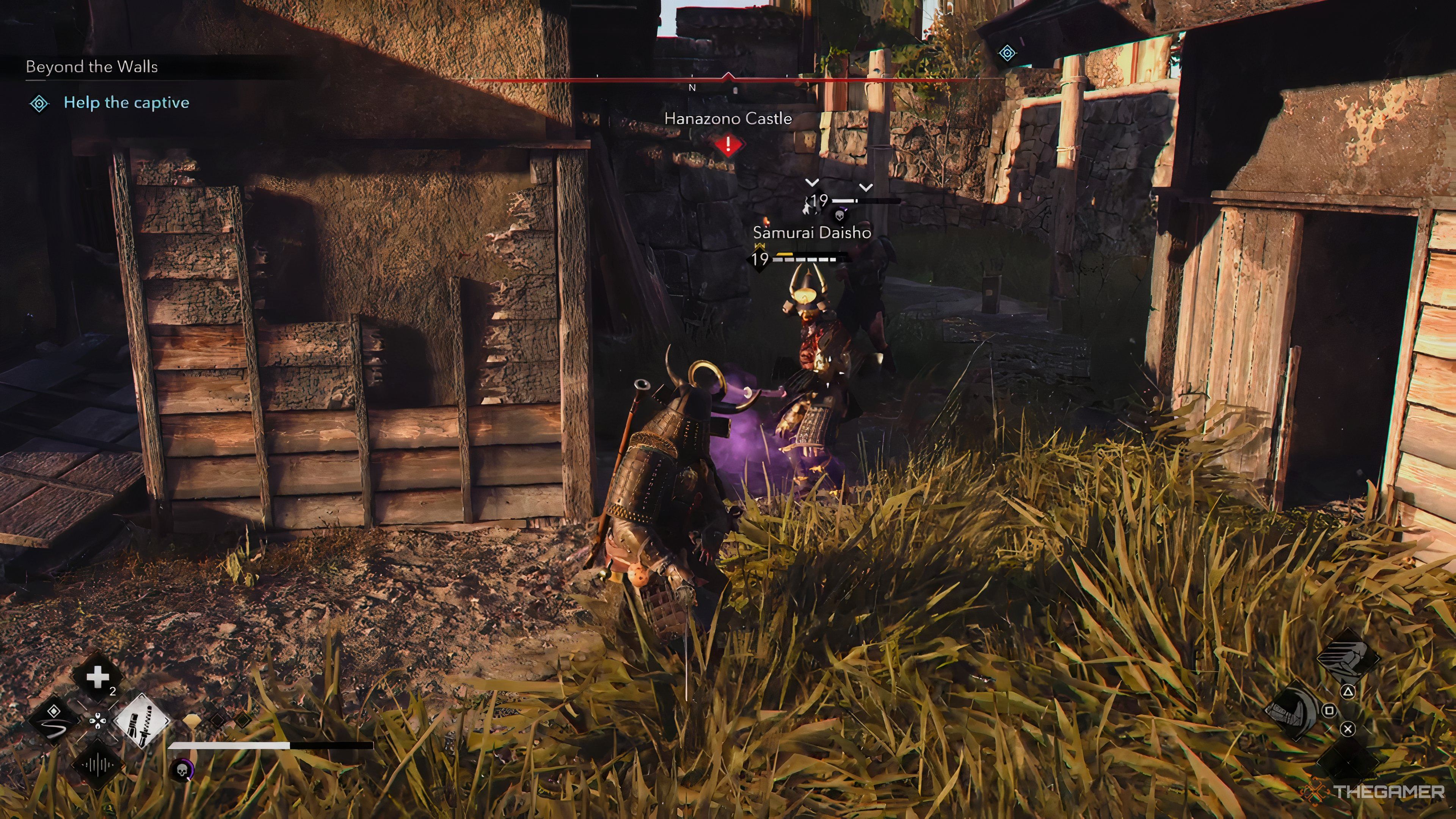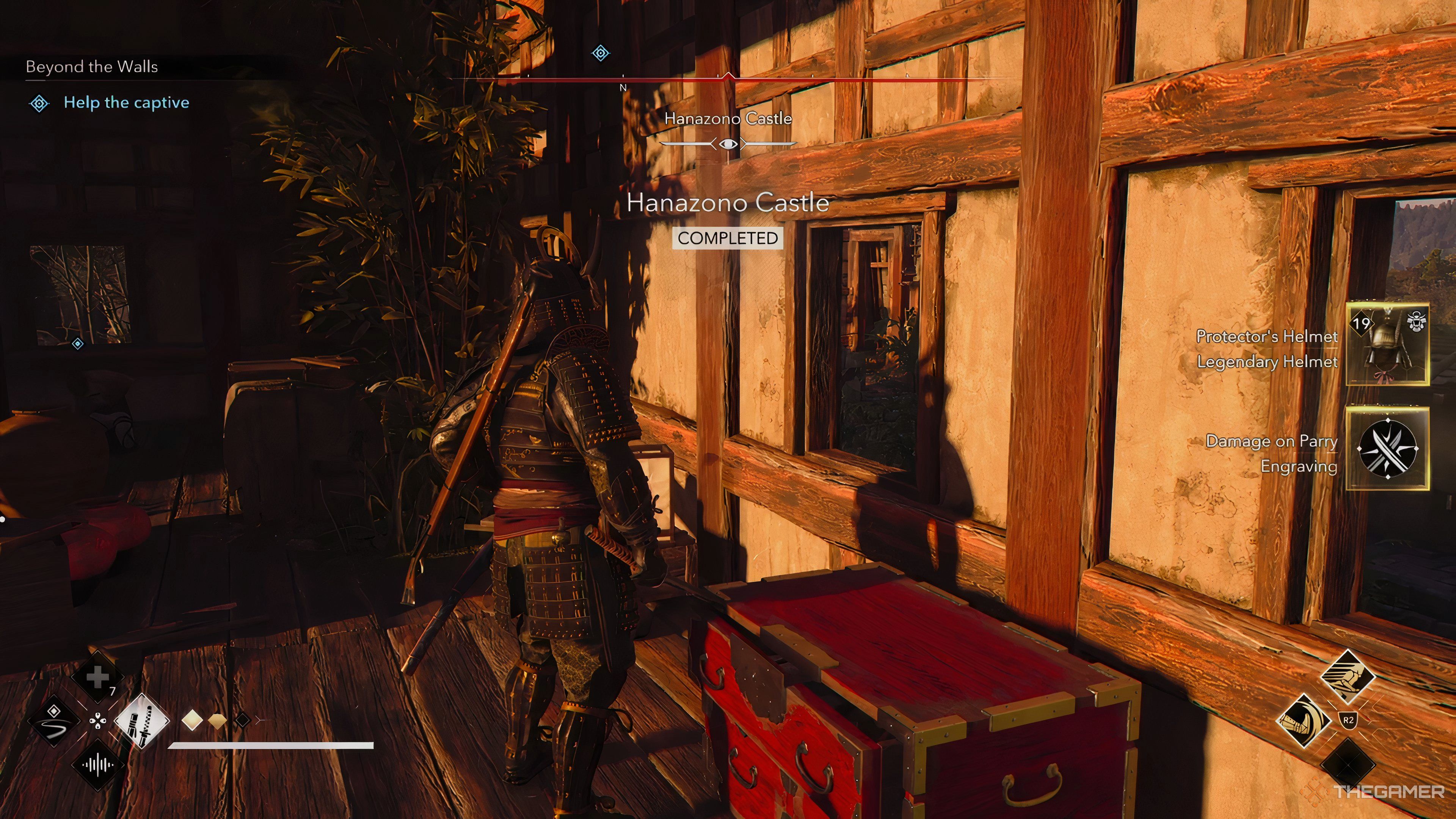 Вы можете играть скрытно с Наоэ и избегать большинства сражений, но если вы впервые совершаете набег на этот замок, лучше использовать Ясуке, чтобы победить Лидера Самураев. Это откроет красный сундук возле заложника, который содержит Шлем Защитника — мощный легендарный предмет — и специальную гравировку, повышающую урон при парировании.