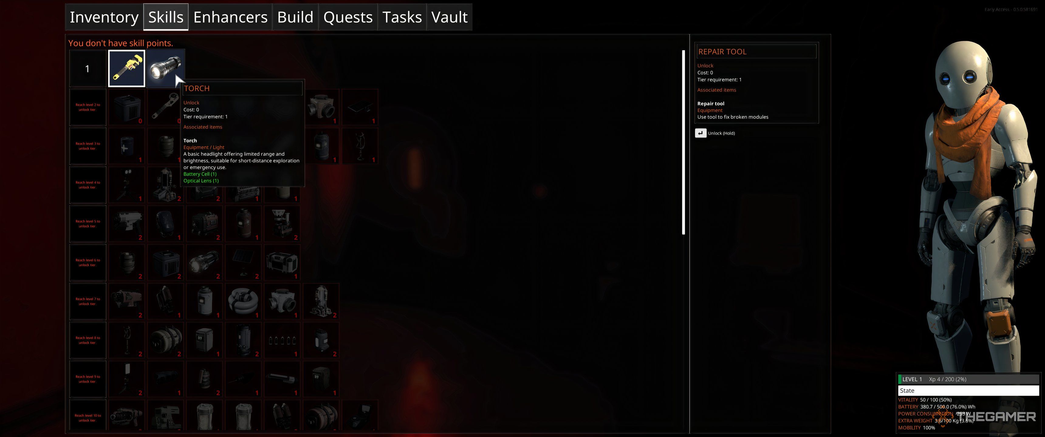 Вы улучшите свои навыки в разборке вещей, их ремонте и боевых действиях, что поможет вам получить опыт и повысить уровень. По мере повышения уровня вы будете зарабатывать очки навыков. Эти очки позволят вам научиться создавать новые предметы – необходимые для поздних этапов игры.