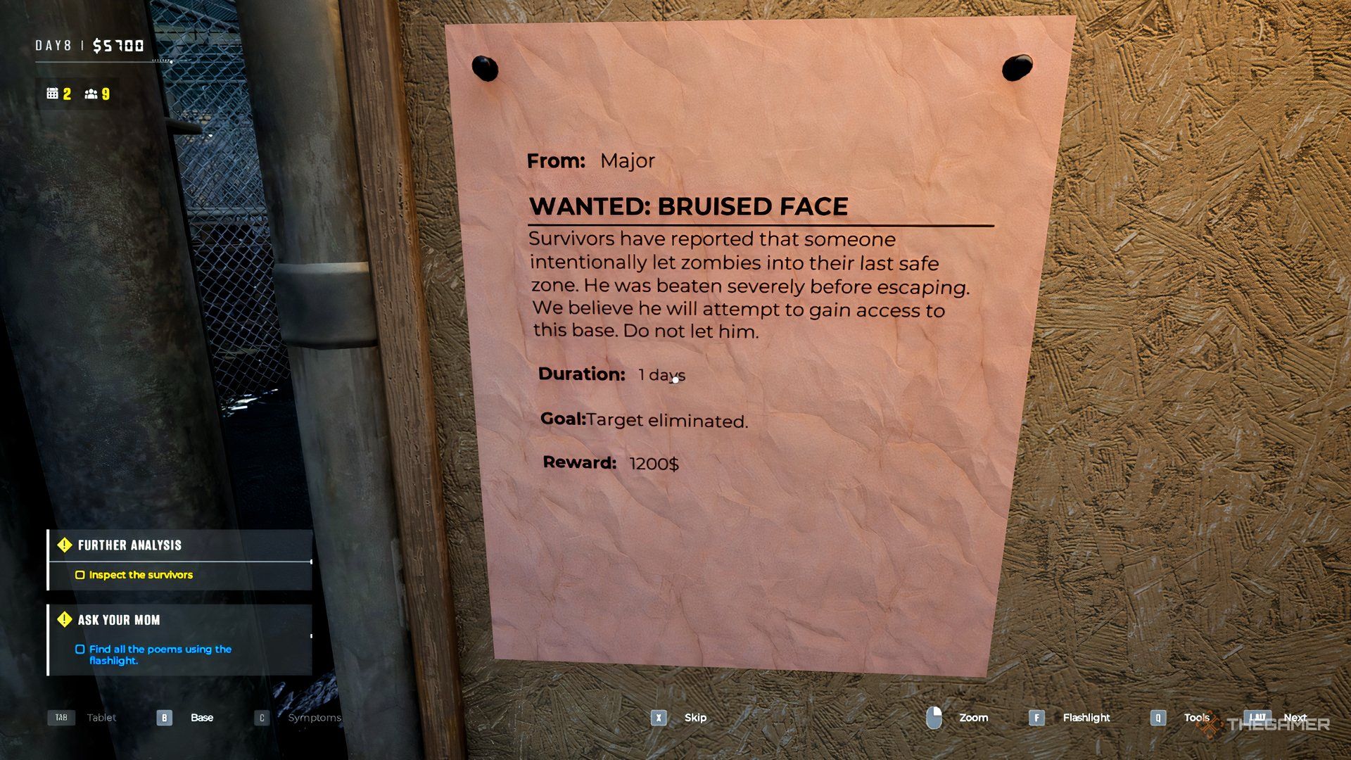 Несмотря на то, что выживший не выглядит больным, вам приказано устранить его. Вы можете отправить его на Liquidation, или убить самостоятельно, используя пистолет или молоток. Выполнение этого завершит квест и вознаградит вас $1,200.