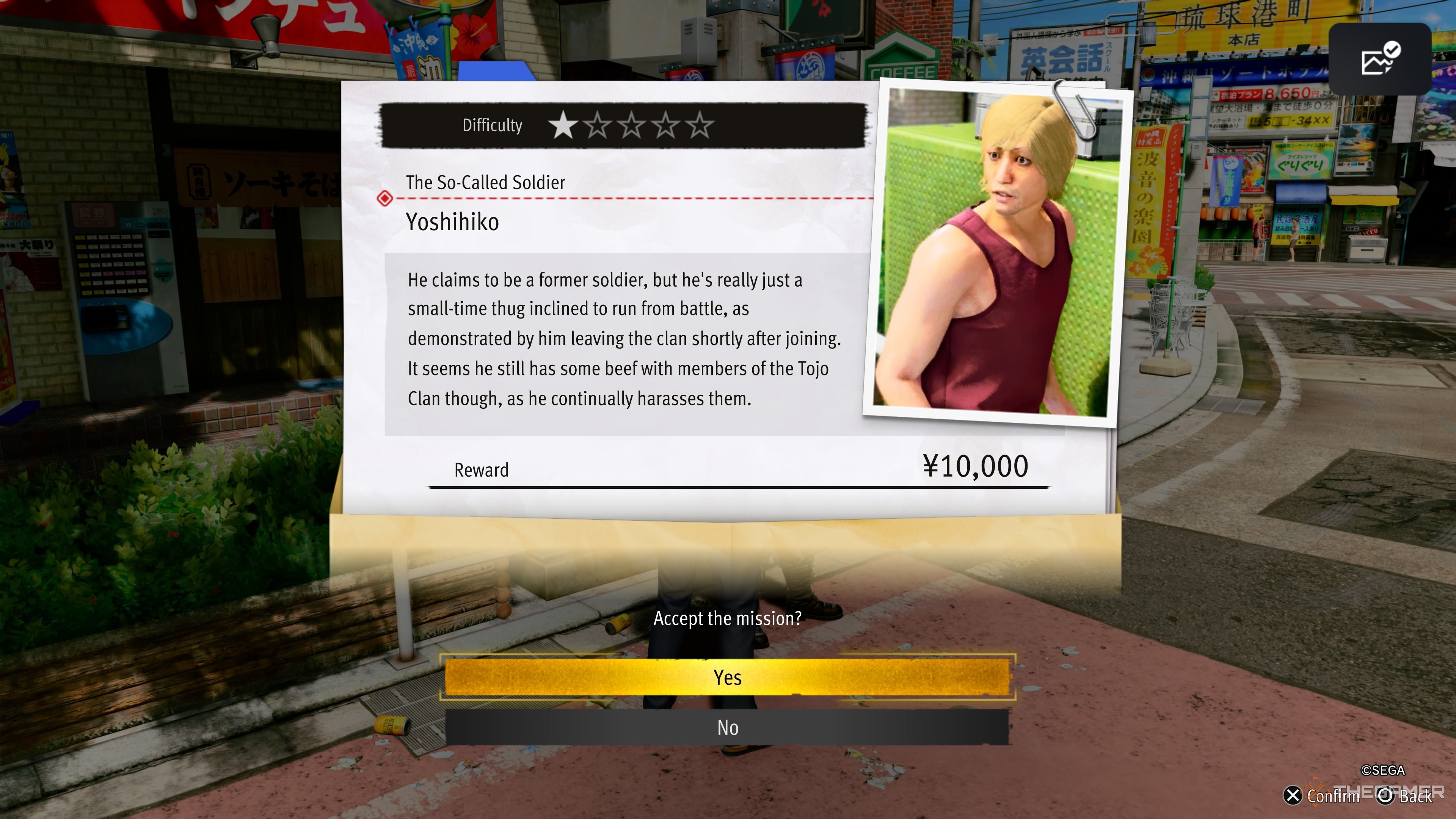| Yoshihiko | Прибудьте в центр Рюкю во время главы 2: Встреча с Рюдо. | 1 Звезда | 10 000 иен | На обочине улицы Рюкю Центральной трассы, рядом с Ebisu Pawn. |