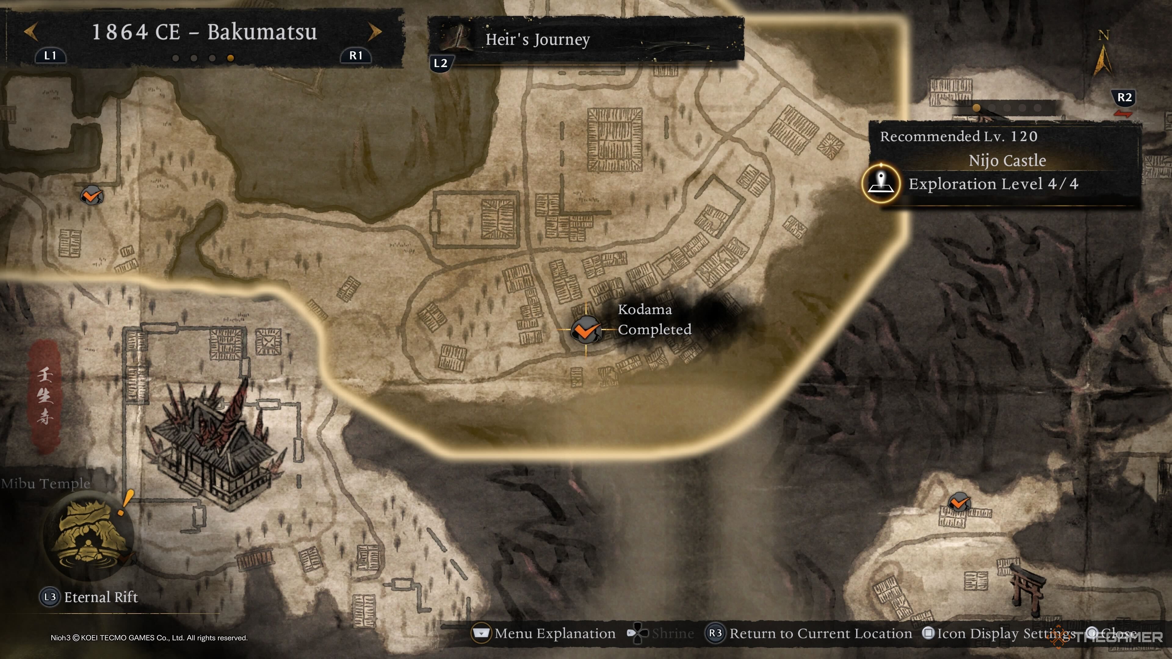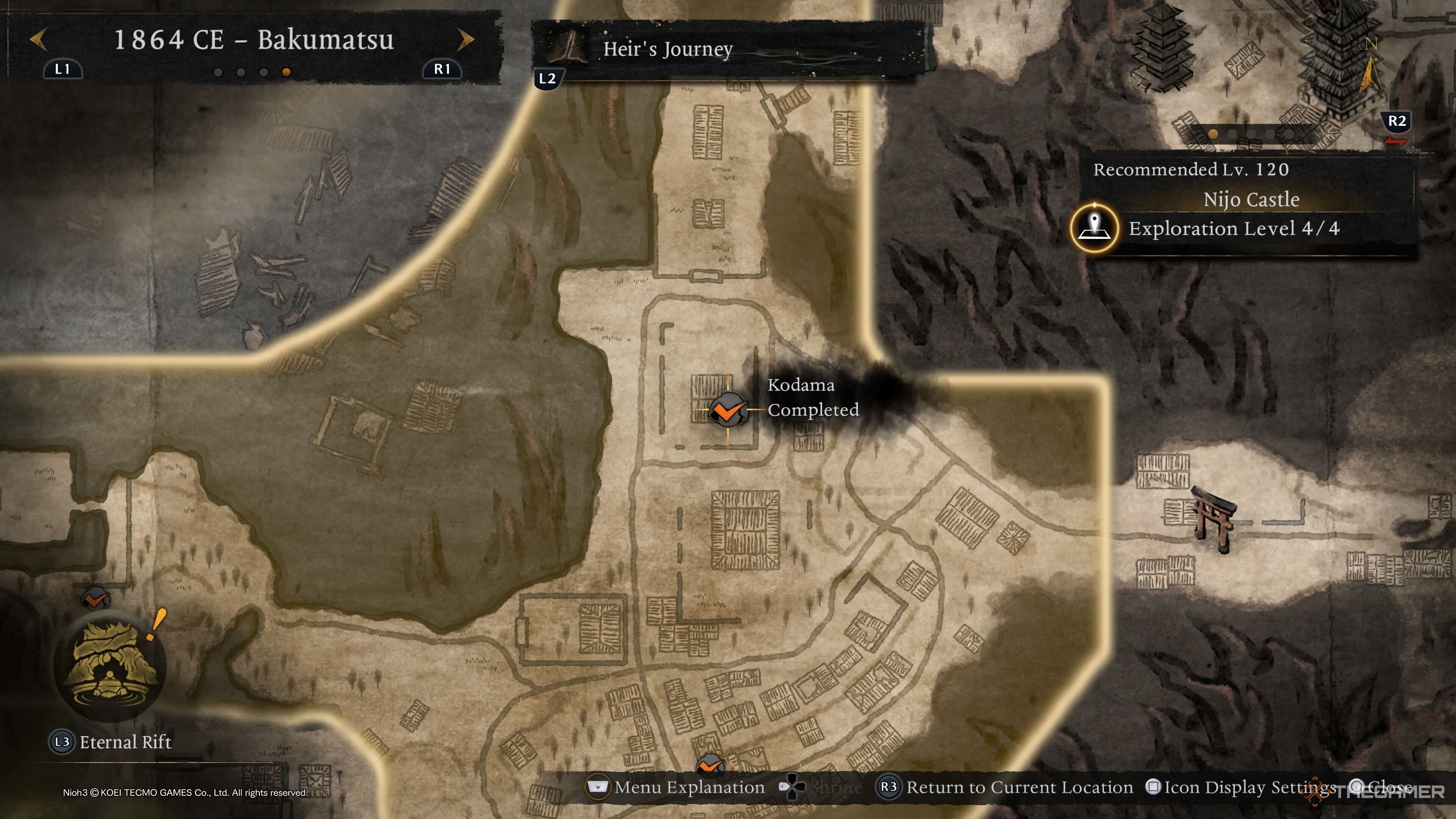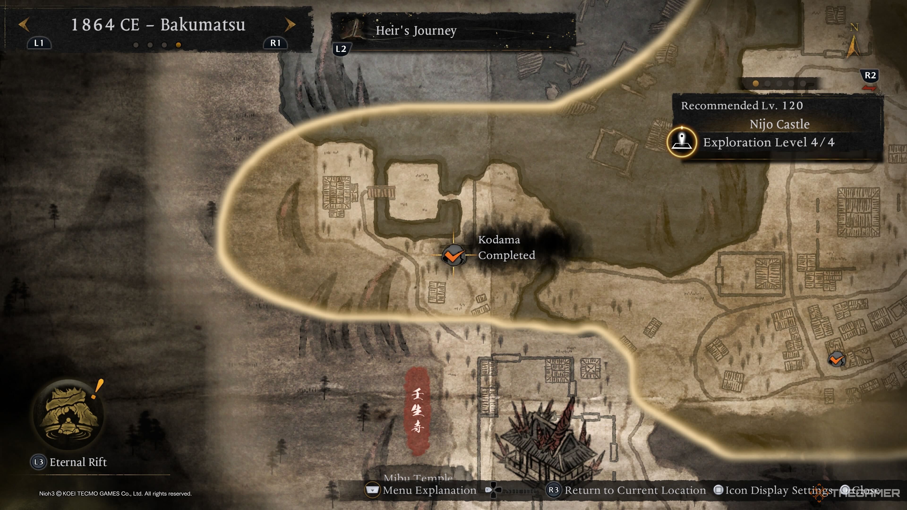 Первого Кодаму Императорского дворца Киото можно найти в левой верхней части области, и он заперт за Вражеской Базой. Уничтожьте её, чтобы Кодама появился у вновь открывающихся ворот. |