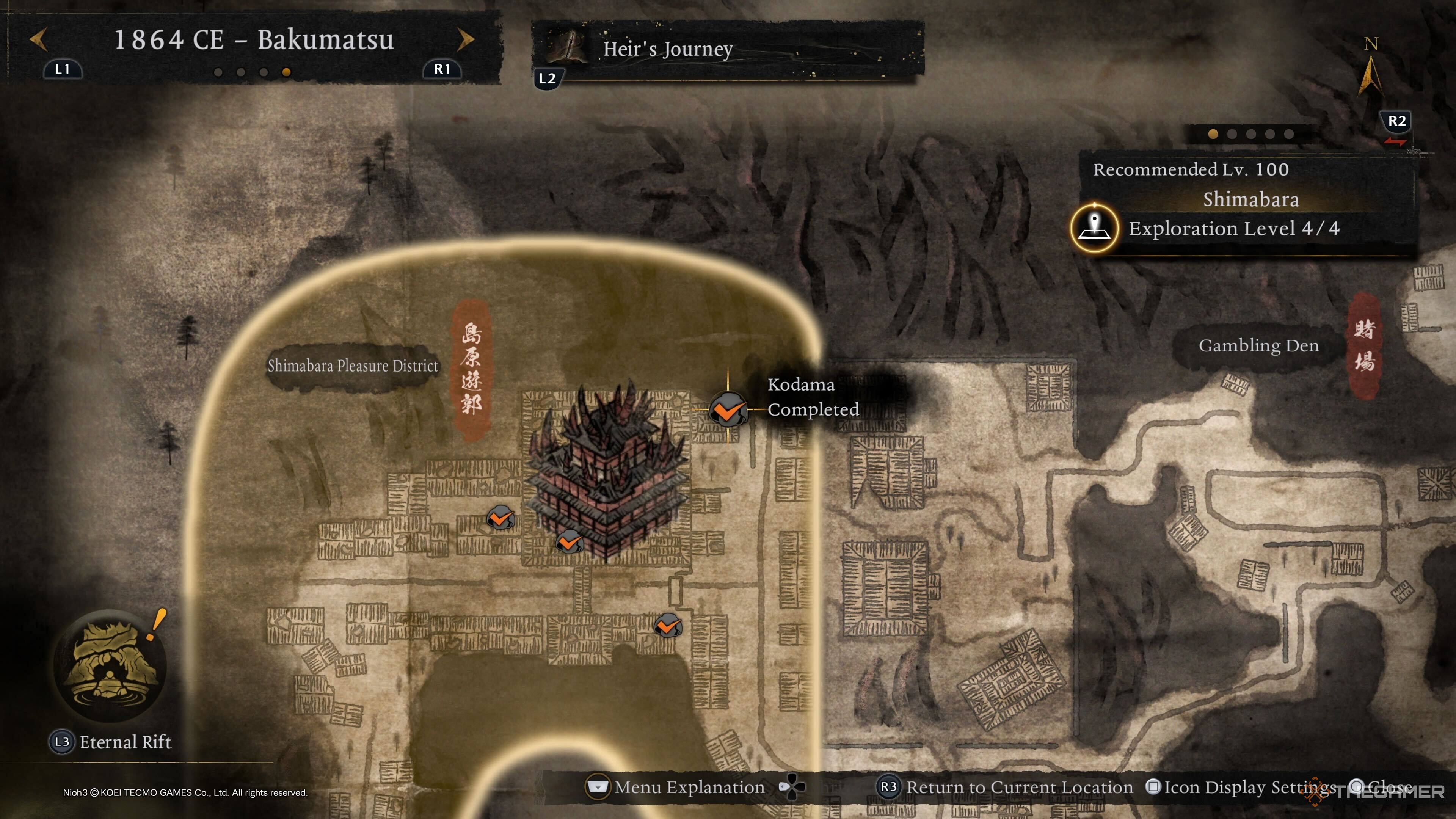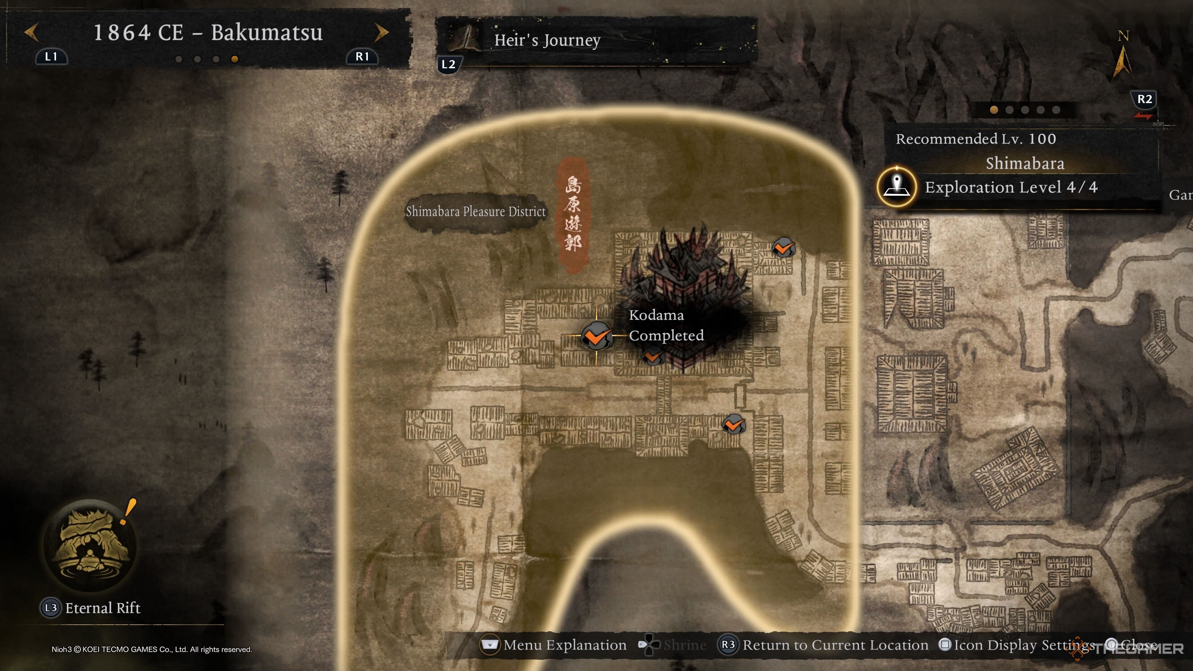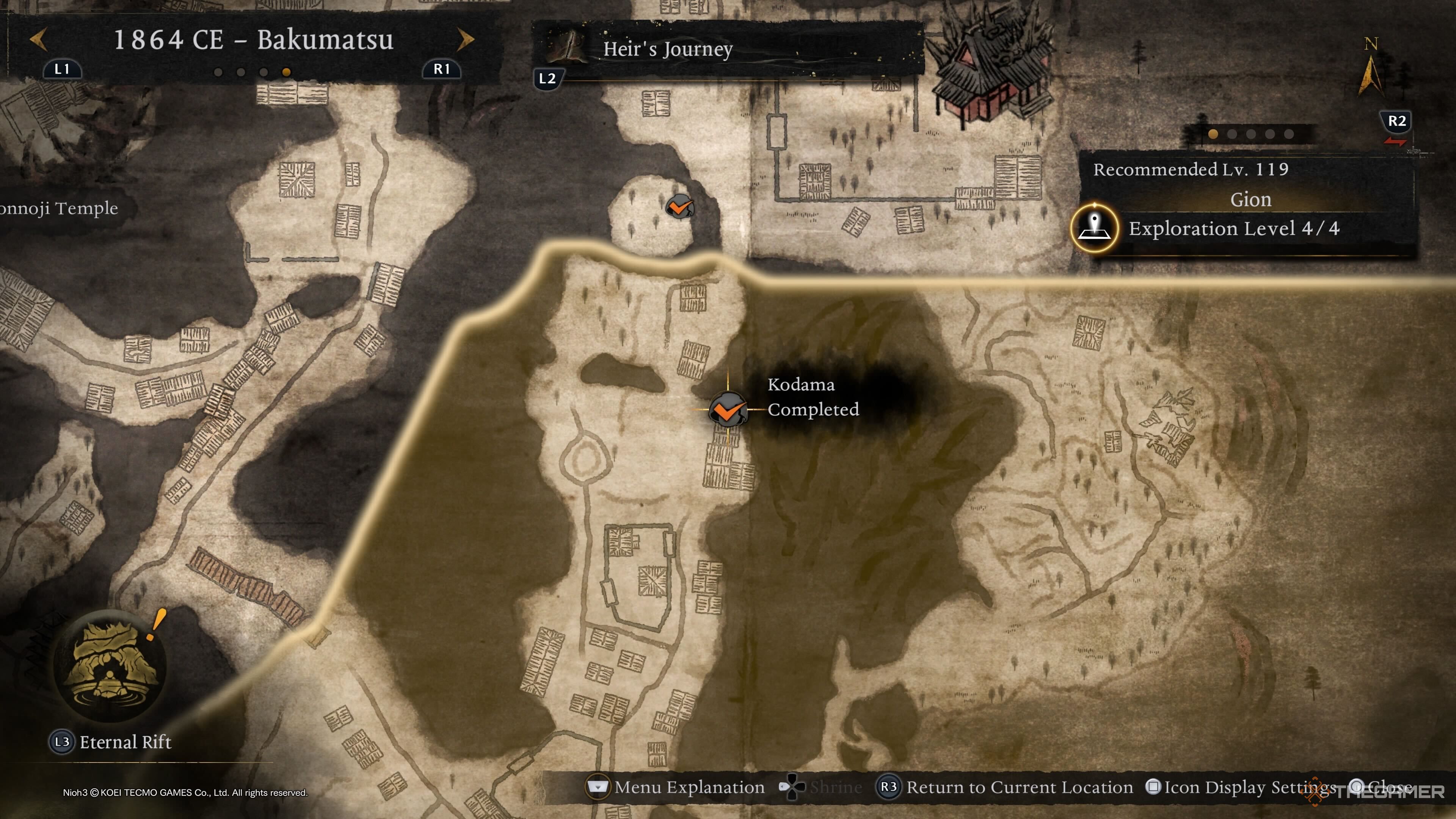 Первого Кодаму Императорского дворца Киото можно найти в левой верхней части области, и он заперт за Вражеской Базой. Уничтожьте её, чтобы Кодама появился у вновь открывающихся ворот. |