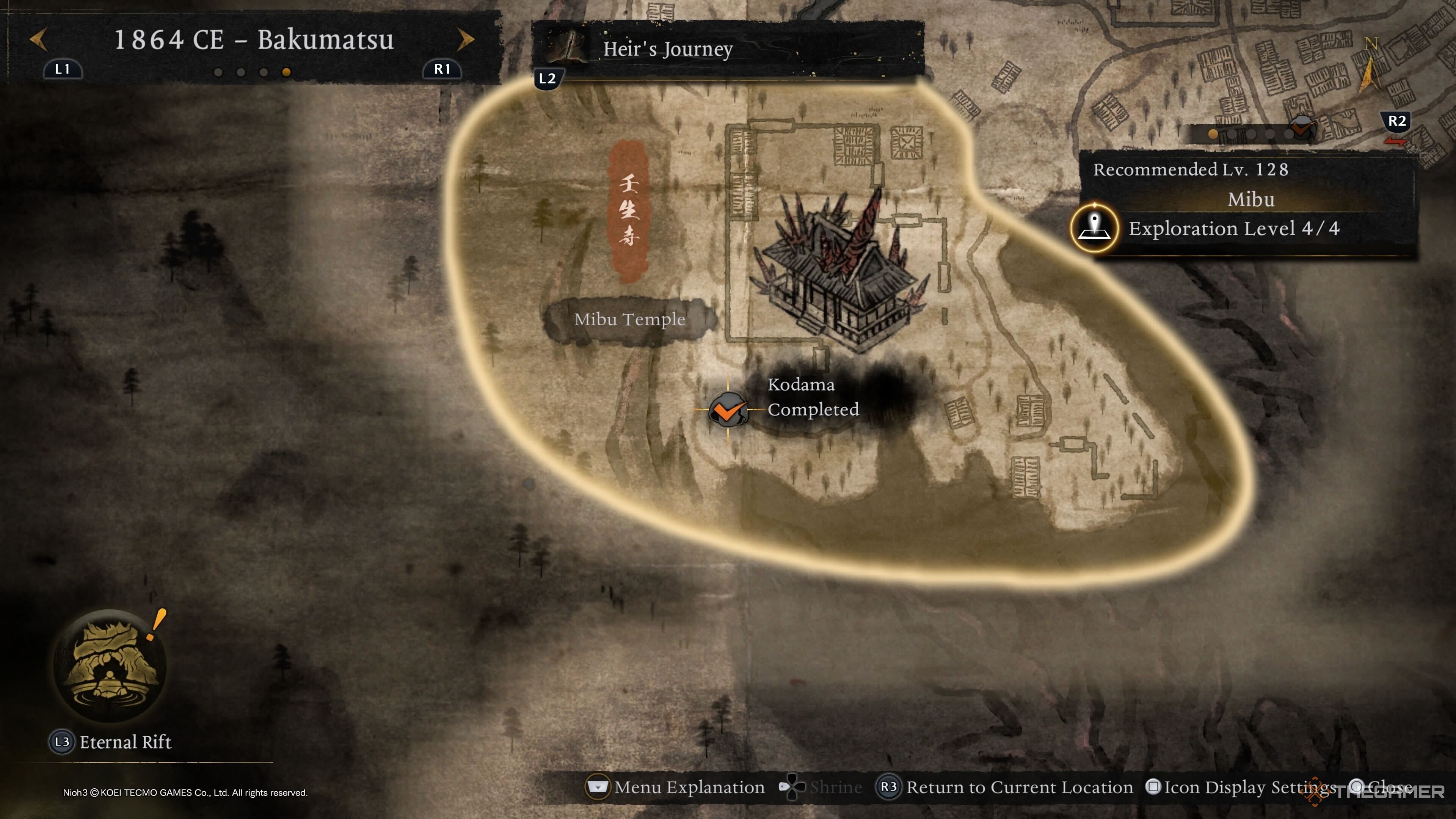 Вы можете найти всего одного Мибу Кодаму на Вражеской Базе, расположенной в южной части области. Начните у Главных Врат Святилища и следуйте по карте, чтобы добраться до базы. После того, как вы победите всех врагов там, вы сможете освободить Кодаму.