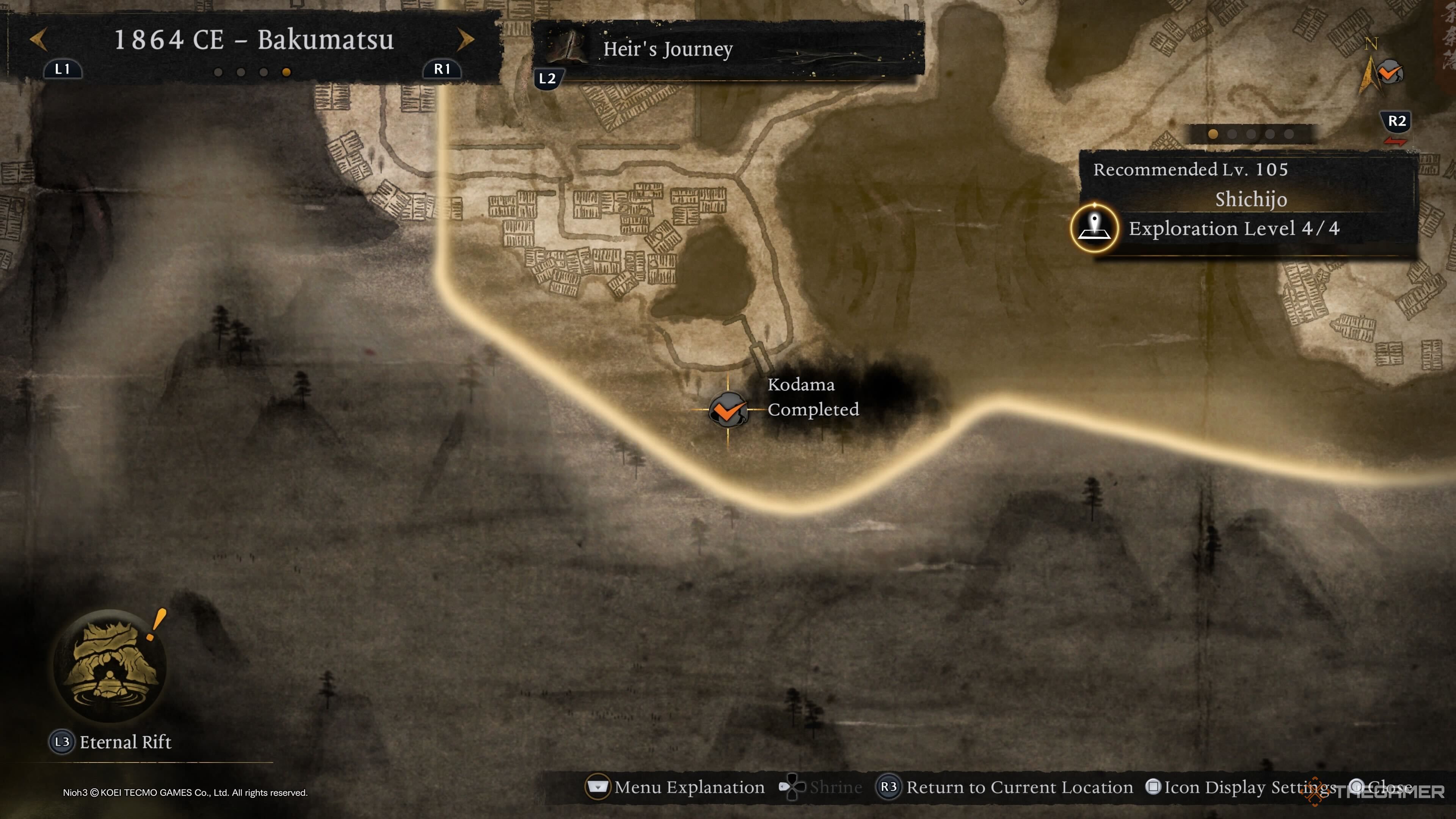 Первого Шичиджо Кодаму можно найти, появившись у святилища Avenue Ruins Shrine. Отсюда повернитесь и направляйтесь к вражеской базе вдалеке. Зачистите её, и вы сможете помочь Кодаме, которого можно найти в доме. |