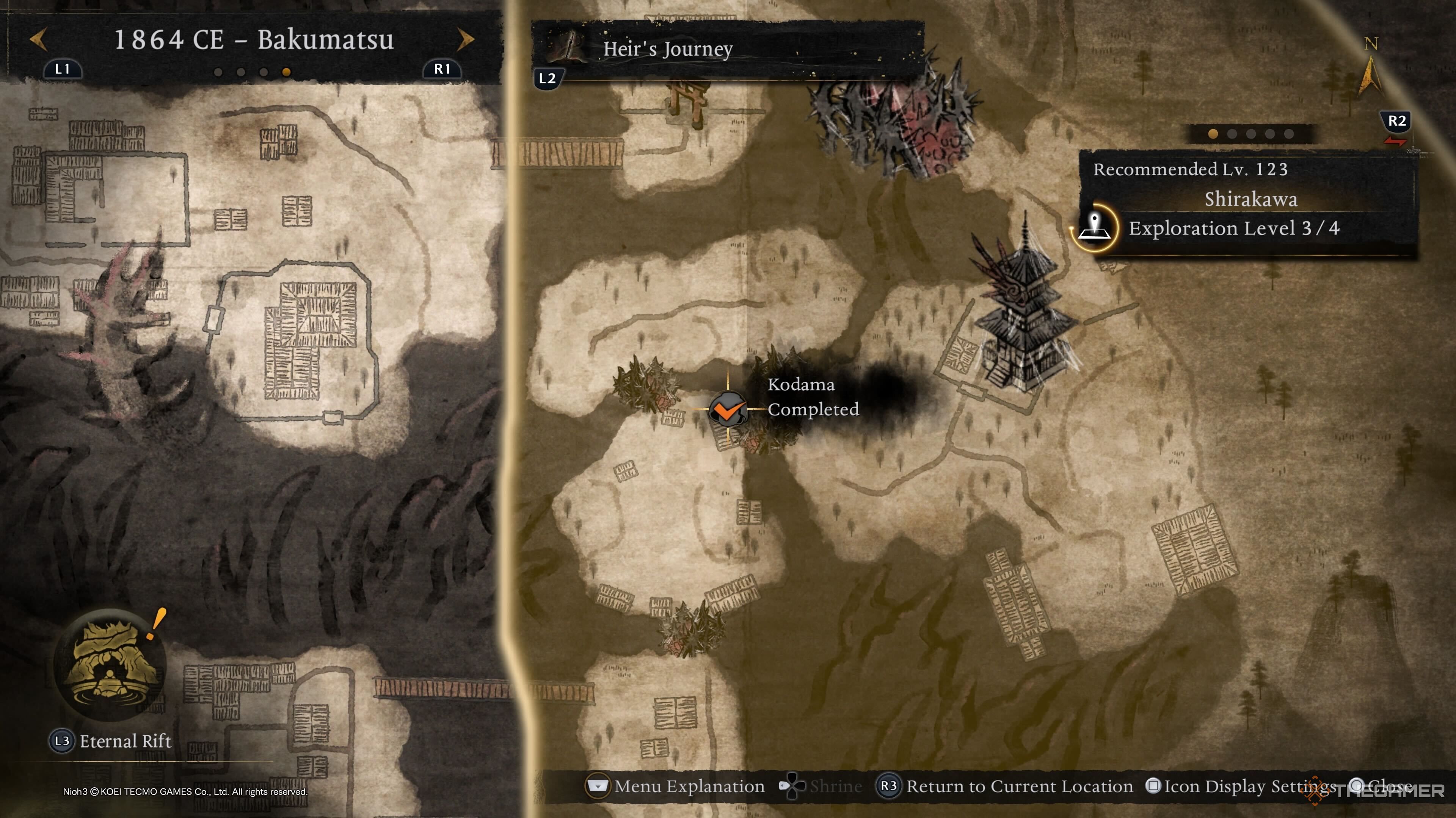 Второго Ширакава Кодаму можно найти, направившись к святилищу Сандзё. Продвигайтесь вперёд и в болотистую область, где полно врагов, которых вам нужно будет победить. Кодама сидит возле хижины на правой стороне деревни. |