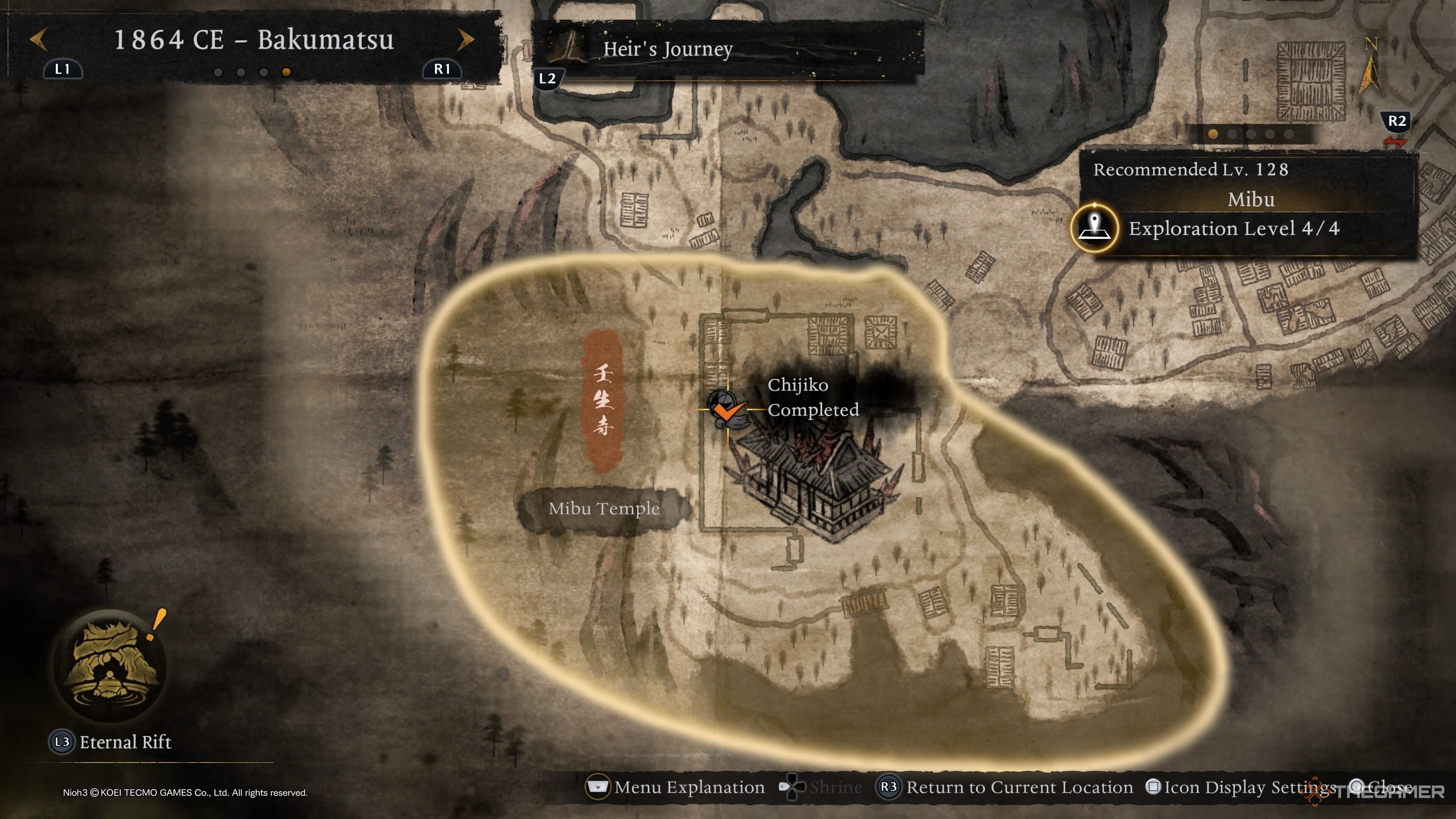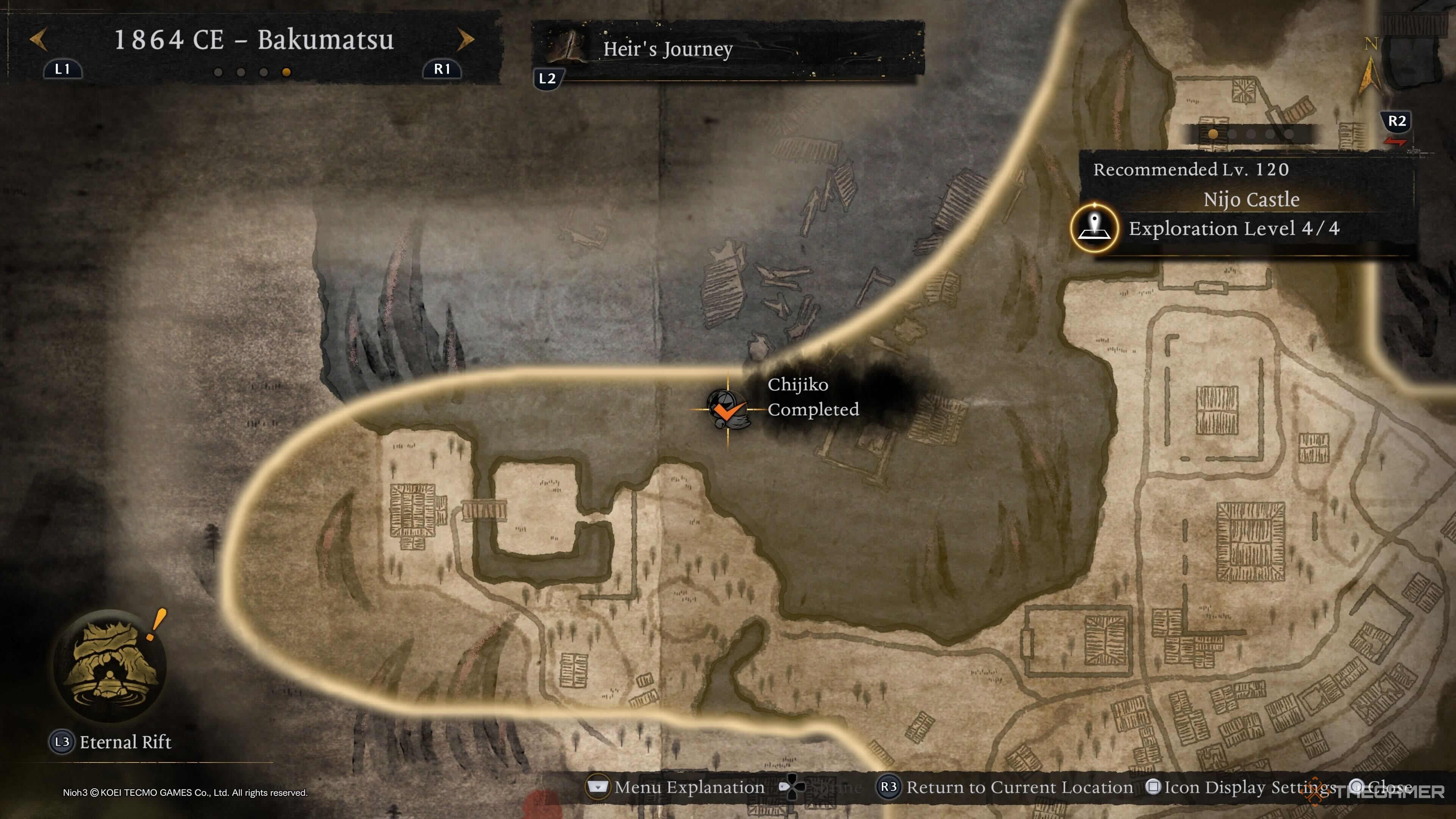 Первый Чиджико замка Нидзё можно найти на севере локации, рядом со святилищем у озера Руин замка Нидзё. Отсюда, повернитесь и используйте Духовную Вену, чтобы подняться на вершину храма, что облегчит сбивание Чиджико. |