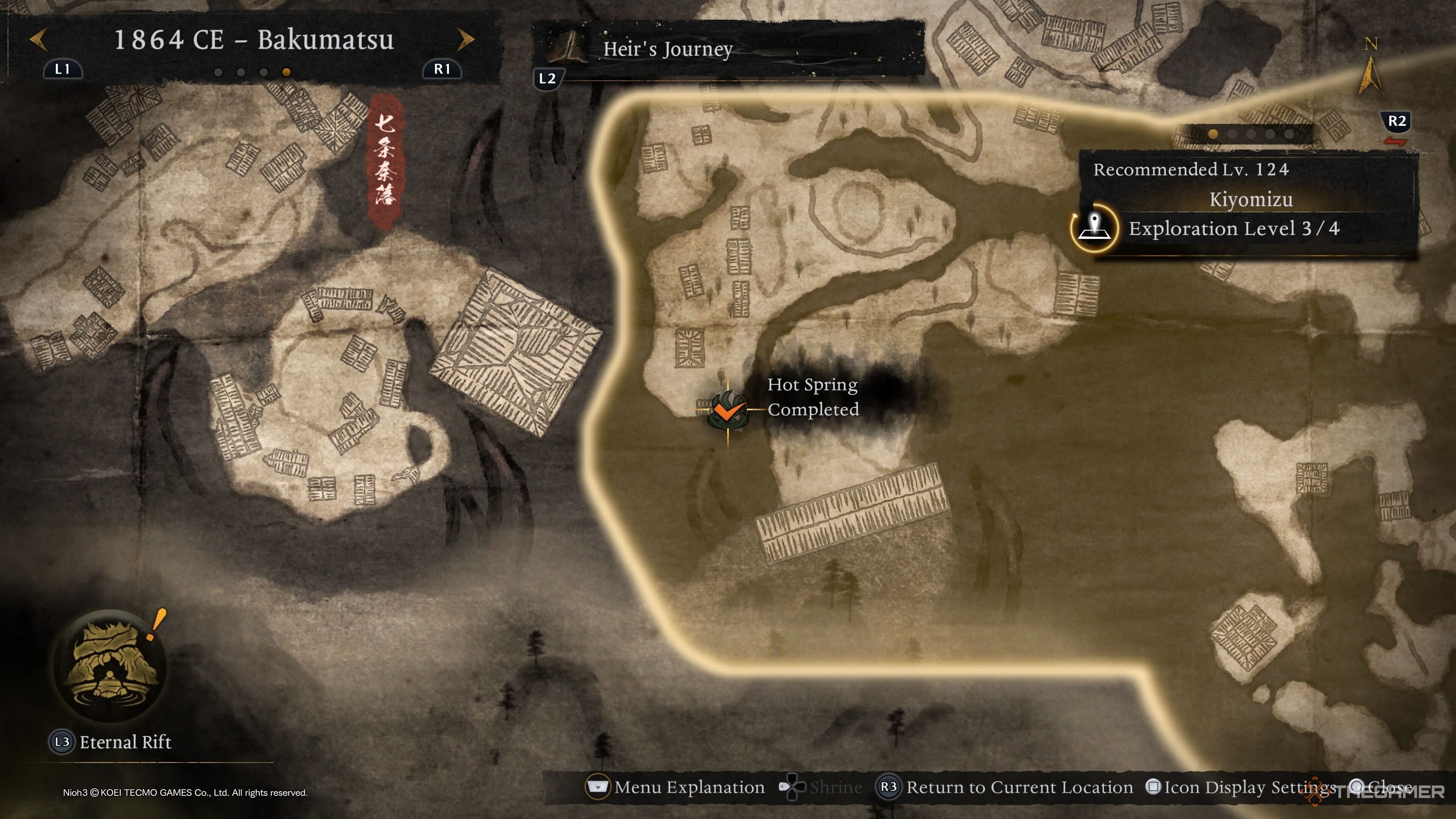 Первый источник Киёмидзу находится на западной стороне области. Чтобы добраться до него, вам нужно появиться у святилища Отова в Гионе и затем направиться в область, отмеченную на карте, чтобы очистить Тёмное Царство. Источник ждёт вас в конце. |
