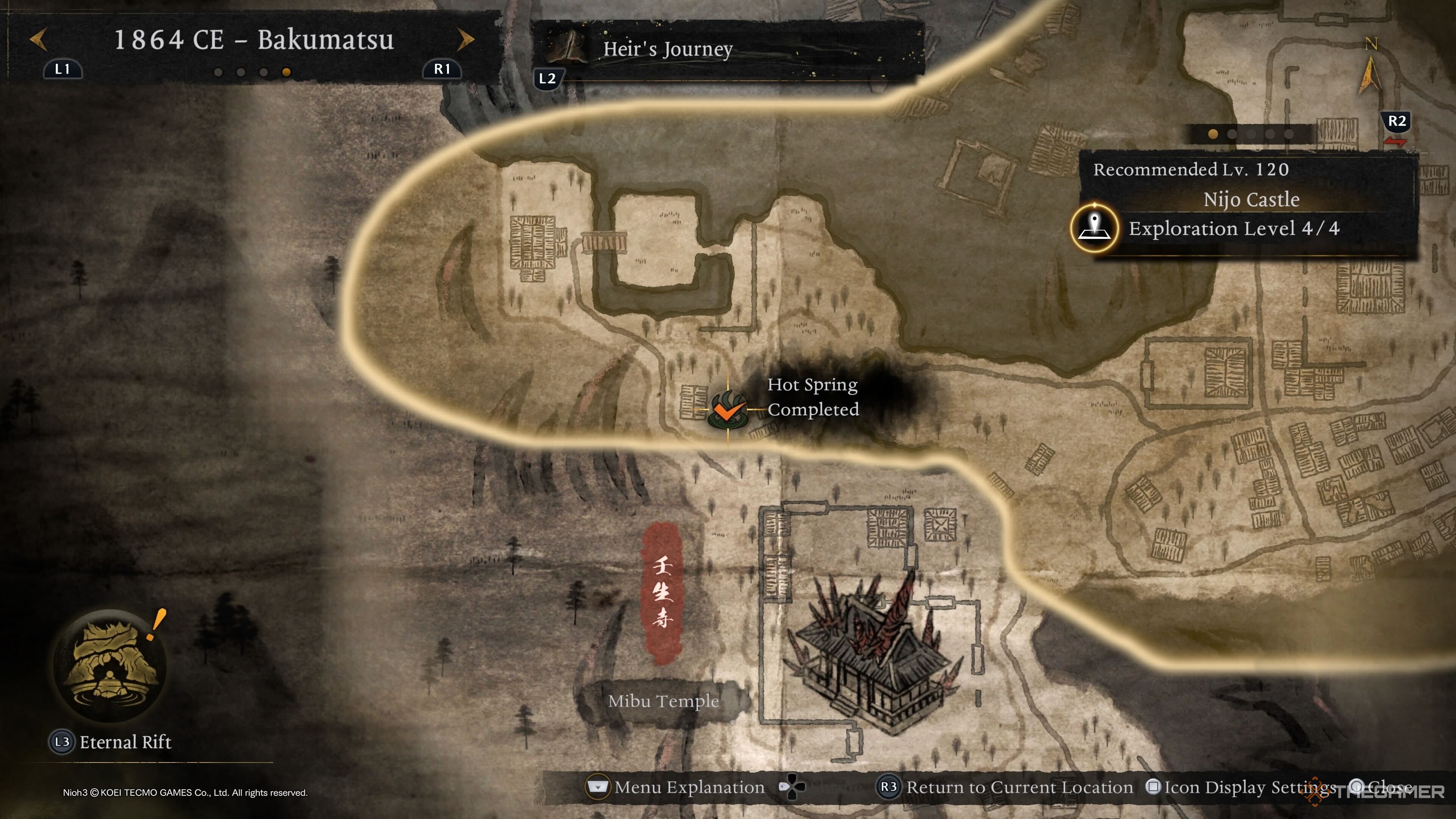 Добраться до горячих источников замка Нидзё может быть непросто. Вы можете либо быстро спрыгнуть с храма Мибу — Главные ворота, либо вам придется появиться на рынке Хорикава и пробиться сквозь нескольких врагов, чтобы добраться туда.