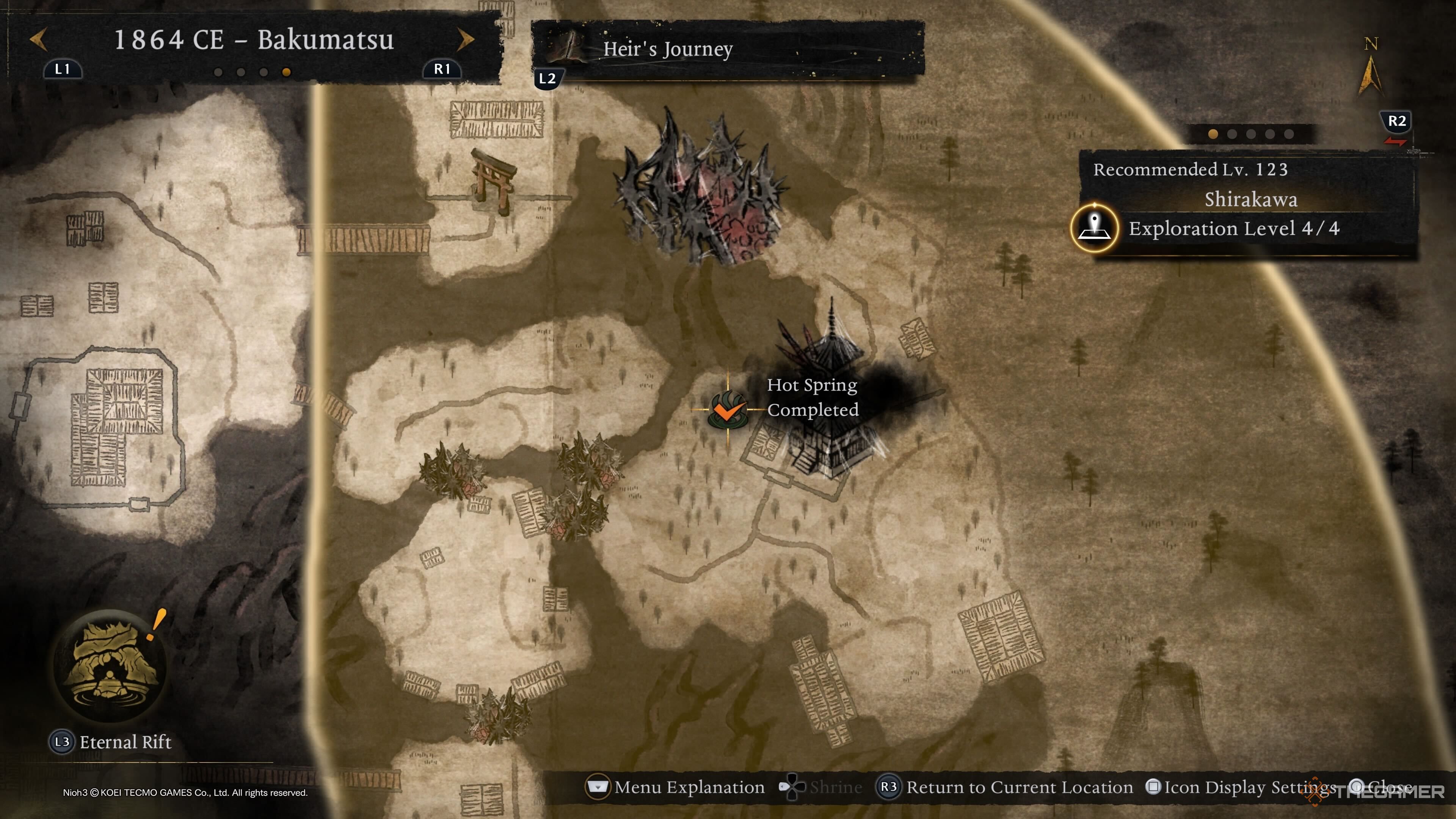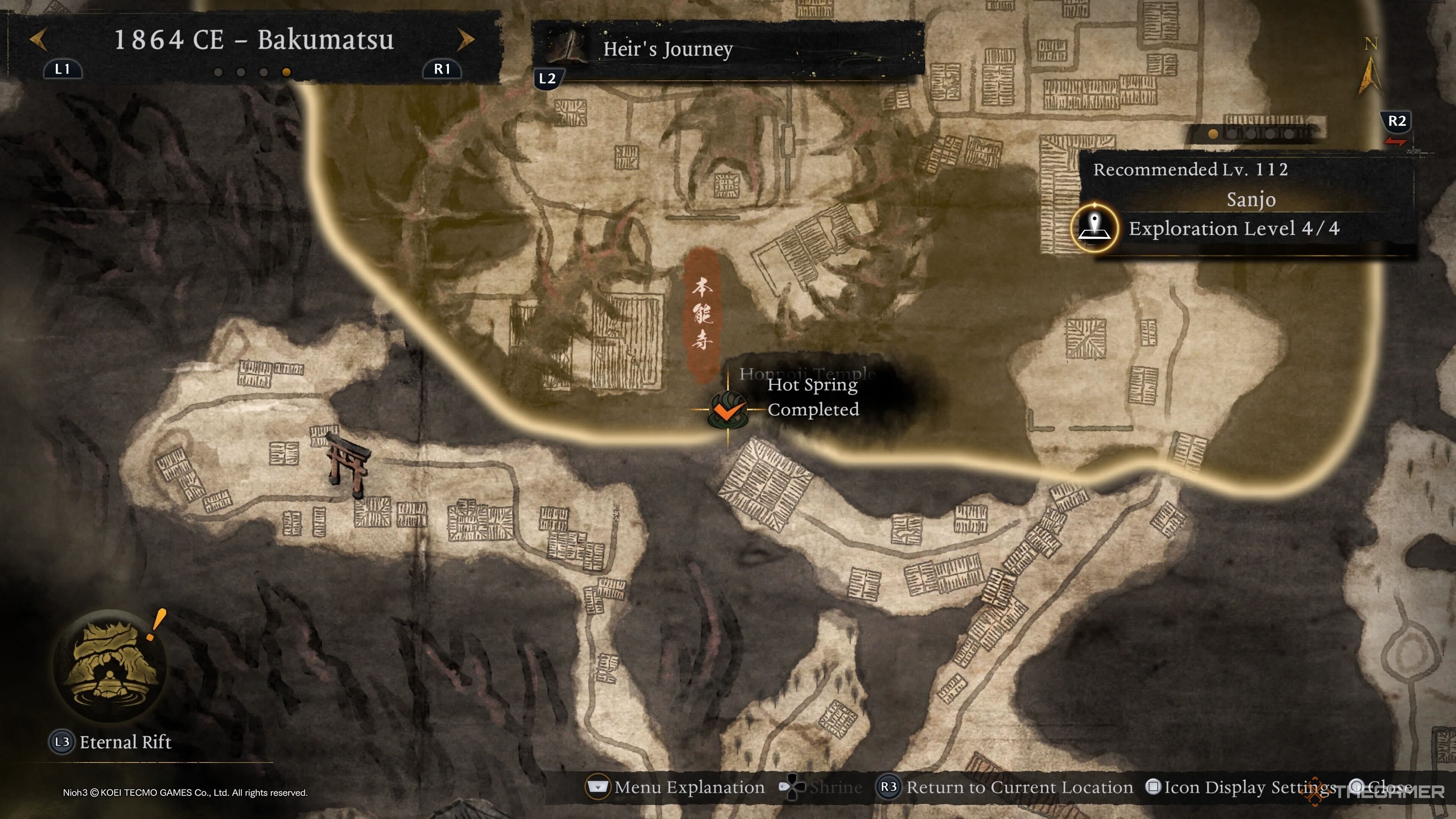 Последняя горячая весна в Nioh 3 находится в Императорском дворце Киото, но вы можете получить к ней доступ только во время прохождения миссии ‘Scion of the Gods’. Если вы не нашли её тогда, вам нужно будет переиграть эту миссию. Горячая весна находится недалеко от Императорского дворца — святилища Grounds Shrine, но вам нужно продвинуться дальше по уровню, чтобы обойти и открыть дверь за святилищем. После этого используйте Spirit Vein, чтобы подняться вверх, а затем преодолейте Nurikabe, чтобы добраться до горячей весны.