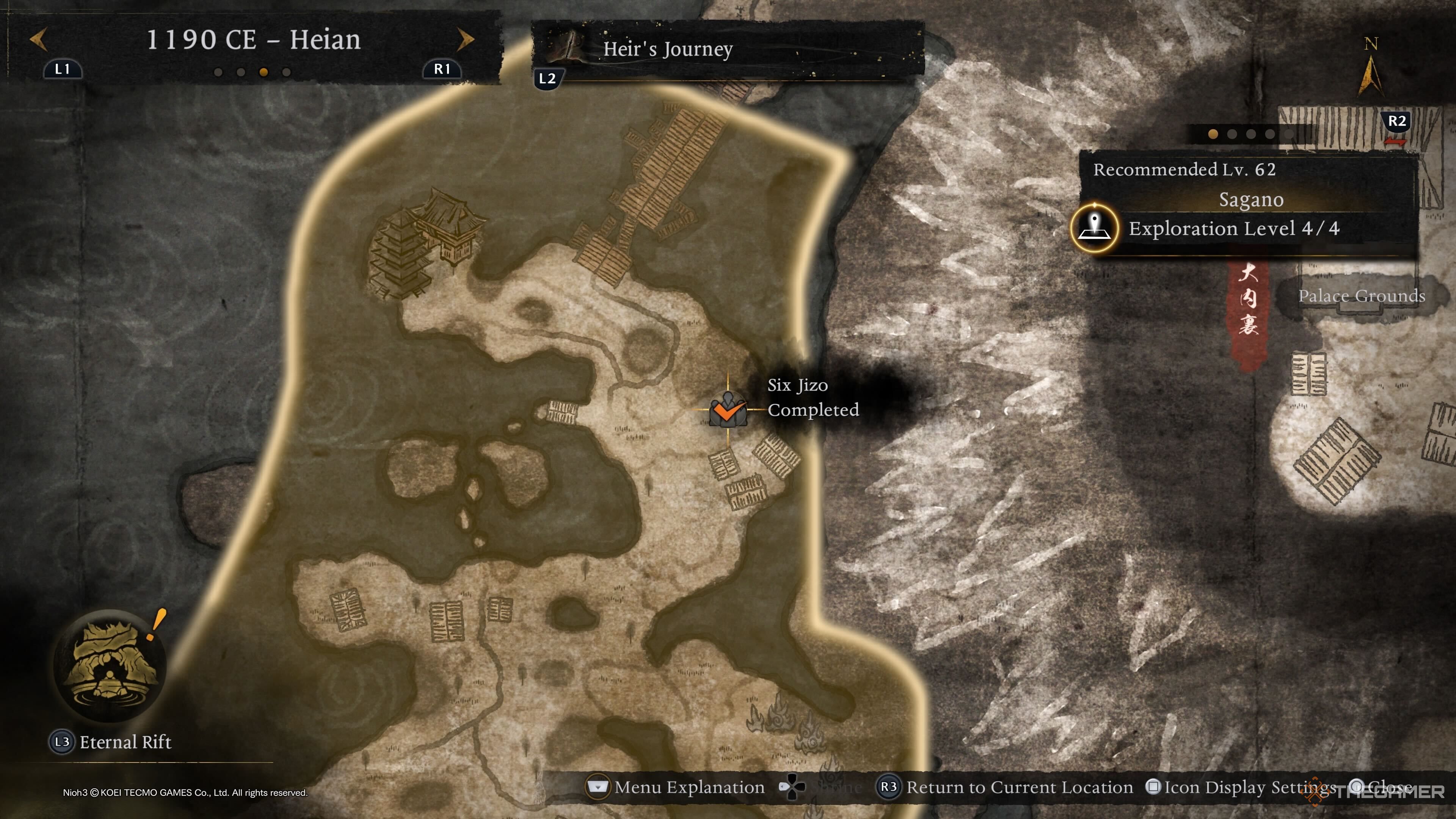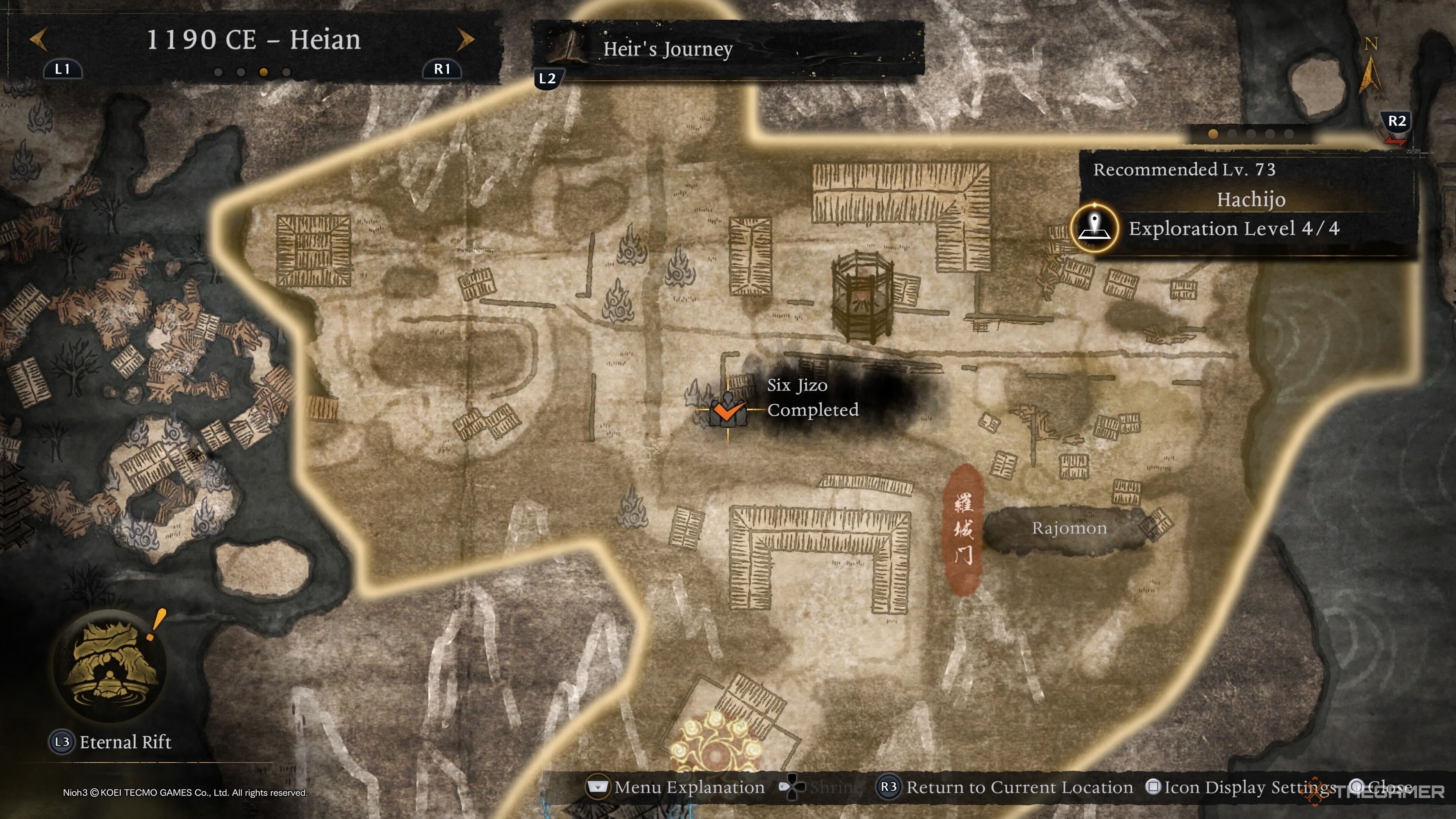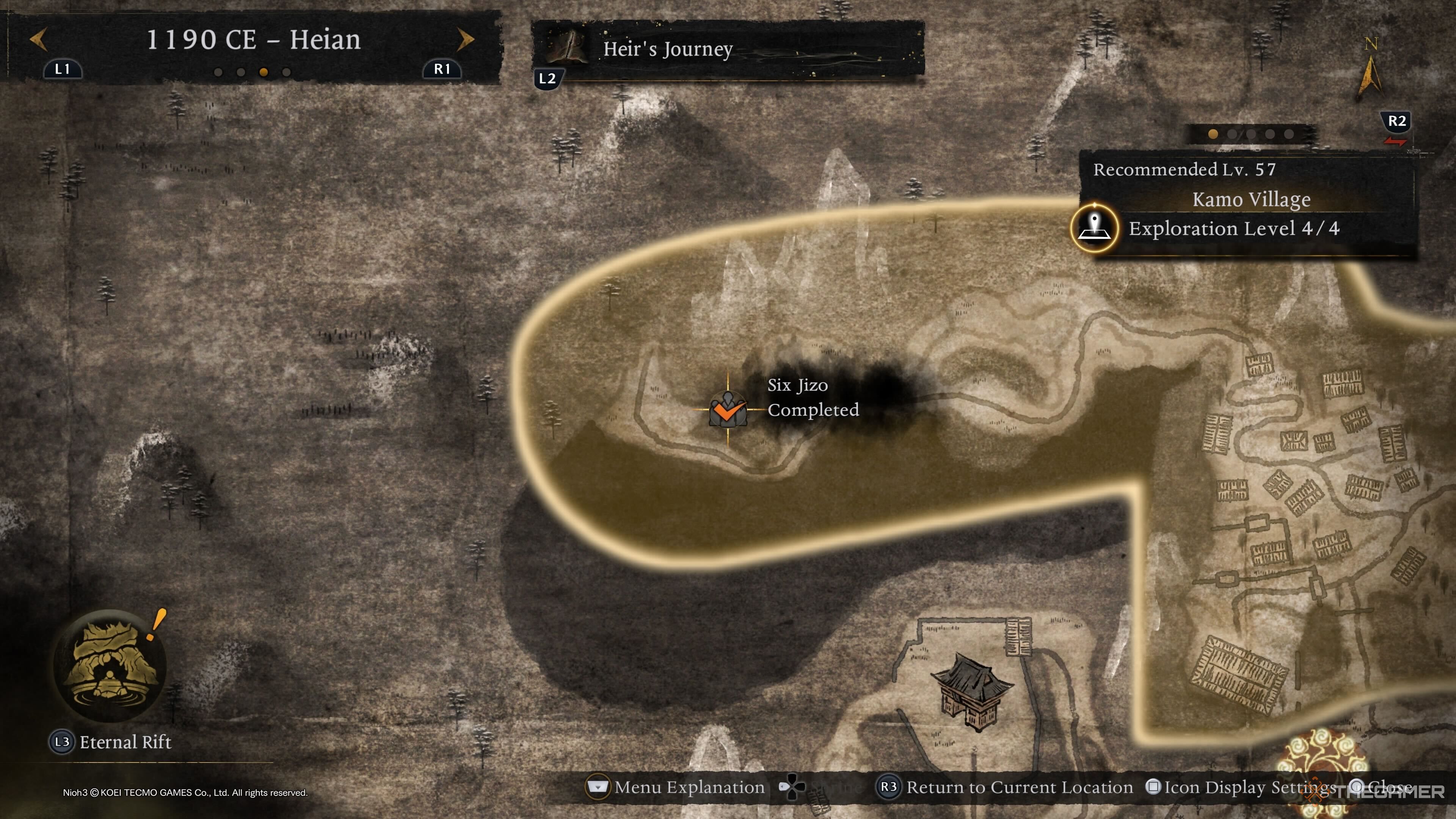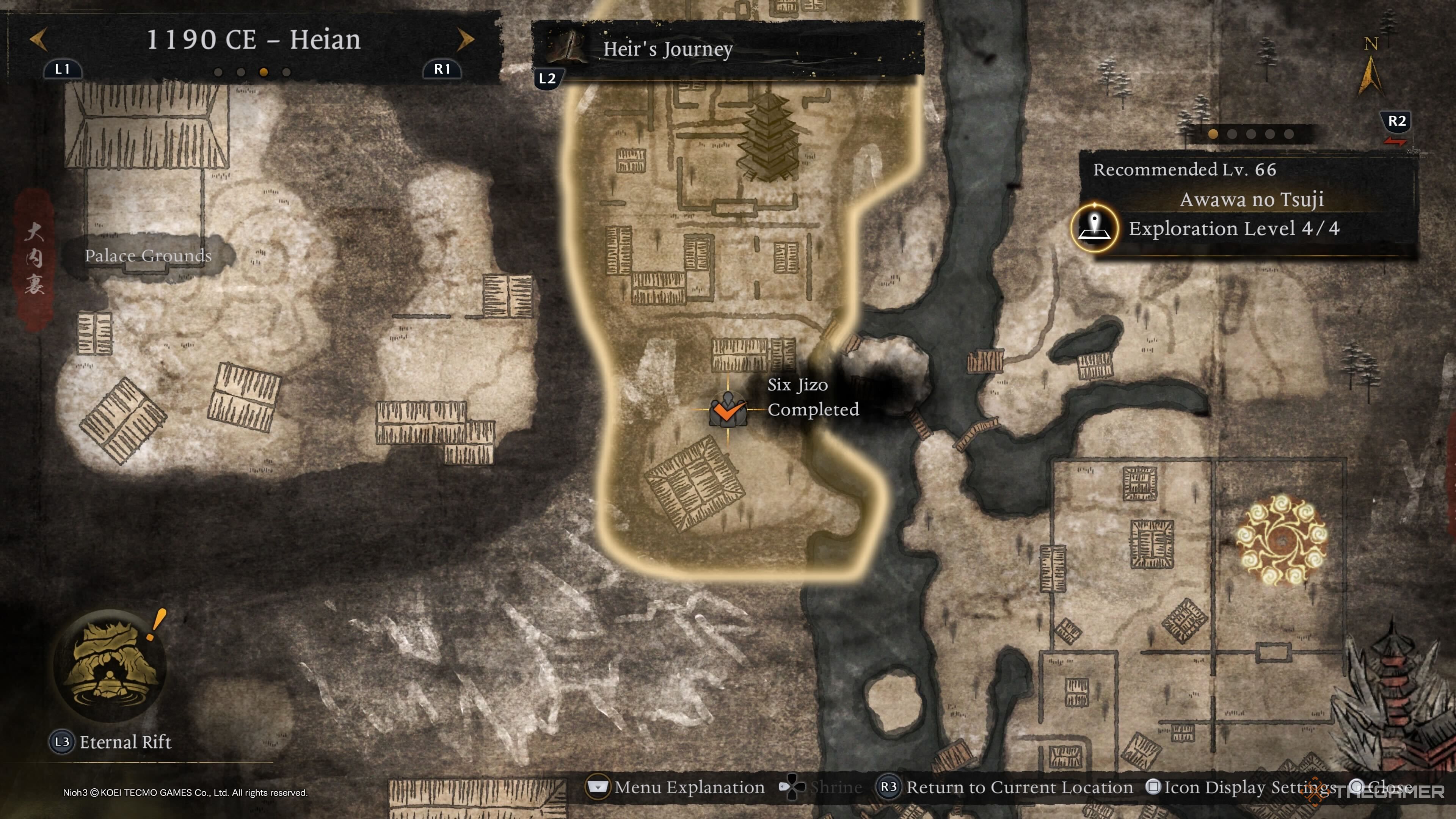 Первые шесть Дзизо в Хэйане легко найти, так как они появляются в начале локации. Вместо того, чтобы приближаться от первой Святыни, начните с появления в деревне Камо. Там повернитесь и следуйте по тропинке вверх и направо. Эта тропинка использует Духовную Вену, чтобы помочь вам подняться. Продолжайте по тропинке, пока не дойдете до следующей Духовной Вены, которая приведет вас прямо к Шести Дзизо.