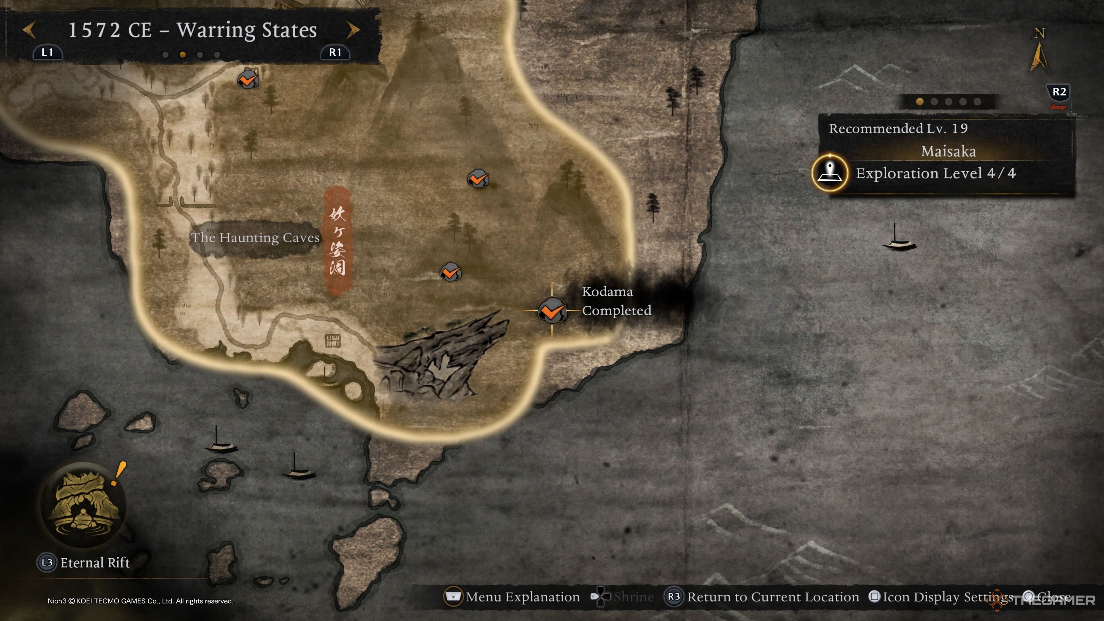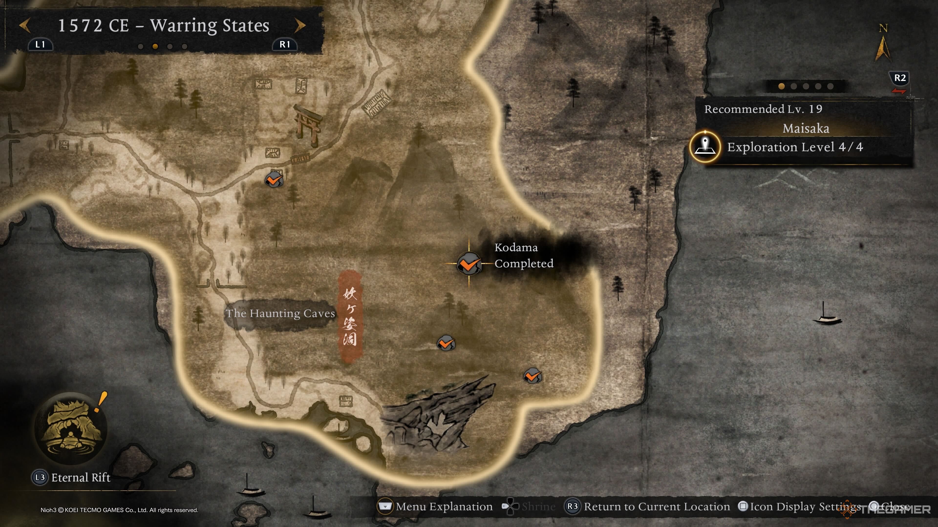 Привыкайте к этому, но второй Кодама из Маисаки находится в Пугающих Пещерах. Сразу после святилища Палаты Просветления идите вперед и присядьте под камень. Затем прыгните вправо, и вы найдете Кодаму прямо над собой. |