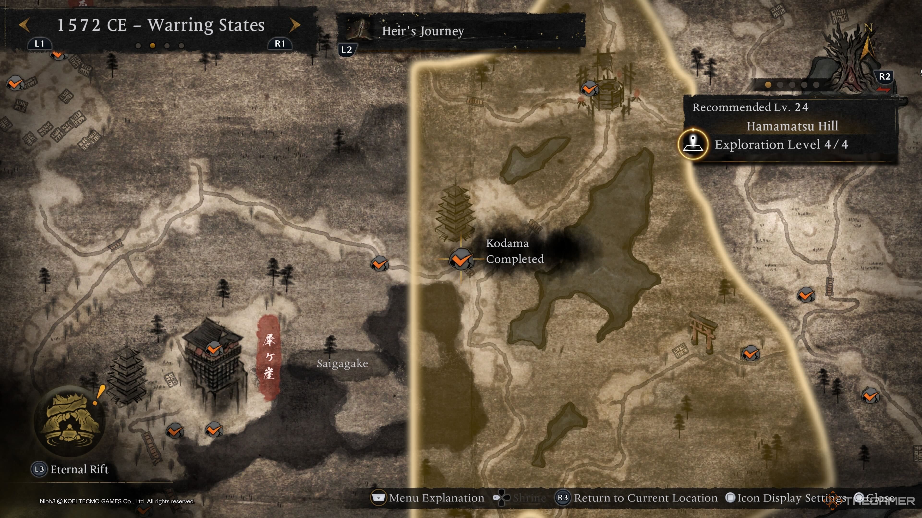 Сайгака — место, где вы найдете следующих Кодам. Тот, что показан на карте выше, можно найти сидящим на вершине ворот, хотя вам придется немного полазать и добраться до Главного Зала Святилища, прежде чем вы сможете помочь ему вернуться домой. |