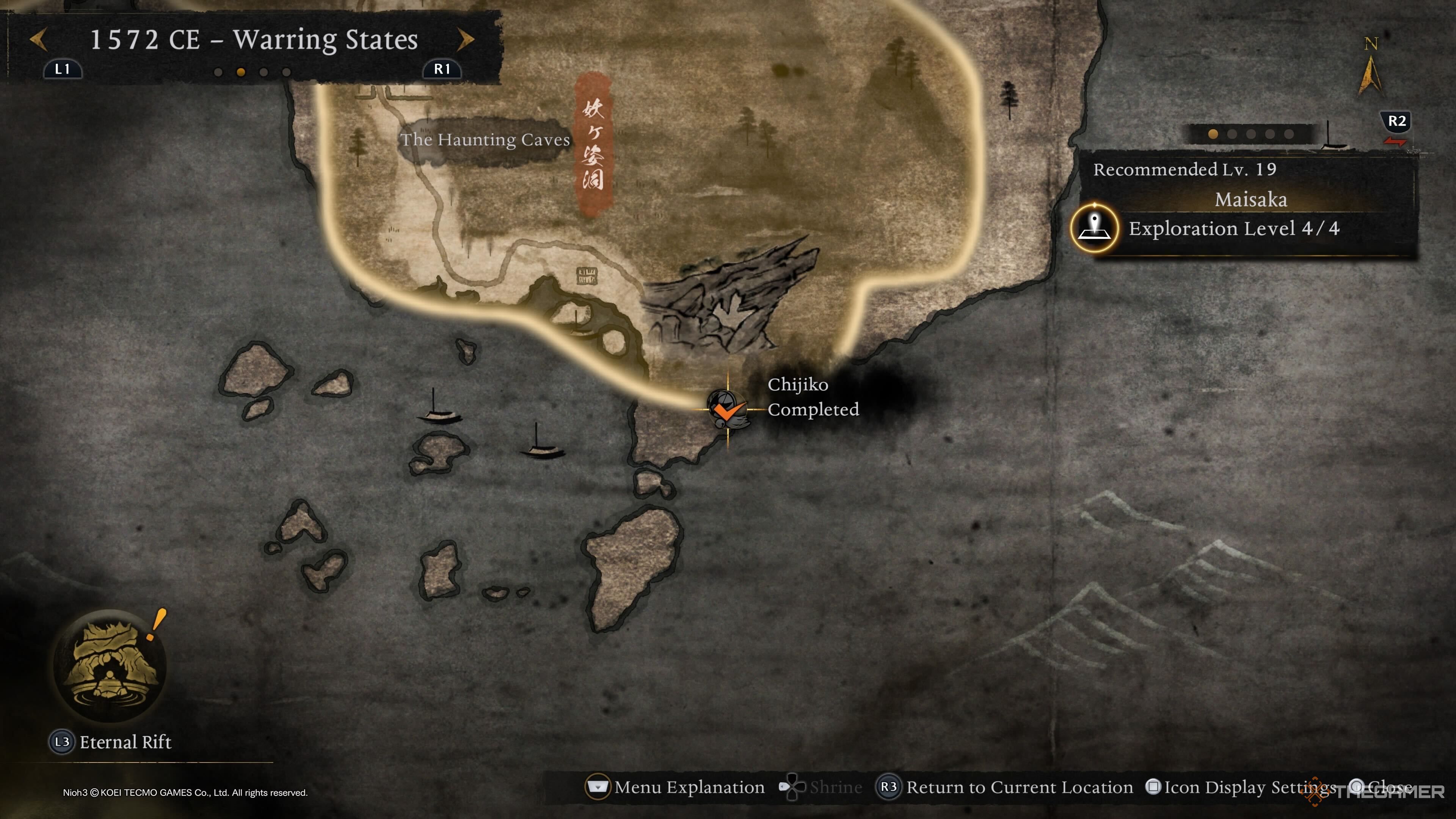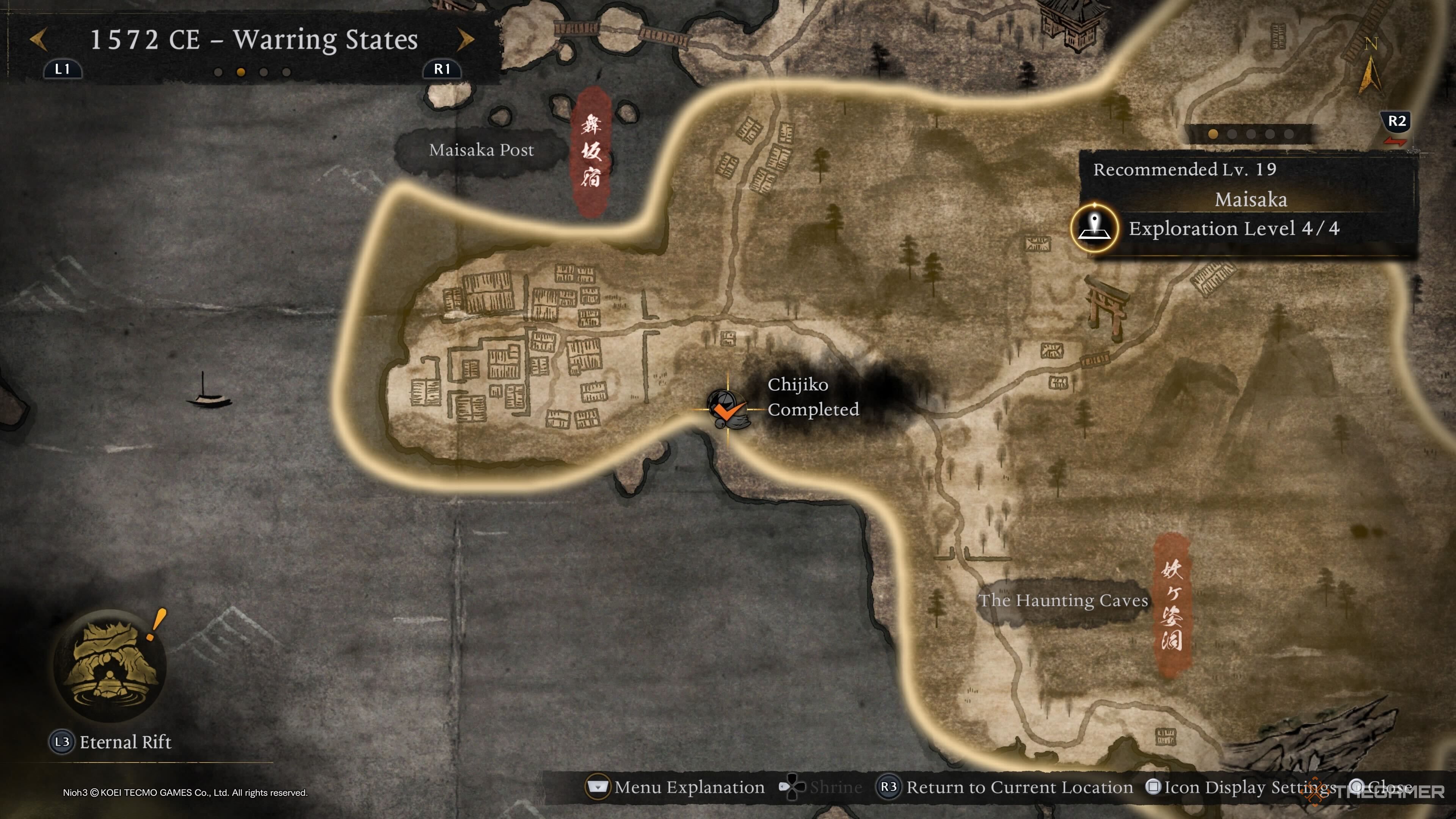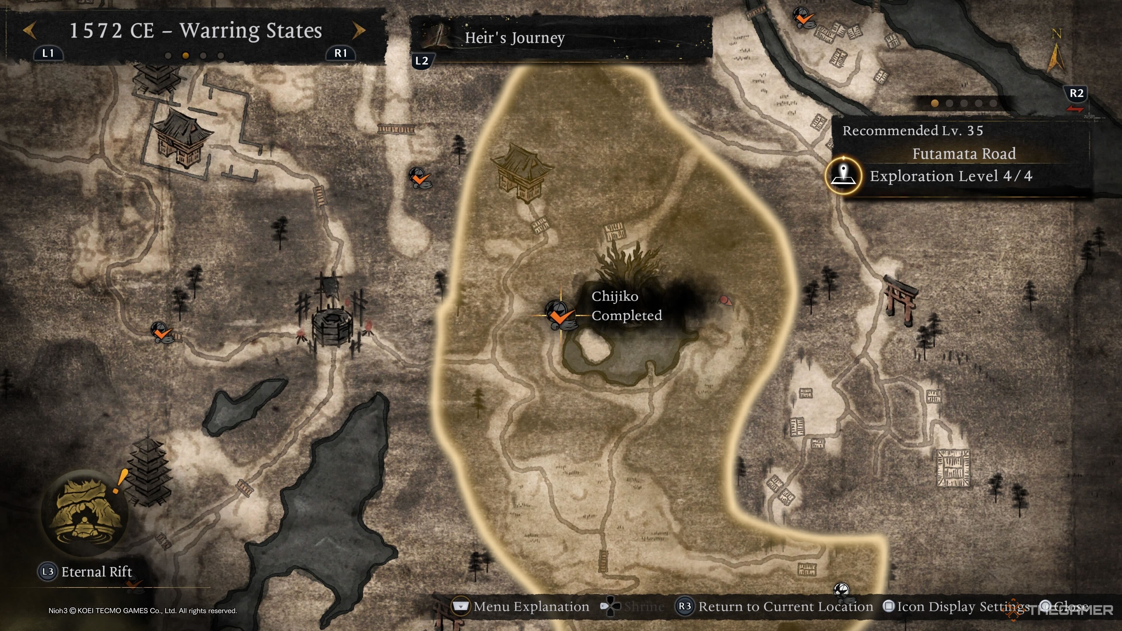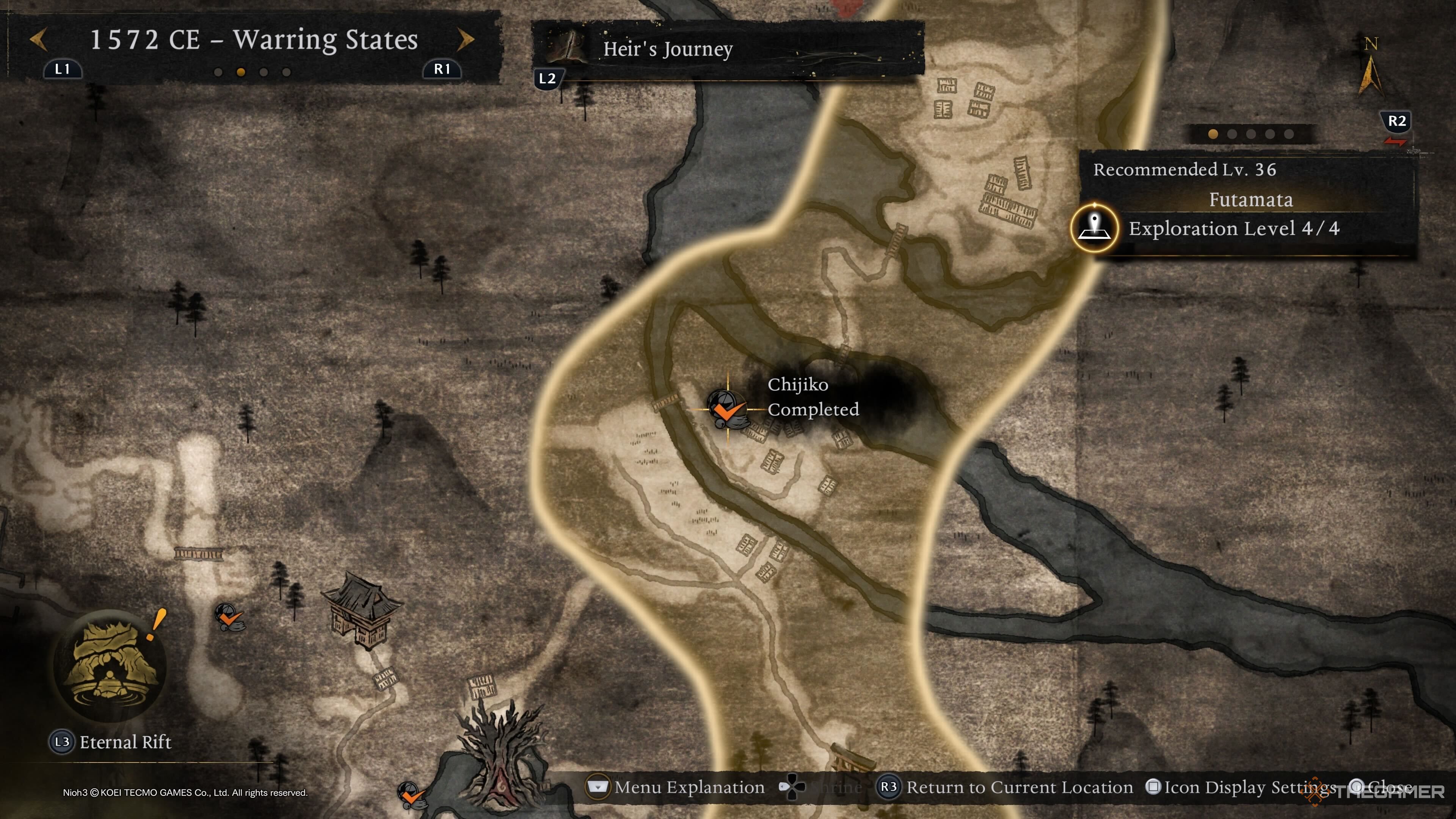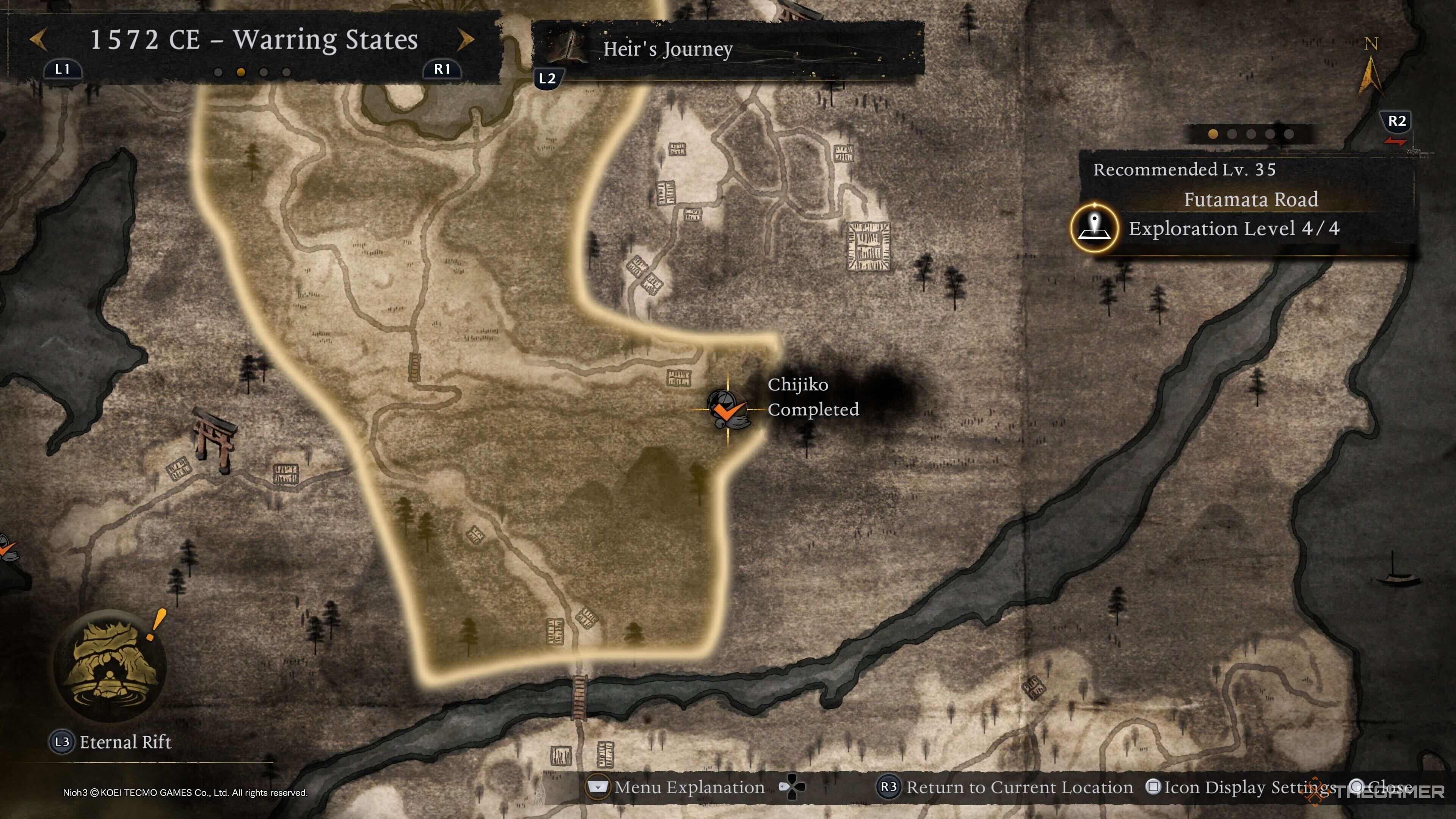 Вы найдёте последнюю Чиджико из периода Сэнгоку недалеко от замка Футамата — святилища Замкового Города. Когда вы туда доберётесь, перейдите через мост, и вы увидите Чиджико, что позволит вам перейти к следующей эпохе.