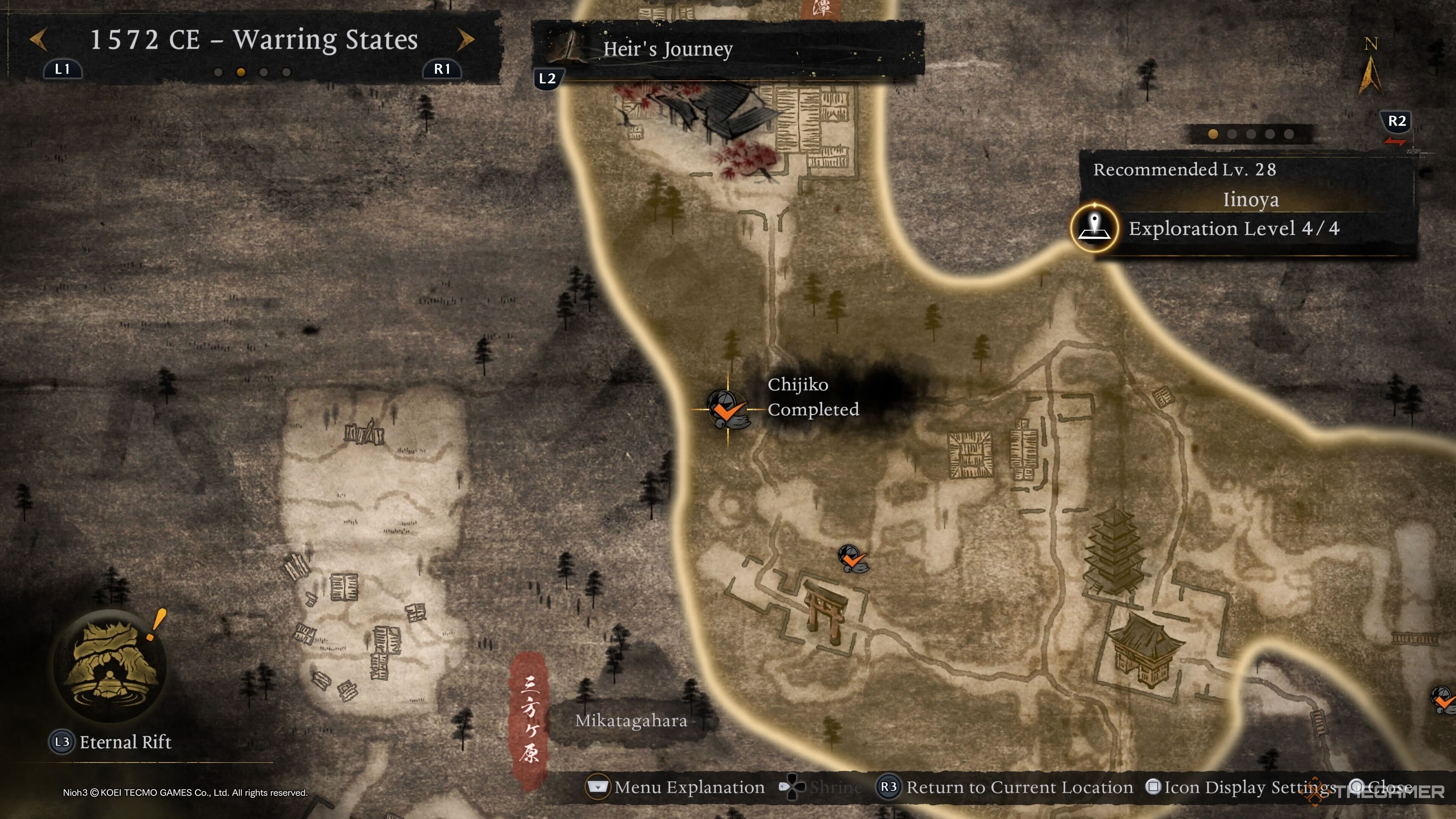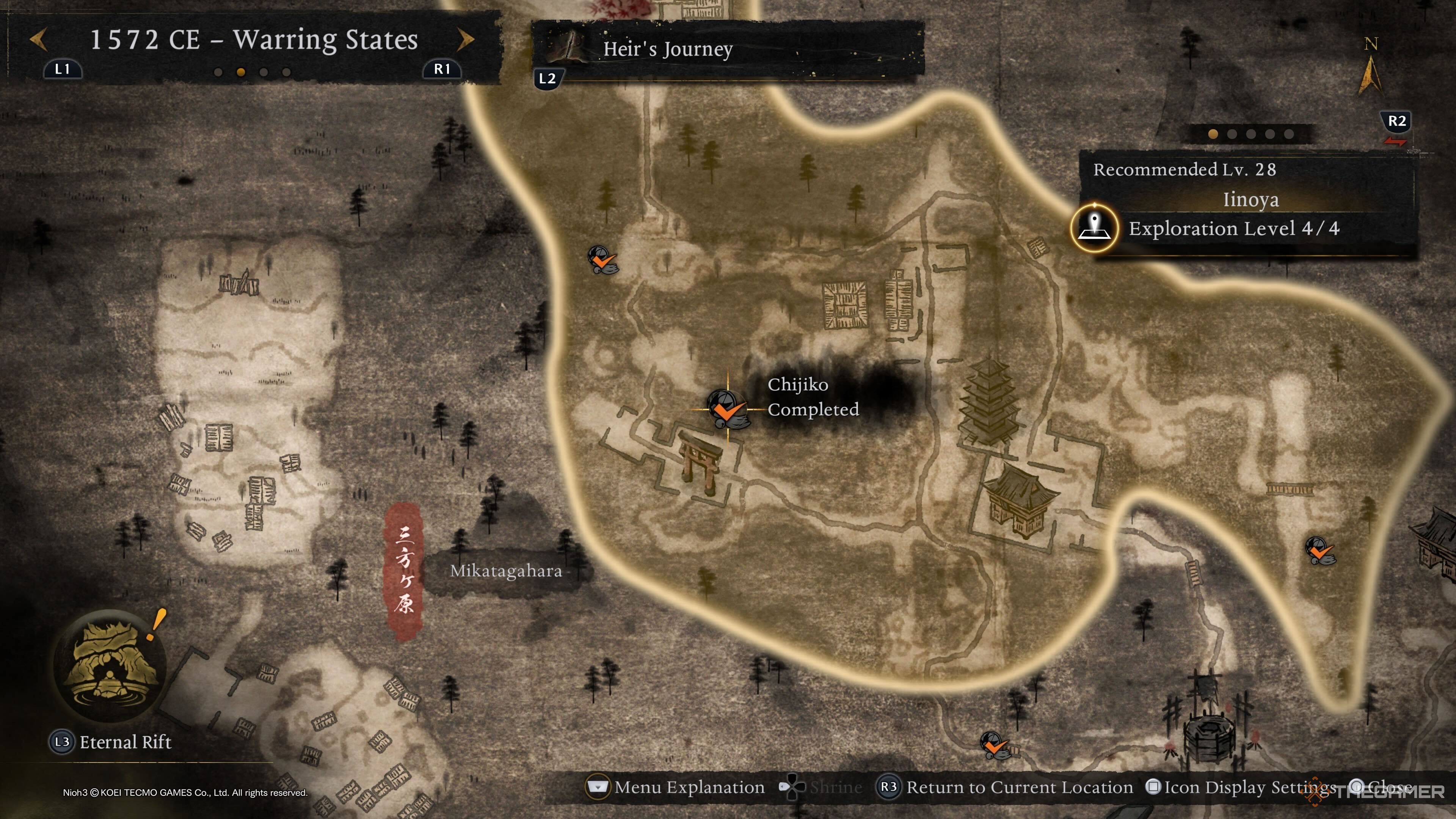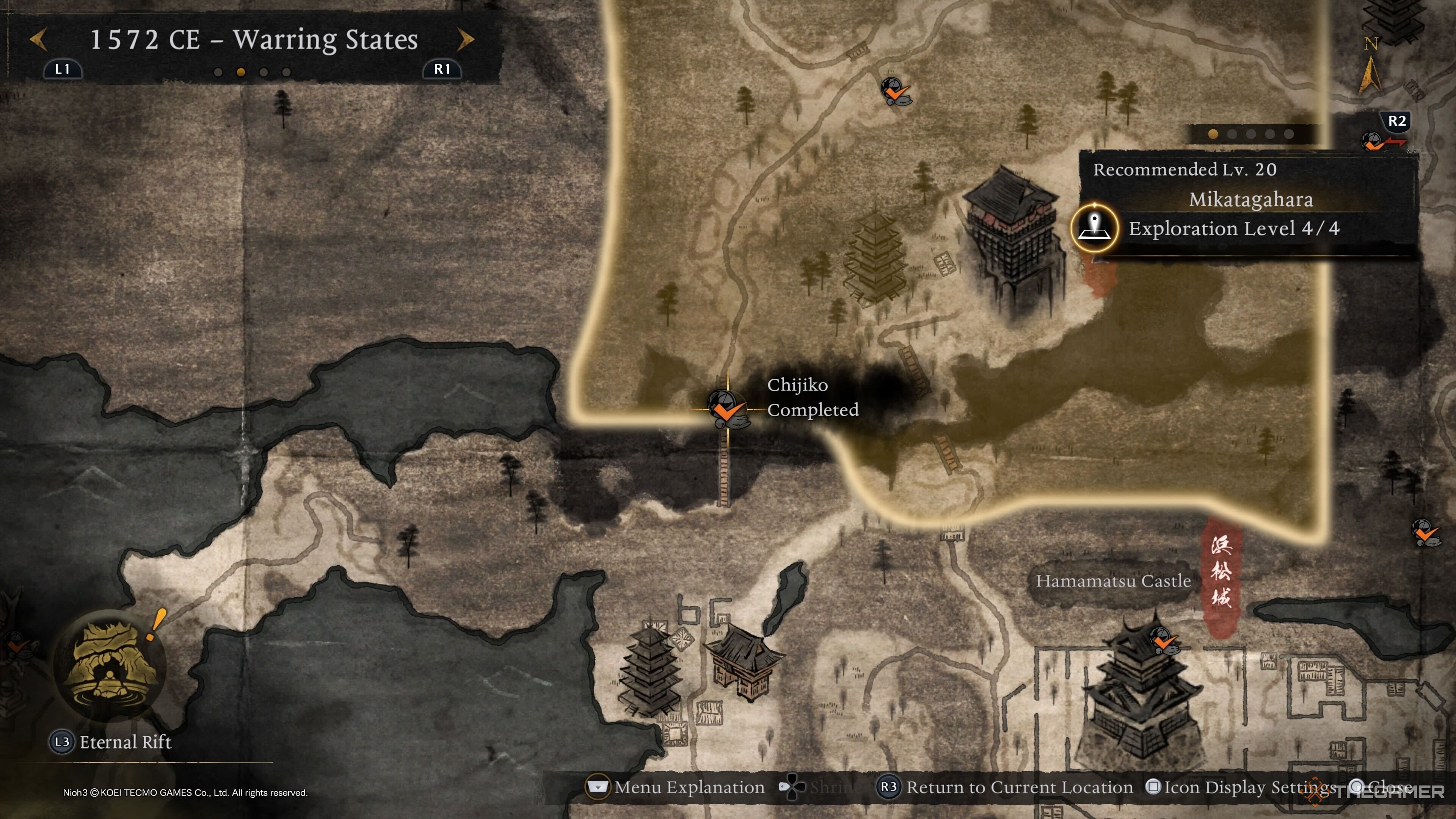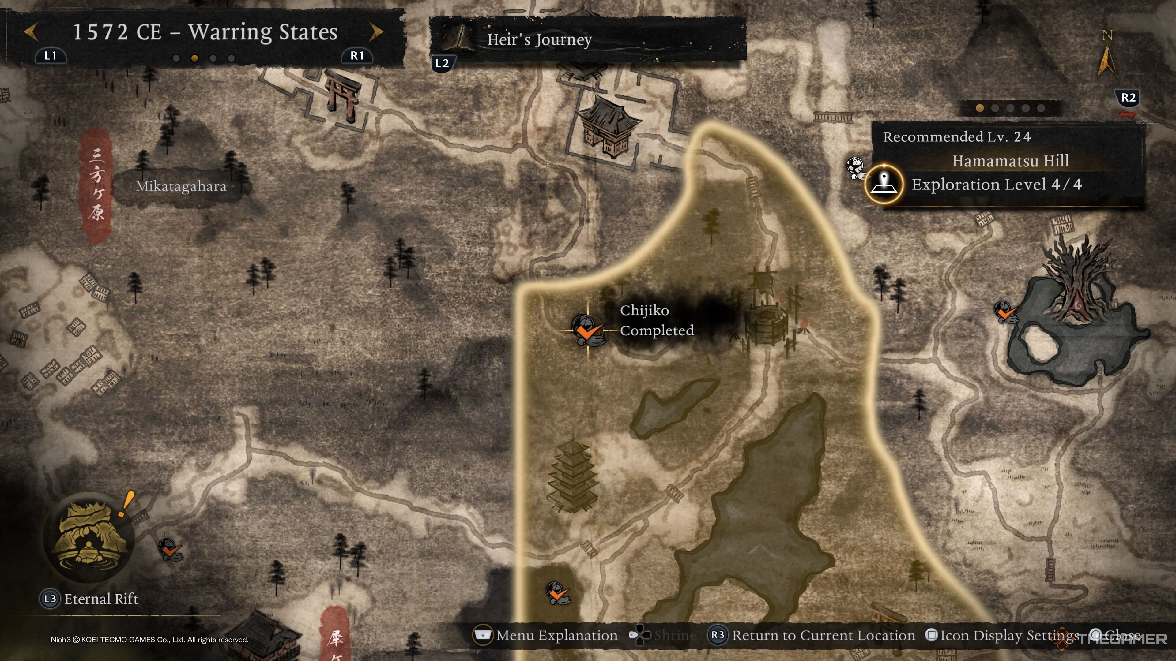 Последнего Чиджико Микатгахары можно найти рядом с вражеской базой, расположенной недалеко от святилища Токугава. Оттуда направляйтесь к маркеру выше, чтобы получить вид сверху и легче увидеть Чиджико. |