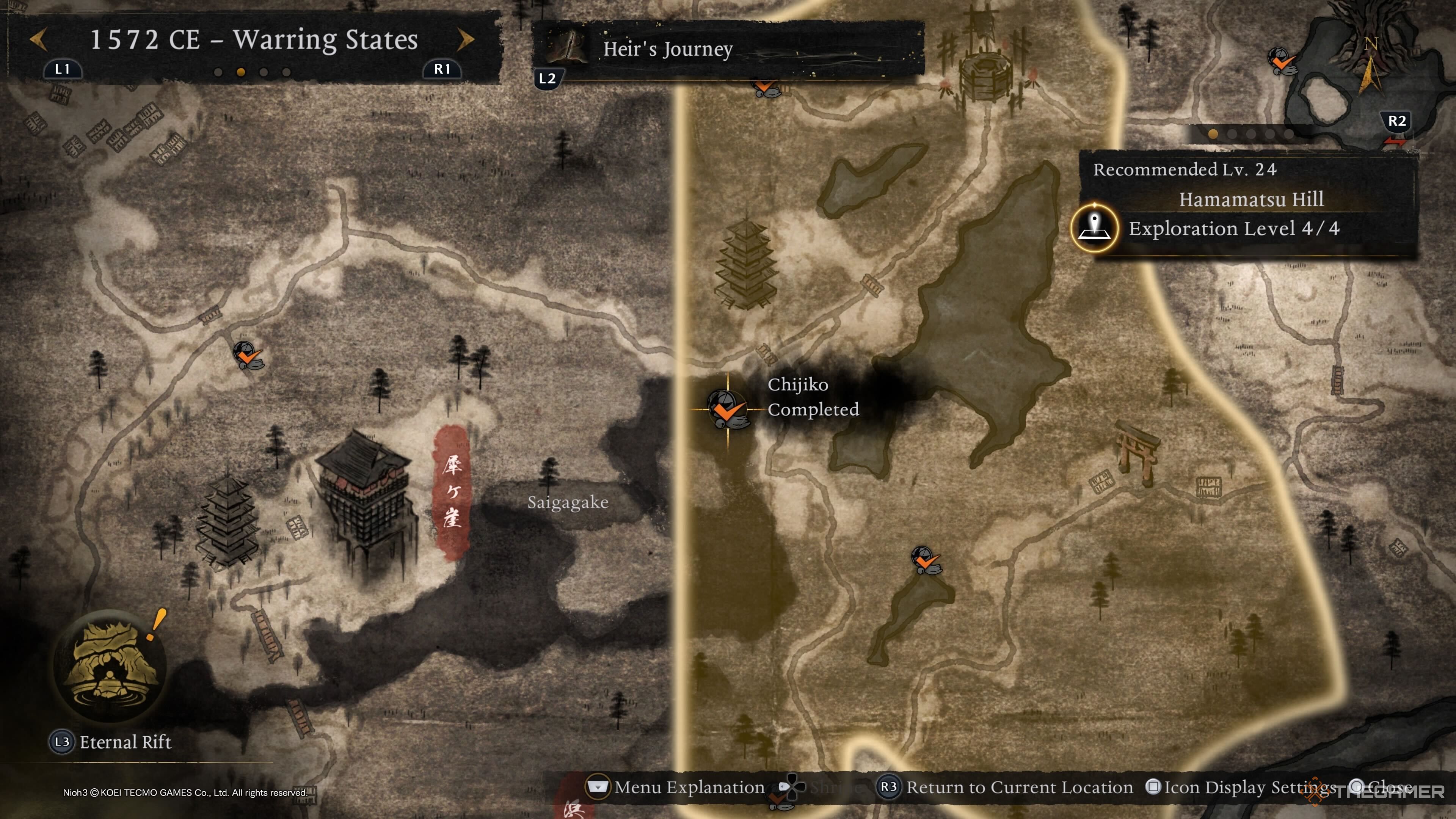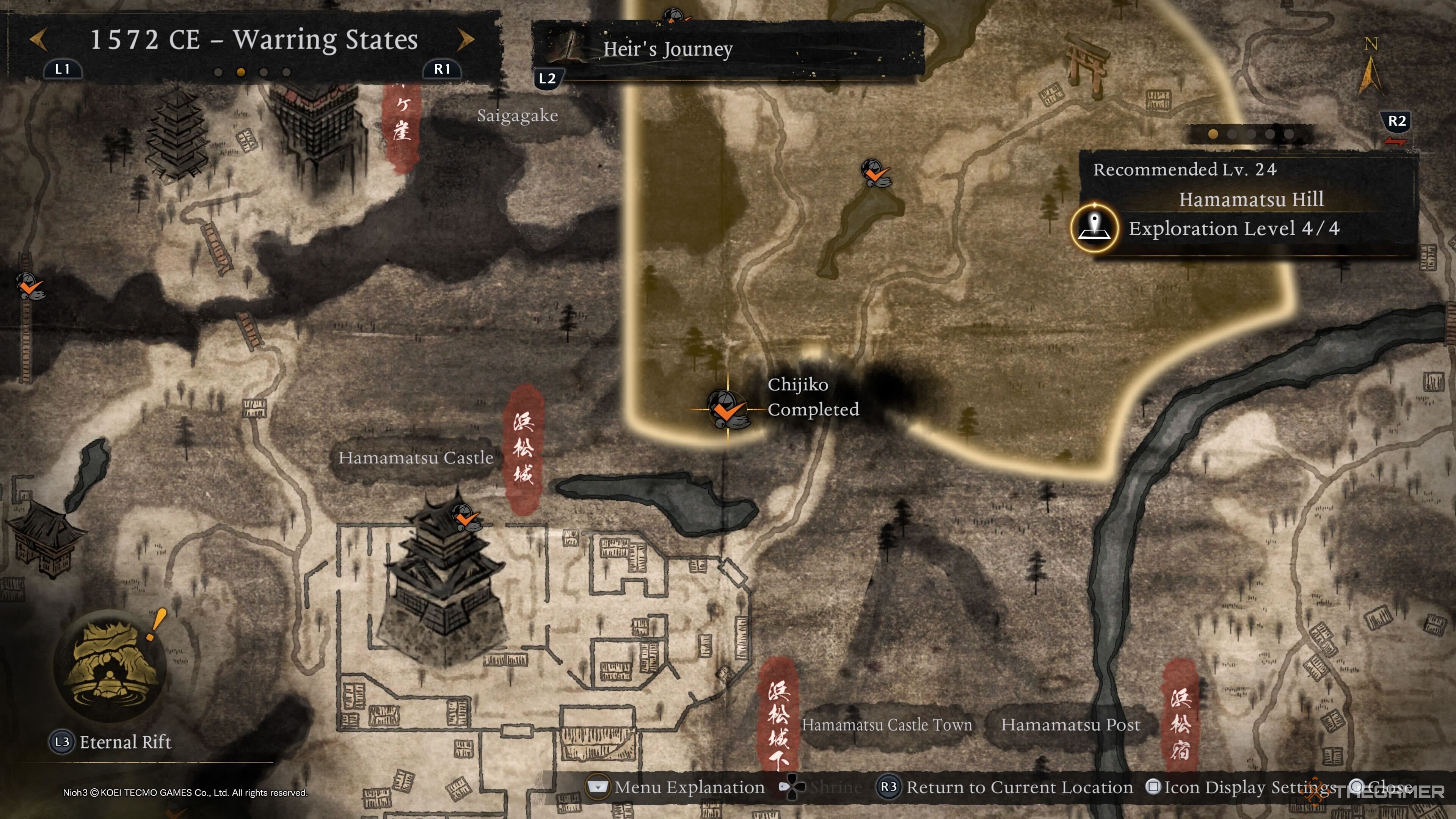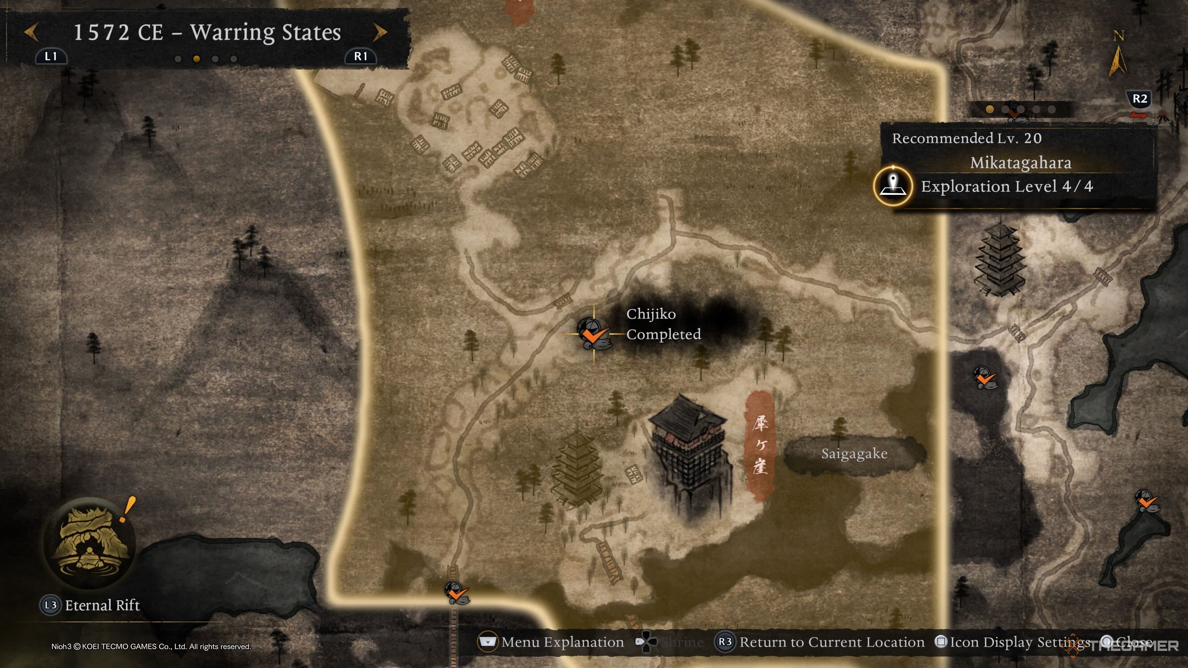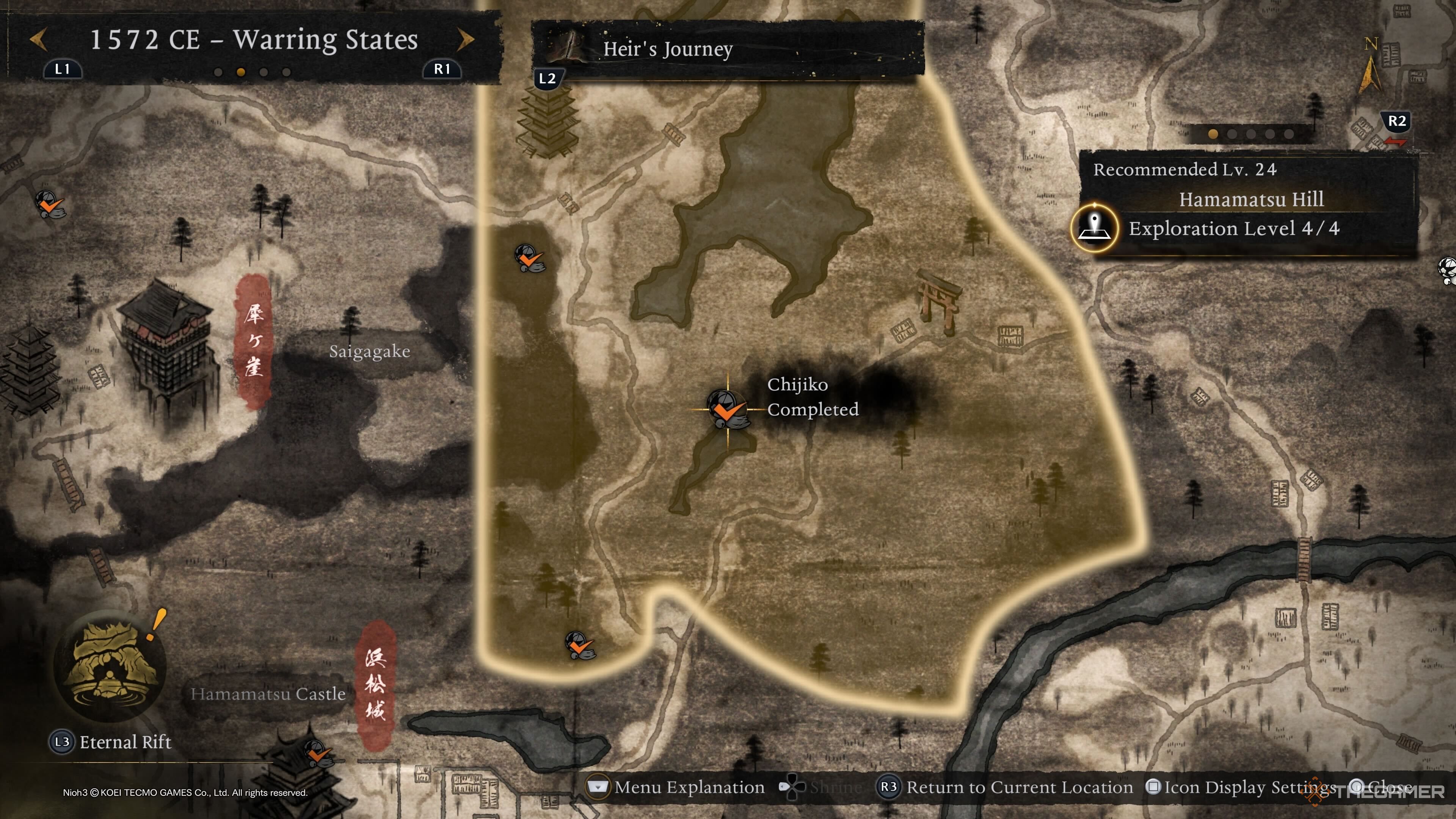 Последнего Чиджико Микатгахары можно найти рядом с вражеской базой, расположенной недалеко от святилища Токугава. Оттуда направляйтесь к маркеру выше, чтобы получить вид сверху и легче увидеть Чиджико. |