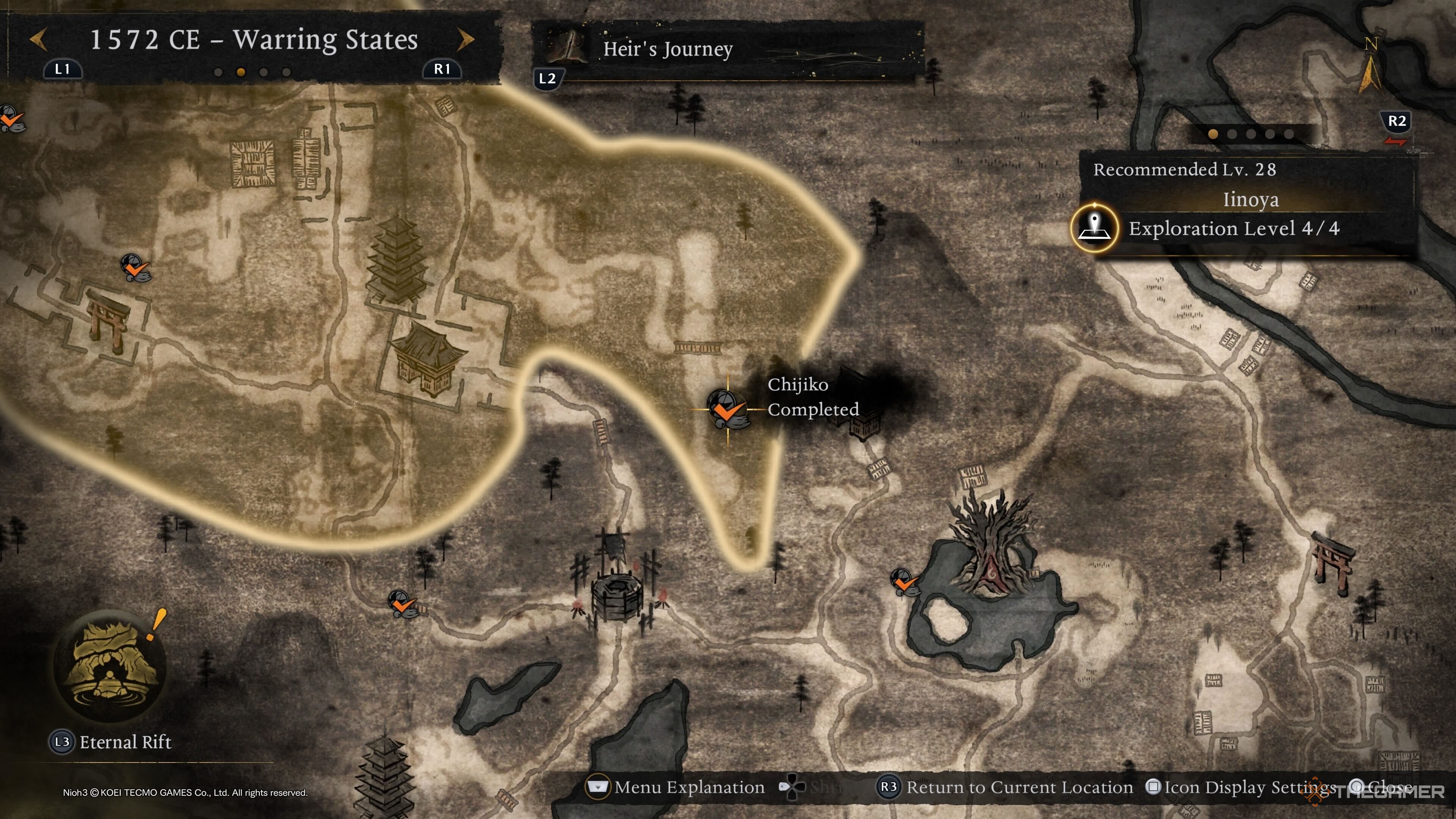 Третья и финальная Ииноя Чиджико находится довольно далеко от святилища Омомидзи. Пройдите по длинной тропе, полной врагов, пока не дойдете до обрыва, где вы легко сможете заметить Чиджико. |